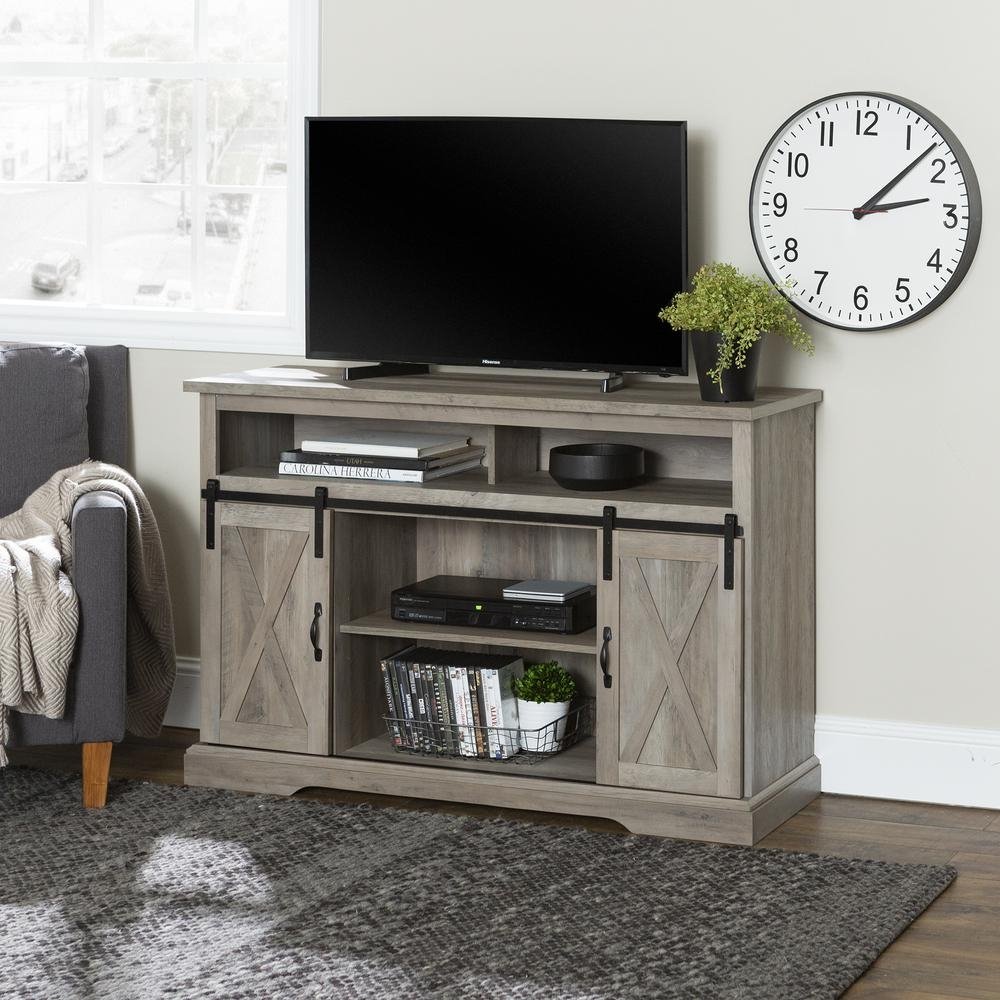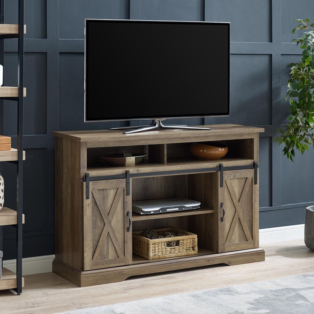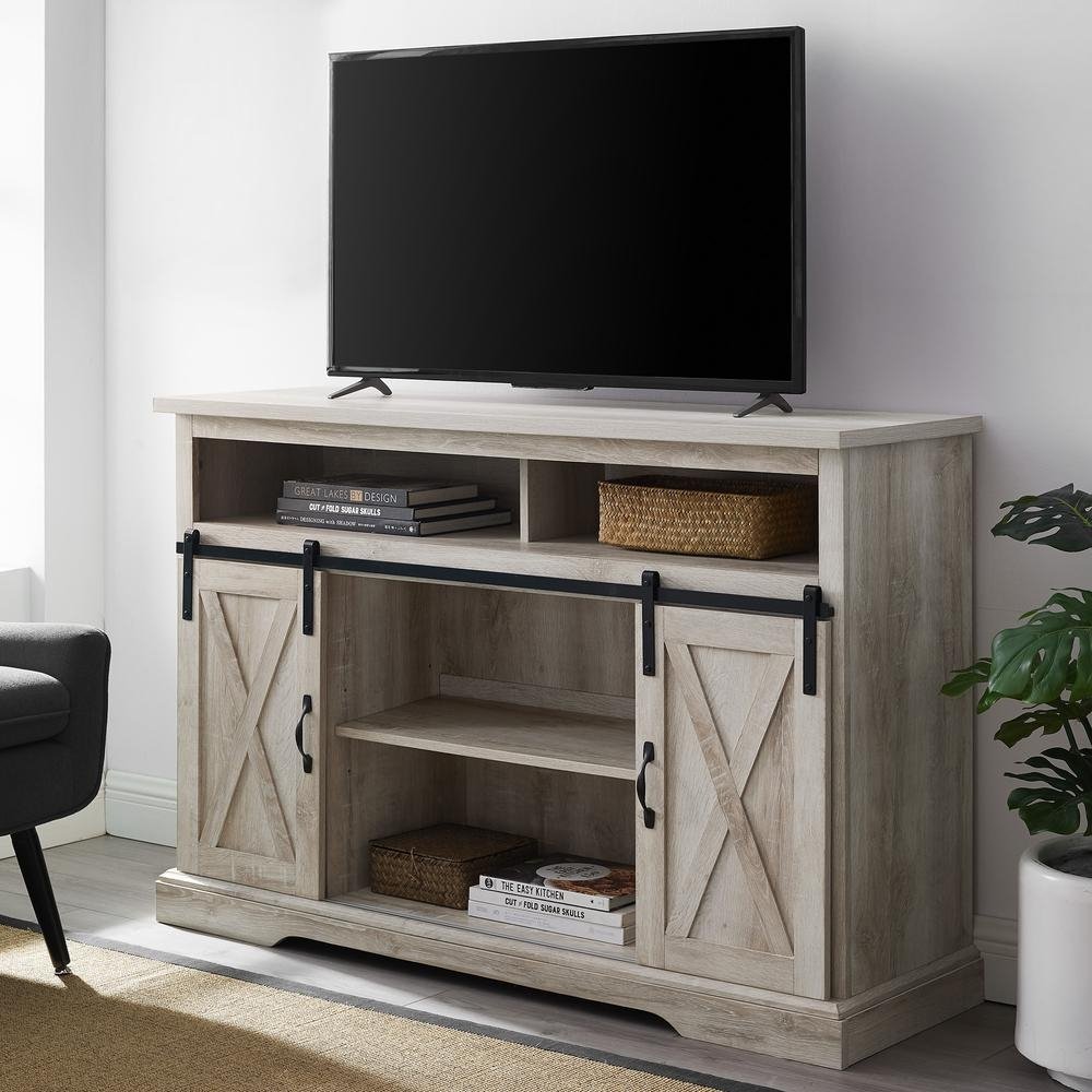 Design your home with the storage space you need by incorporating this 52-inch TV stand into just about any room. With a versatile design, this TV stand can be utilized not only as an entertainment center in your living room, but as either a buffet in your kitchen or a storage cabinet in your bedroom. With plenty of storage space provided, from the open shelving and closed shelving with sliding barn cabinet doors. Position the sliding doors in the center or sides, with your media, electronics, accessories, glassware, or decor on the shelves. Including adjustable shelves and cord management to keep your room essentials organized and in one spot. Crafted of high-grade MDF, durable laminate, and metal for a modern farmhouse and traditional style. Can fit up to a 56-inch TV.