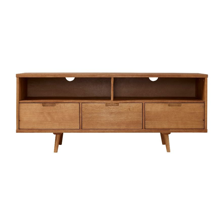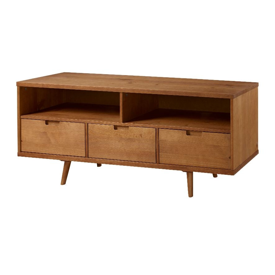 With slightly tapered legs, this 58-inch TV stand features a mid century modern silhouette to complement your home's aesthetic. Crafted of solid pine wood to showcase a beautiful, natural grain stained finish for a warm texture to your living room. With three easy to access drawers featuring cutout handles, two open shelves above, and cord management to organize your electronics. This TV stand can also be incorporated in your bedroom as a storage cabinet or in your kitchen as a buffet due to its versatile design. Providing additional storage space in your home for the essentials you love most, from your favorite movies to your book collection and family photos. This entertainment center can fit up to a 64-inch TV.