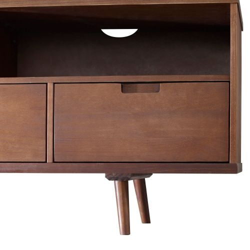 With slightly tapered legs, this 58-inch TV stand features a mid century modern silhouette to complement your home's aesthetic. Crafted of solid pine wood to showcase a beautiful, natural grain stained finish for a warm texture to your living room. With three easy to access drawers featuring cutout handles, two open shelves above, and cord management to organize your electronics. This TV stand can also be incorporated in your bedroom as a storage cabinet or in your kitchen as a buffet due to its versatile design. Providing additional storage space in your home for the essentials you love most, from your favorite movies to your book collection and family photos. This entertainment center can fit up to a 64-inch TV.
