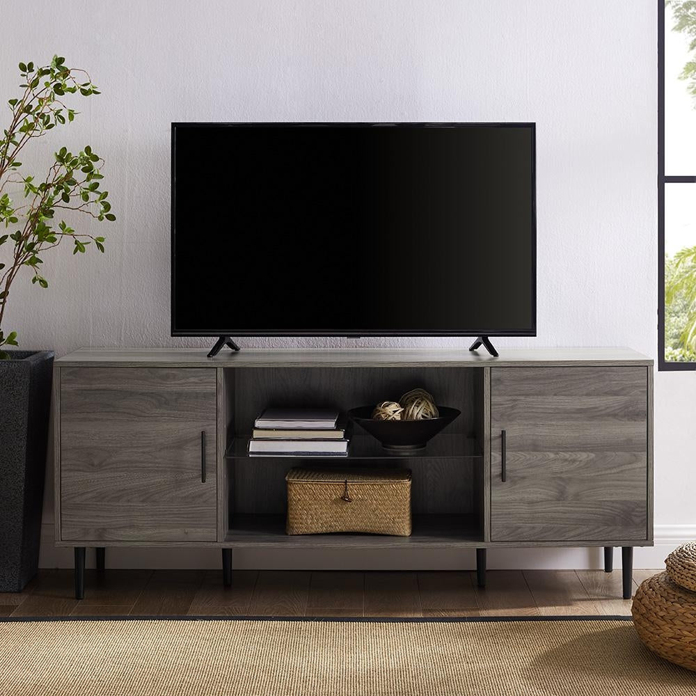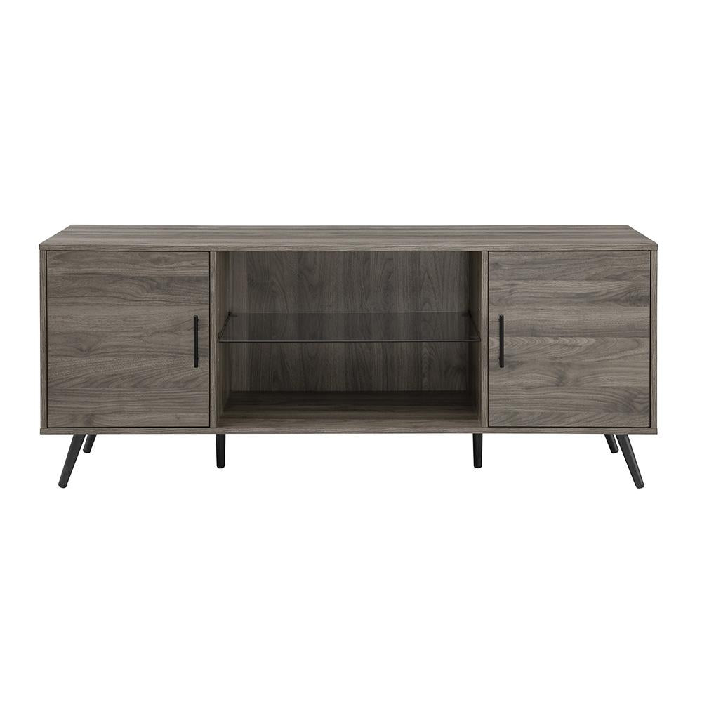 Slide into style with this versatile console. Designed with a mid-century aesthetic in mind the simplicity of this piece is also its strength. The center shelf is tempered glass, making the middle of the console uncomplicated and open to house anything from vinyl records to travel souvenirs. The two compartments on the side include adjustable shelving and cord management so your electronics can stay organized however you'd like. Plus, since they're tucked away behind closed doors it manages visual clutter. This modern entertainment stand also includes adjustable rubber feet to protect your floor.