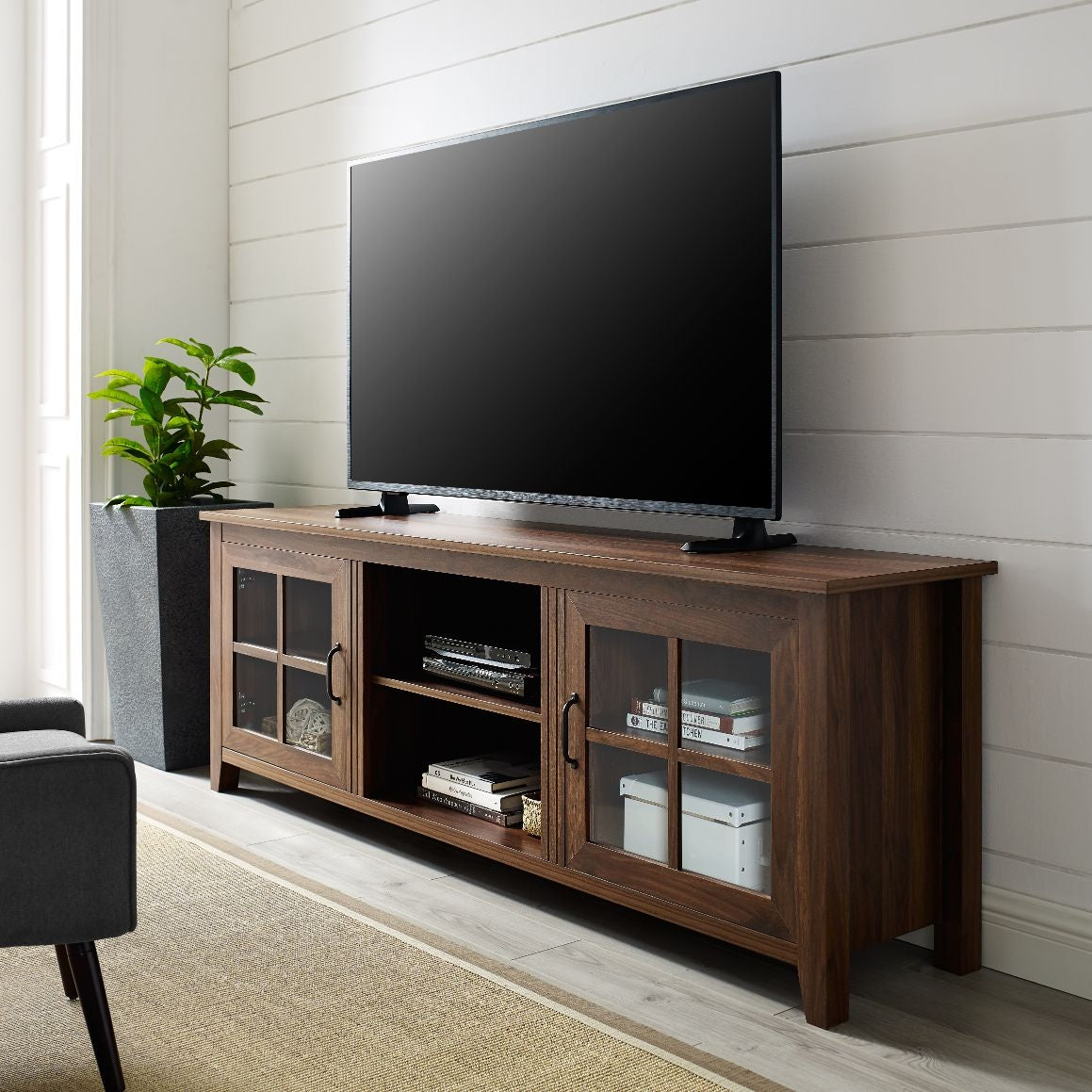 Showcasing window pane cabinet doors, this 70-inch TV stand has a stylish farmhouse appeal. With a high-grade MDF, durable laminate, tempered safety glass, and metal construction for a solid and sturdy design for storing your media, electronics, and more. Display decor or your book collection behind the glass pane doors with your electronics on the center open shelving. Including cord management and adjustable shelving for an easy fit for all of your items. This transitional and traditional entertainment center can hold up to a 78-inch TV for your living room or be used as a storage console in your bedroom for extra blankets, pillows, jackets, and shoes.