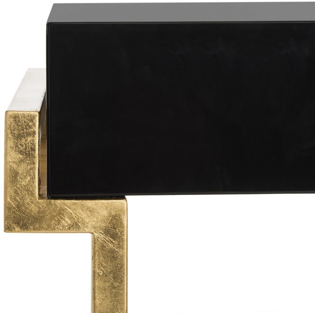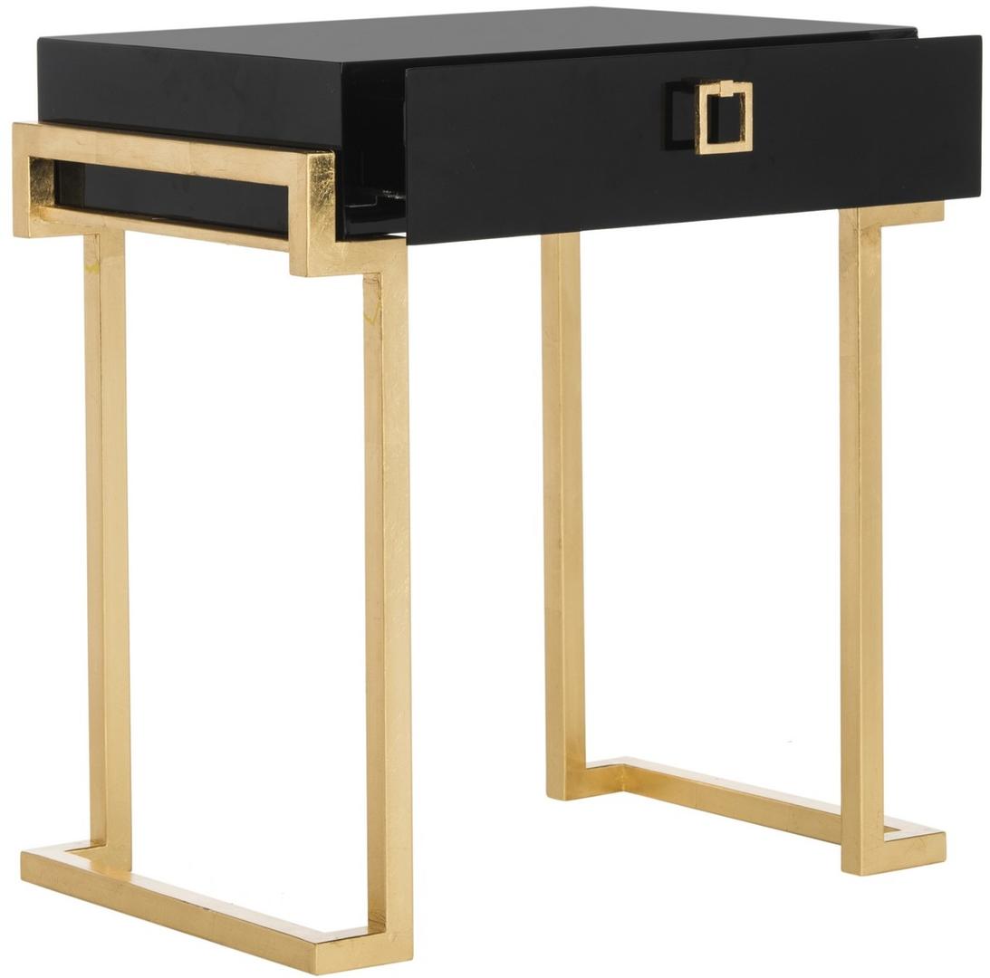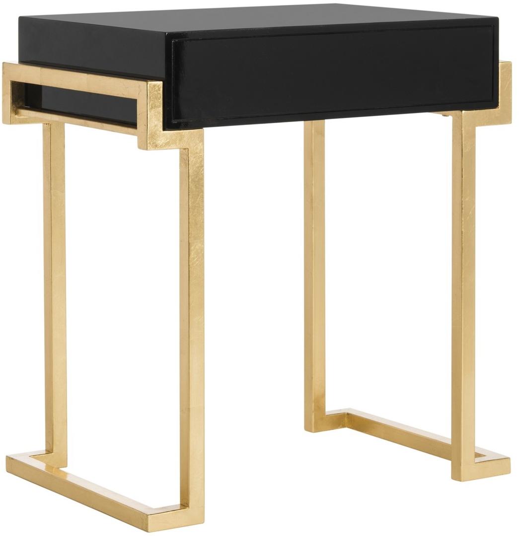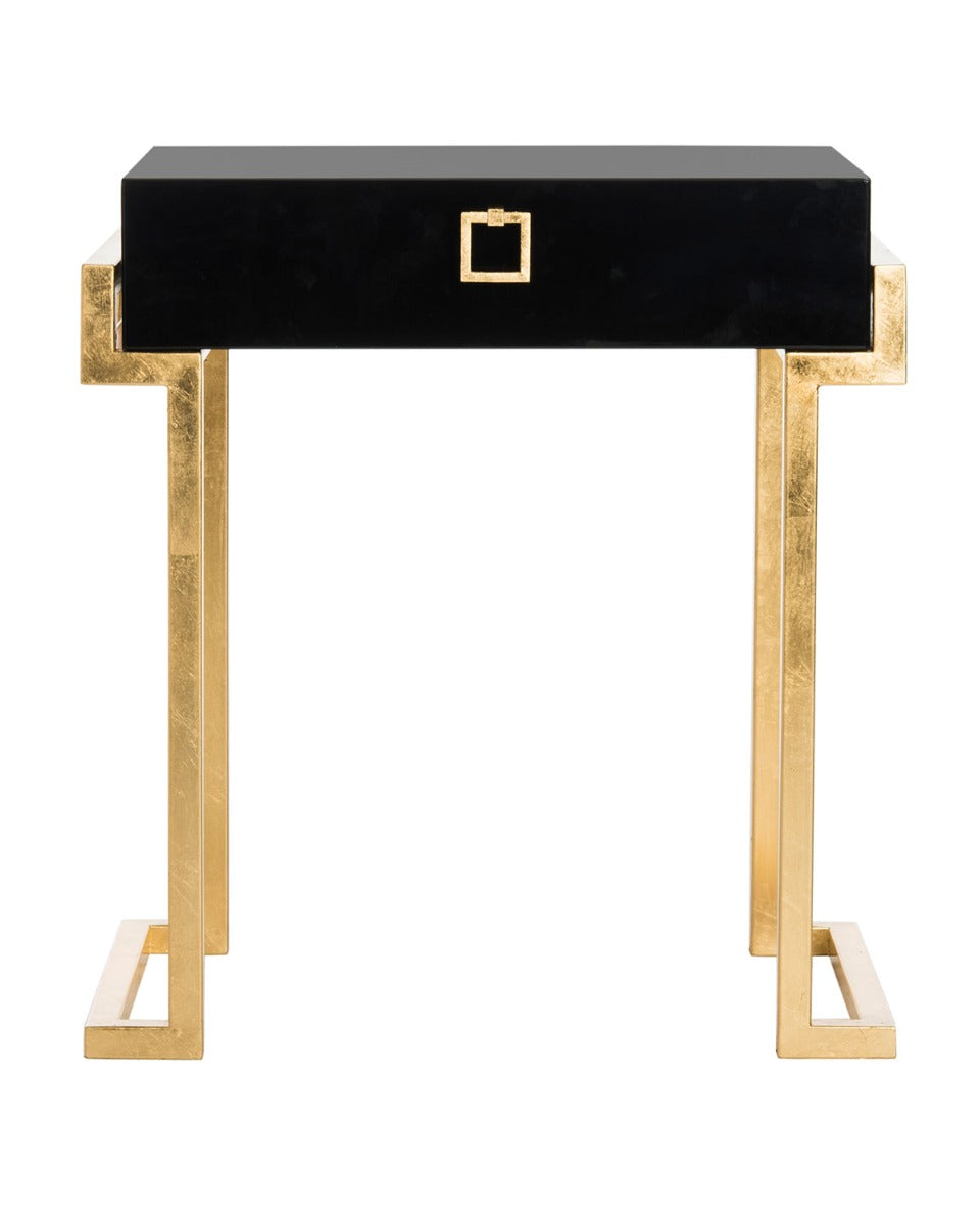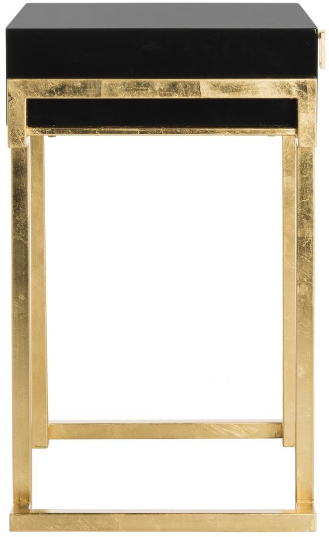Embrace the new traditionalist style with this modern accent table. Its classic black hue shines with its sleek lacquer finish and svelte gold legs lend instant glamour to any interior. Its exquisitely detailed brass hardware makes it a modern heirloom.