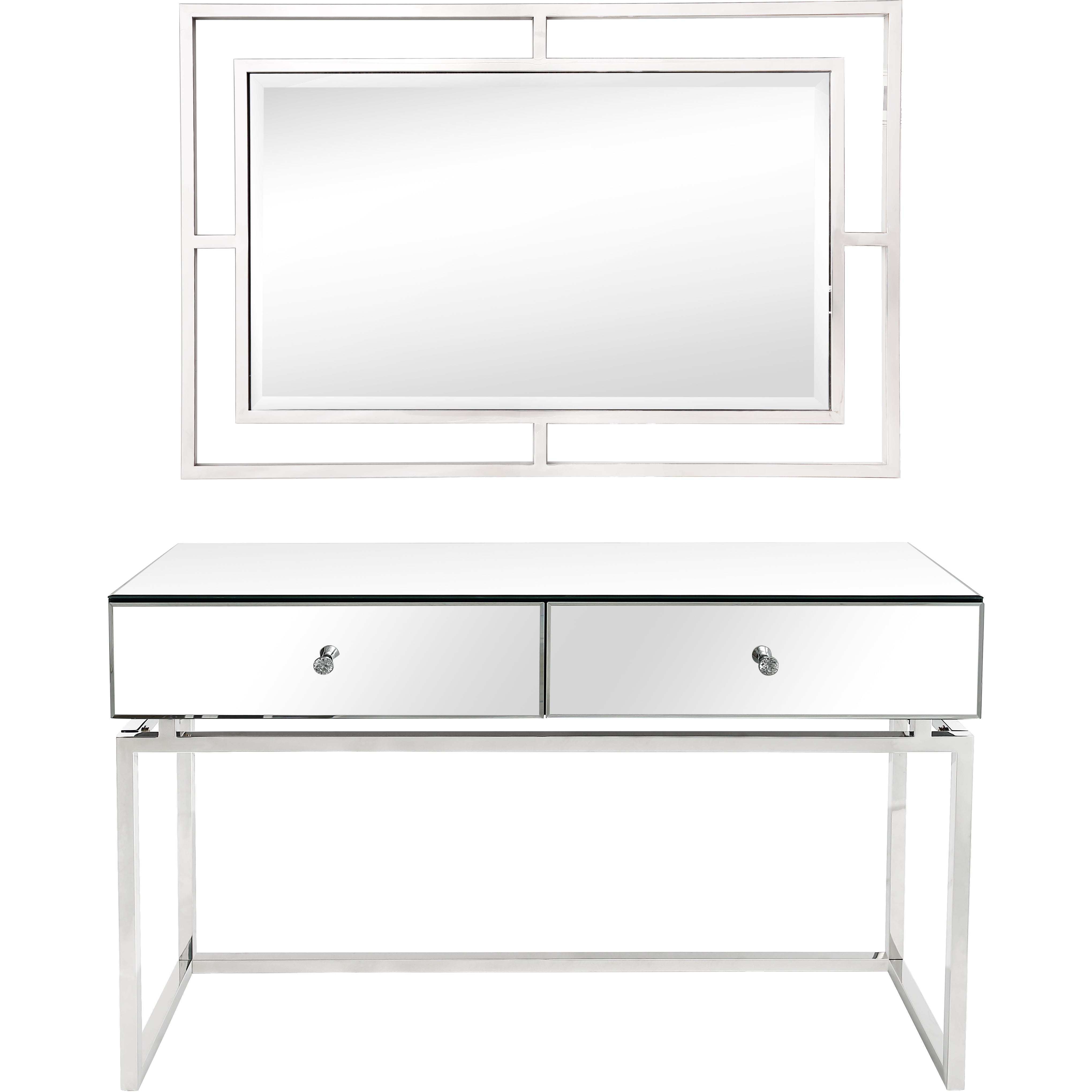 The Addison Console offers the perfect balance between form and function. Resting on a stainless steel base, the Addison gives you a weighty presence on top (with its expansive surface area and dual storage), but the feeling of airiness on the bottom. This mirrored console appears to float and can house many of your fine collectibles. Bring it home today and revel in its majestic beauty. The Addisson Rectangular Accent Mirror features a contemporary design that gives a finishing touch to your well-decorated room. Enclosed in a neat rectangular frame, the mirror has a beveled edge which adds a shine factor to your bedroom or bathroom. The mirror complements a variety of color pallets and blends beautifully into both contemporary or modern decor. Beveled 27.5 x 42 mirror has a high quality silver backing. Ready to hang either vertically or horizontally with pre-attached hanging mounts.