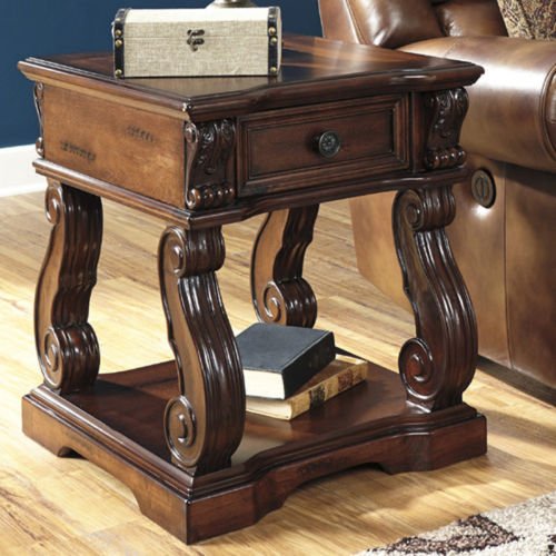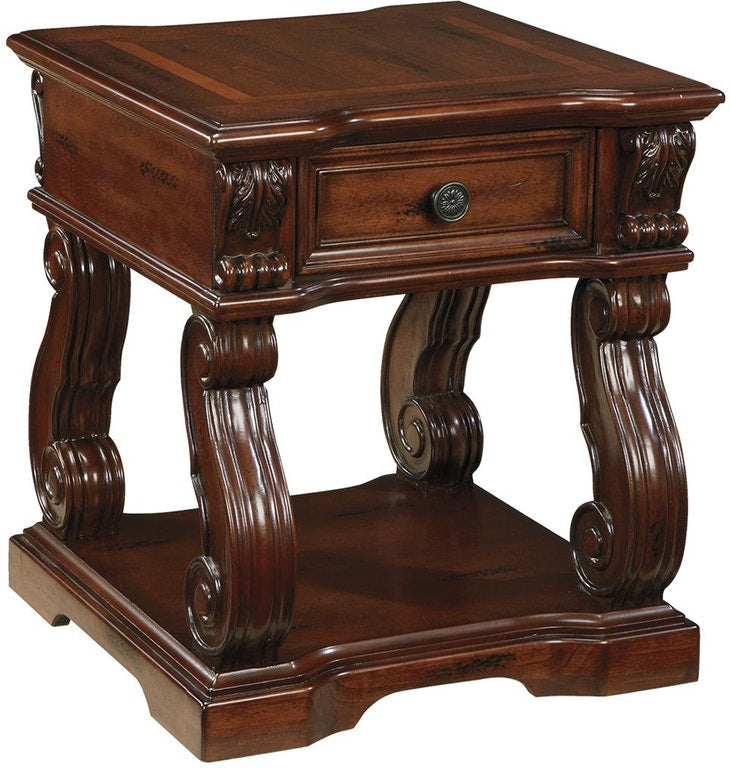 The shapeliness of Alymere end table's serpentine legs is beautifully contrasted by a linear tabletop. Stow odds and ends in the drawer and display your favorite whatnots on the bottom shelf. The perfect blend of form and function.