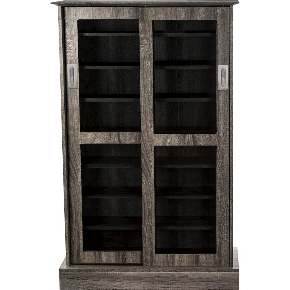 Protect and display your disc collection in this 32-inch Atlantic Driffield media storage cabinet. Height-adjustable shelves provide flexible storage and accommodate up to 576 CDs, while the two-way sliding glass doors with metal pulls provide easy access to contents. This Atlantic Driffield media storage cabinet has a traditional light wood-textured finish to suit a transitional or modern interior.