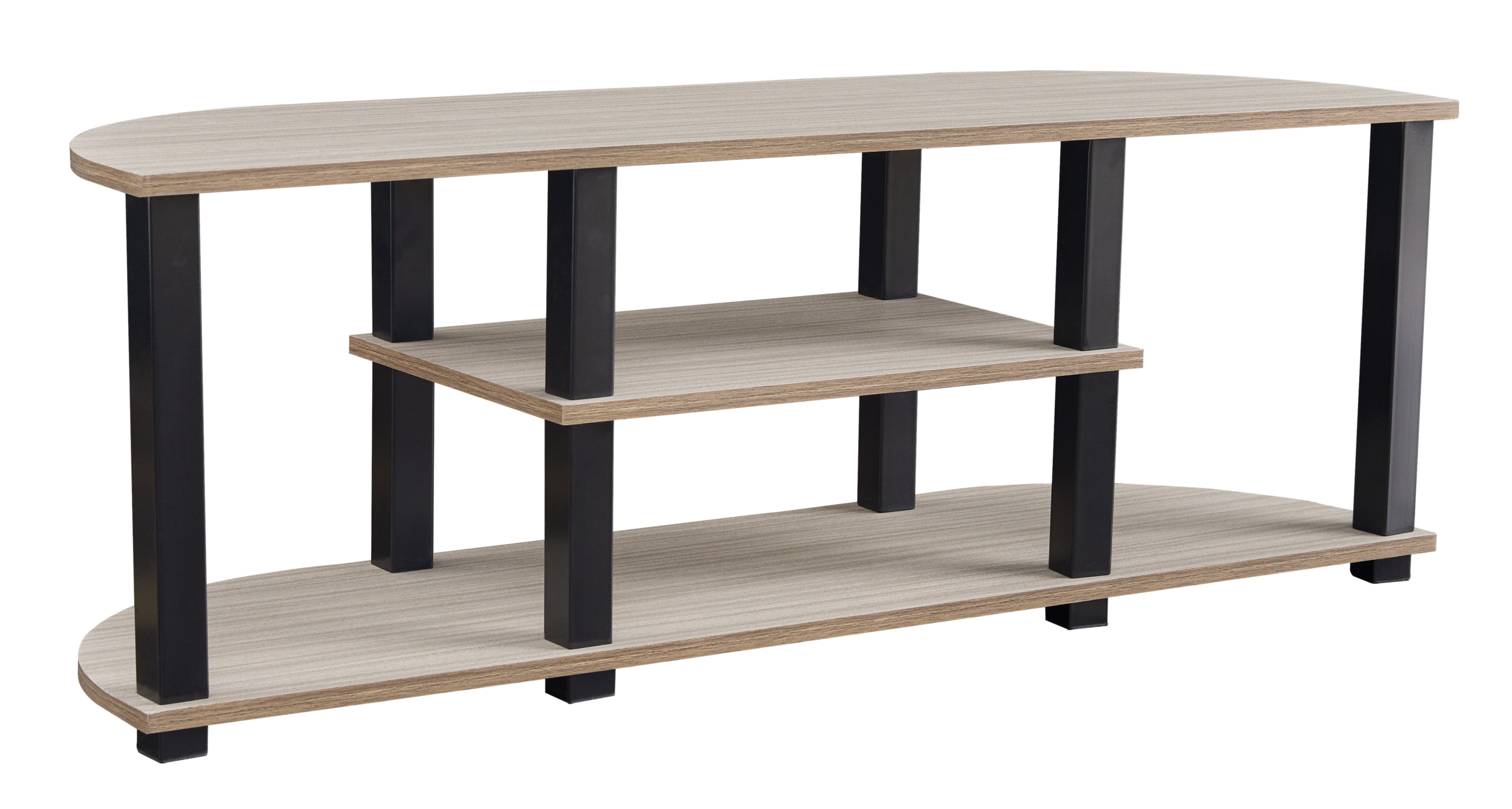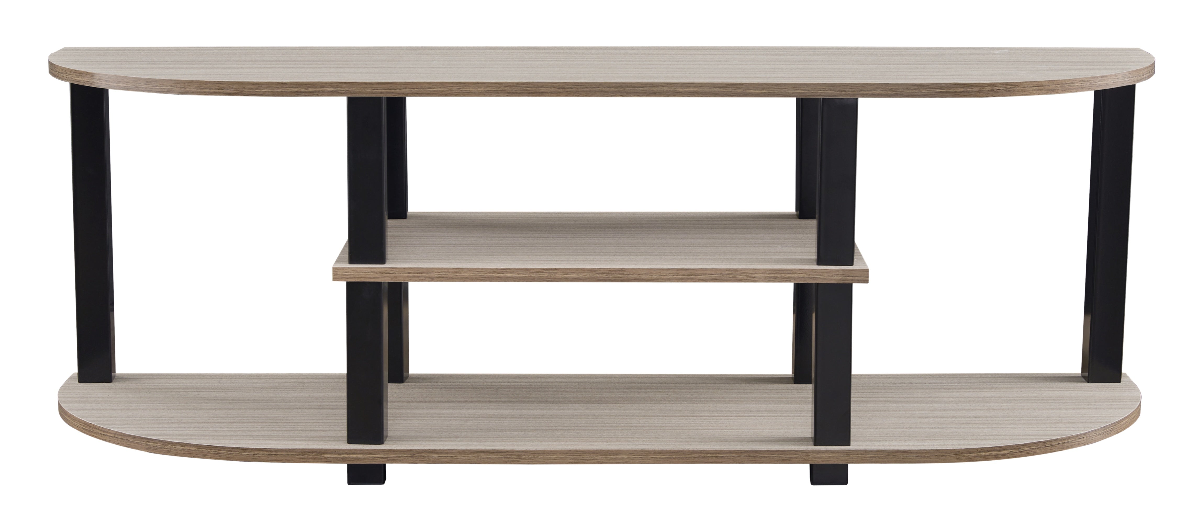 The Bertmond TV stand’s open-concept design is perfect for bringing style to your clean, contemporary space. The combination of satin black finished metal and a sleek laminated natural wood color gives this TV stand major flair, while the open display shelf maximizes your available space for audio and video accessories.