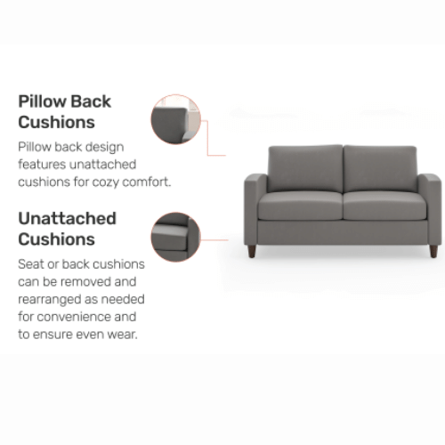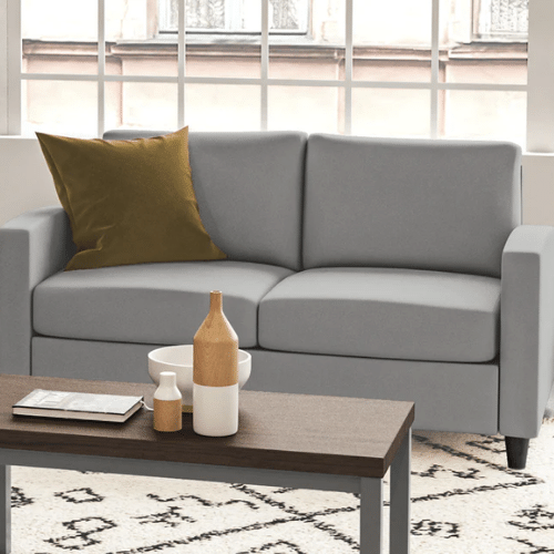 Amp up the style in your space with the elegant Blake loveseat. Designed for comfort and ease, this loveseat features plush, pillow-back cushions, thin, contoured arms, and neutral fabric that gives the design a fresh, modern look. A knock-down design makes assembly a breeze—no tools required. Need to fit it into a tight space? Simply fold down the back and unscrew the legs.