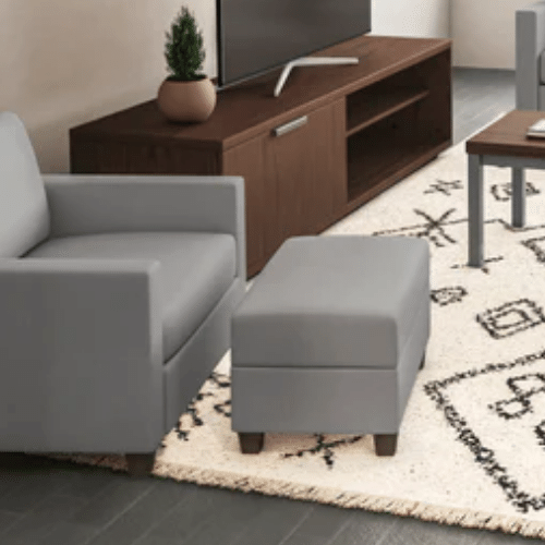 On its own or paired with the Blake Arm Chair, you can choose to put up your feet or take a seat with this Homestyles Blake Ottoman. The supportive cushion sits atop a hardwood frame with sturdy legs for a solid foundation, and the stain-resistant polyester fabric is easy to care for and durable. When you want to add a little extra comfort to your seating arrangement, look no further than the Blake Ottoman.