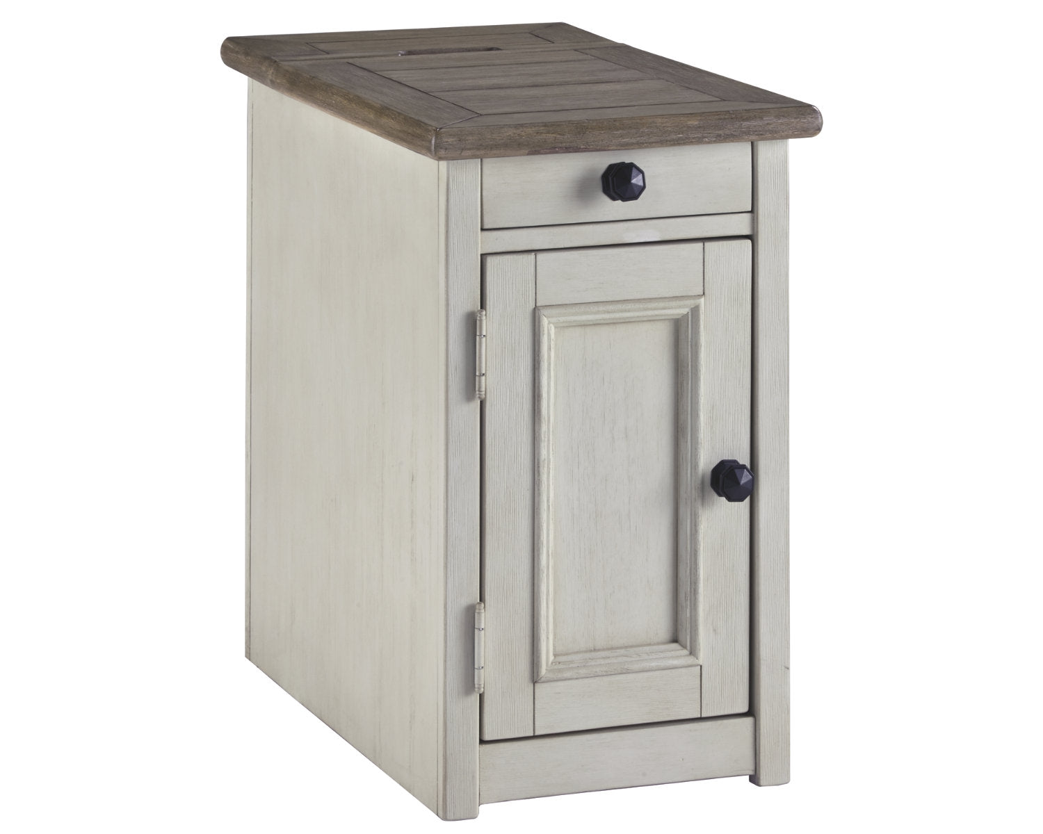 Display and contain your favorite things with this end table. Its textured antique white finish creates a vintage two-tone look, while outlets and USB ports provide functionality. This is a piece you will enjoy for years to come.