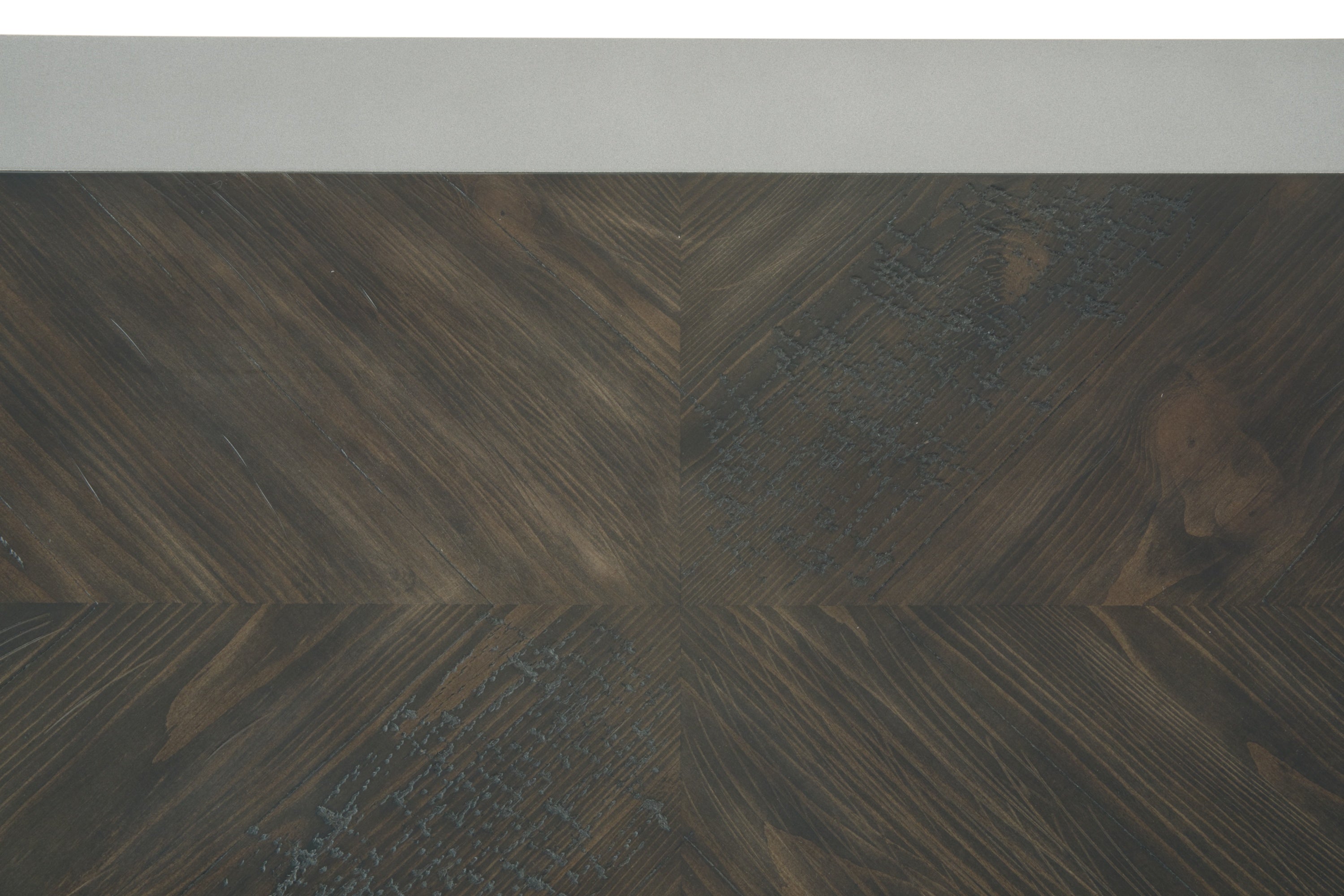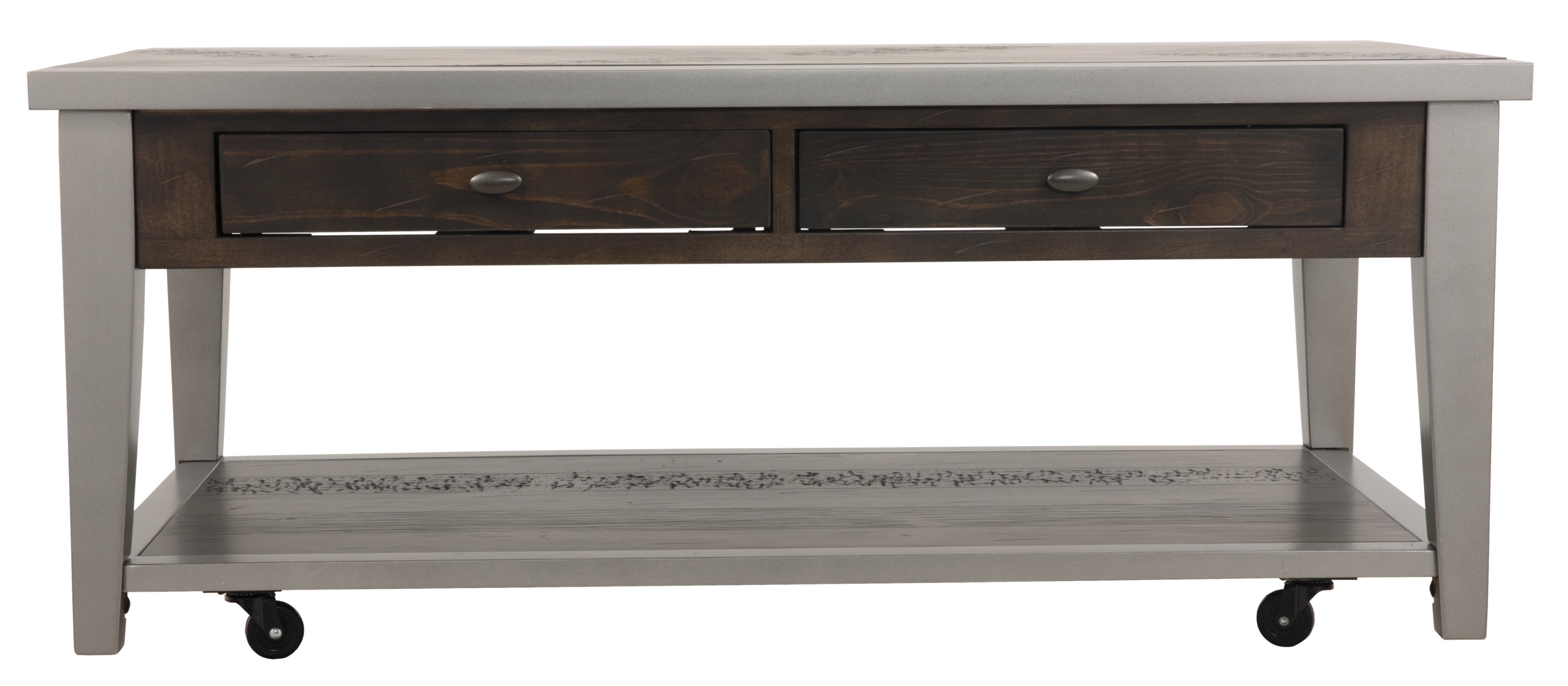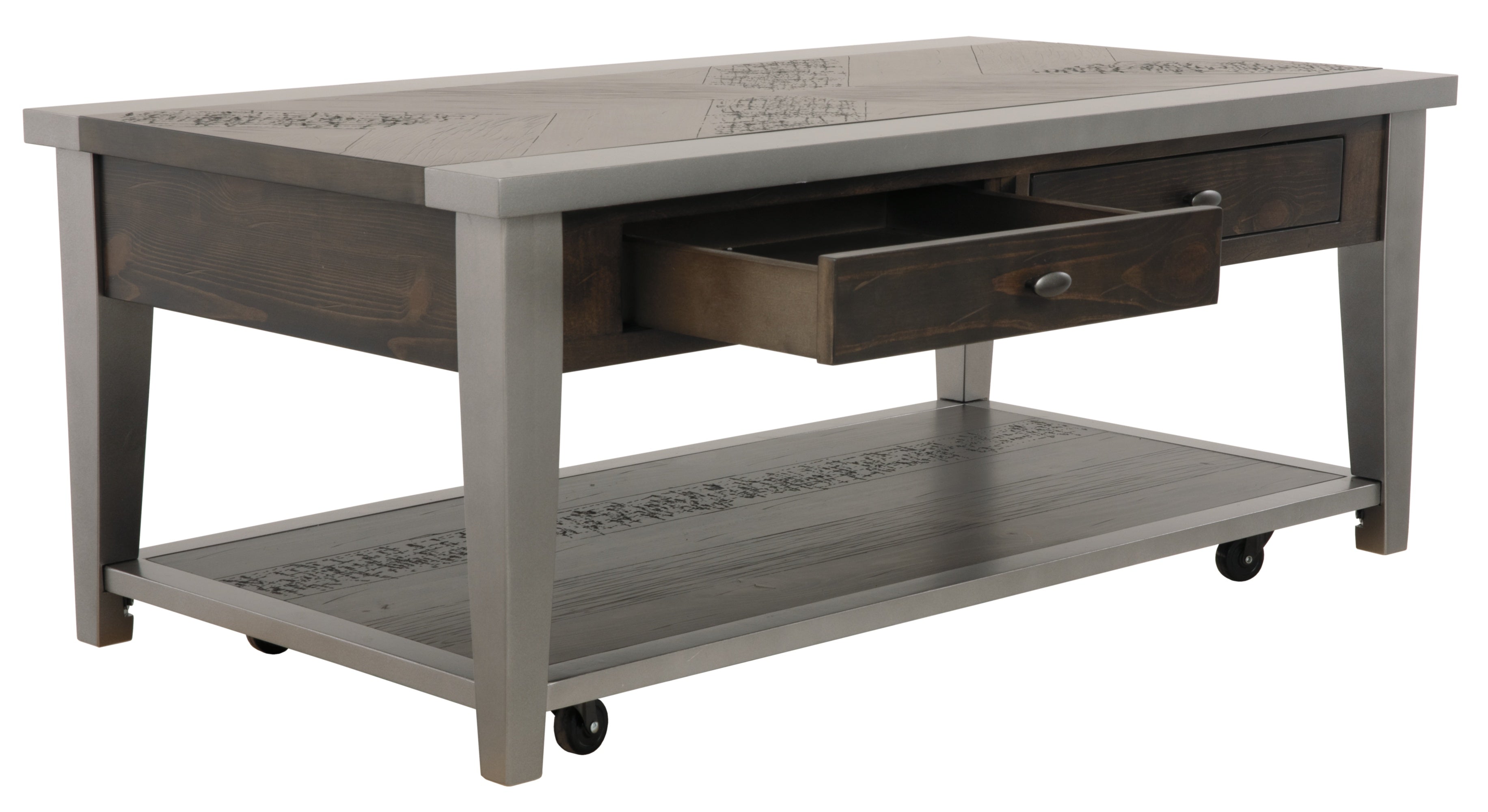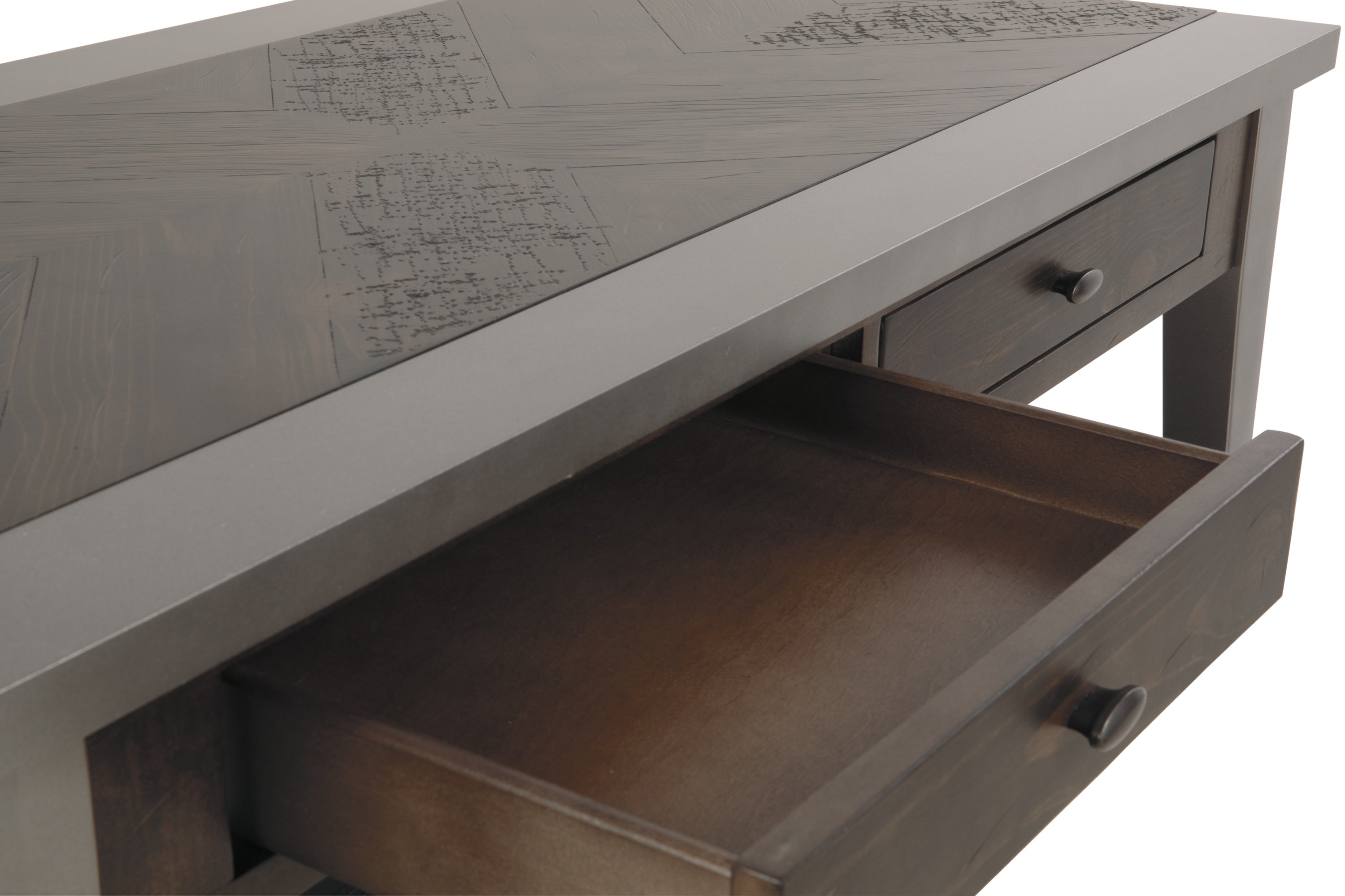 Simply striking yet remarkably detailed. That’s the beauty of the Branbury coffee table. Its clean-lined profile is greatly enhanced by a dramatic tabletop with butterfly veneer layup. And the finish? So complex in a rustic gray tone with hints of aged metallic. Unique oval shaped hardware on the double drawers rounds out the look.