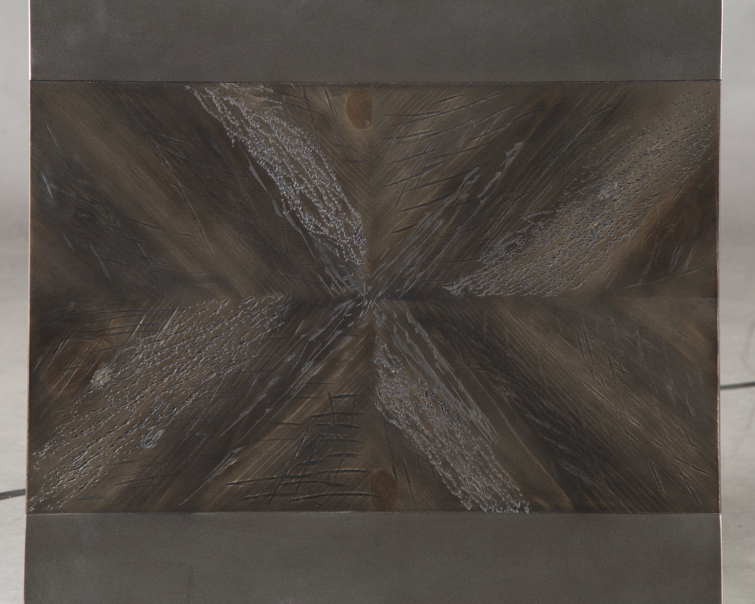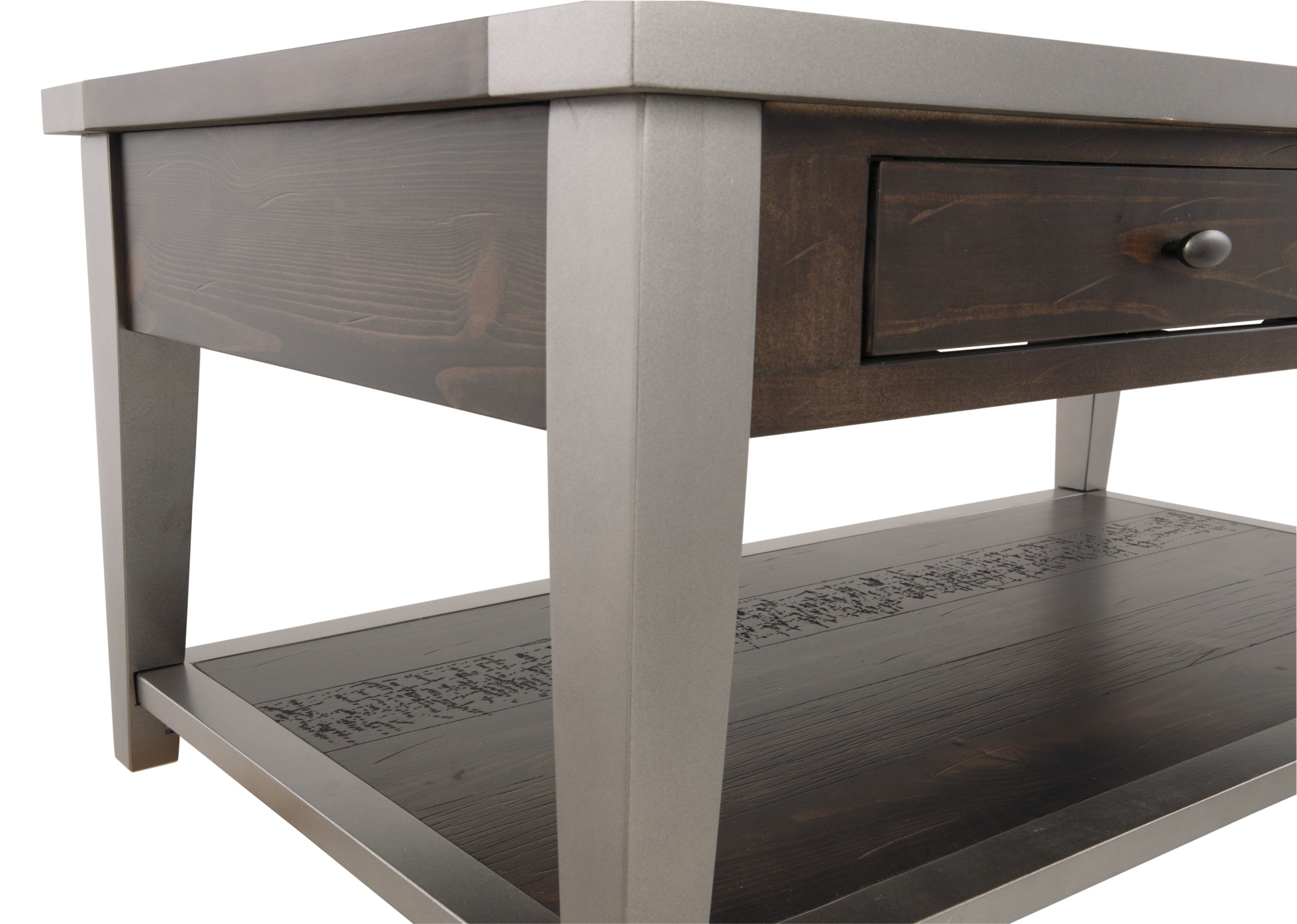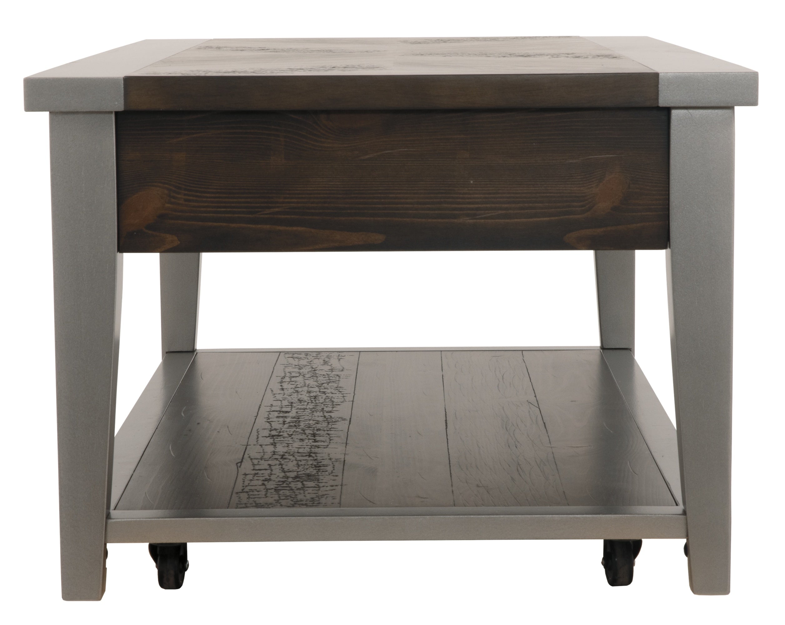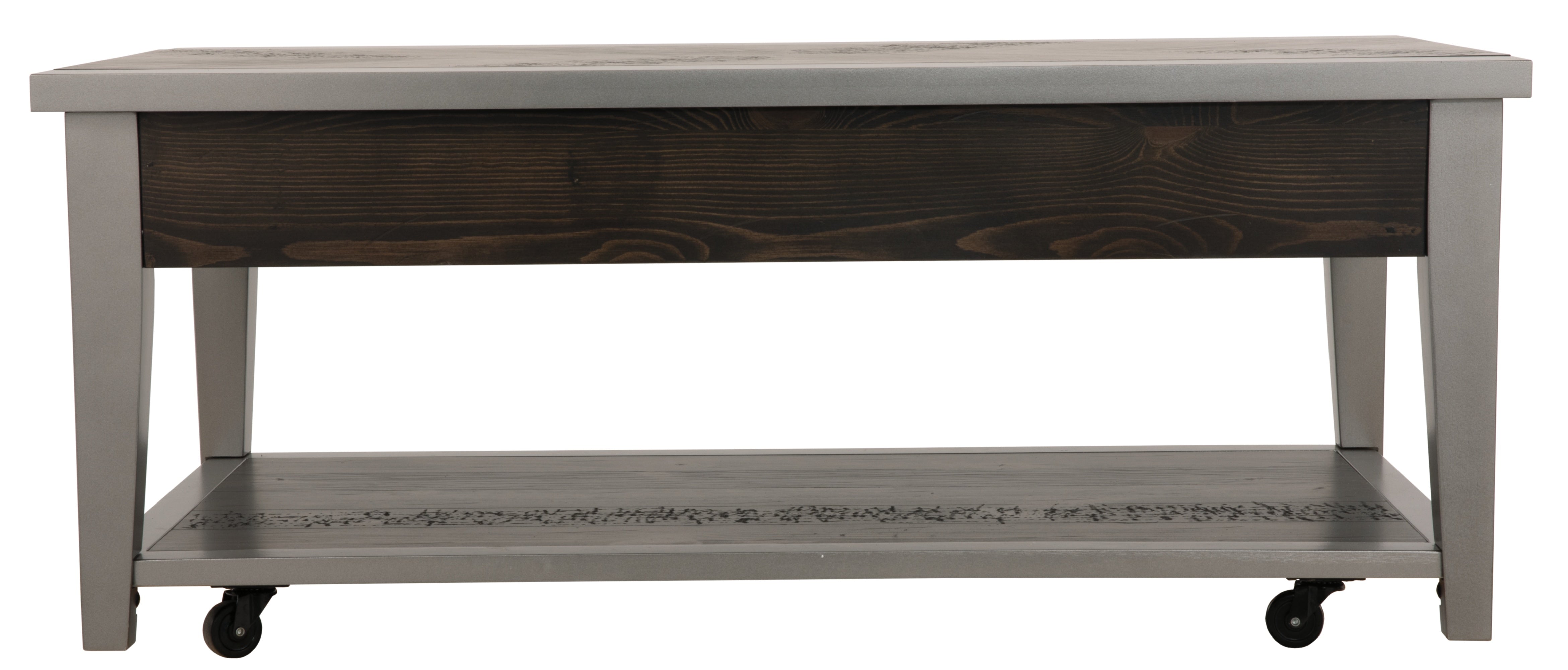 Simply striking yet remarkably detailed. That’s the beauty of the Branbury coffee table. Its clean-lined profile is greatly enhanced by a dramatic tabletop with butterfly veneer layup. And the finish? So complex in a rustic gray tone with hints of aged metallic. Unique oval shaped hardware on the double drawers rounds out the look.