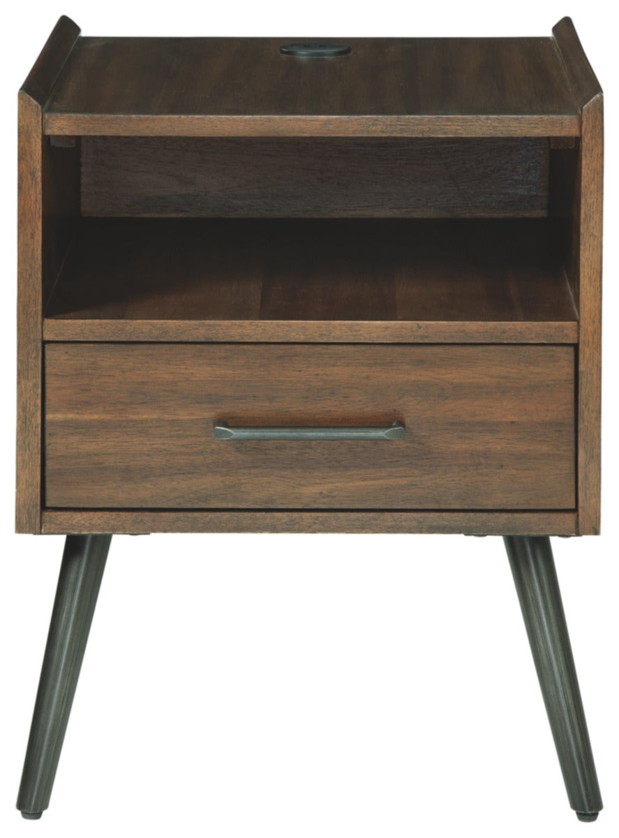 Retro yet relevant. This end table is a great case of mid-century influence with cool, contemporary flair. Ultra-linear tabletop is supported by canted round metal legs for a signature look that reflects your eye for beautiful things. Subtly placed USB ports merge high tech with high style.
