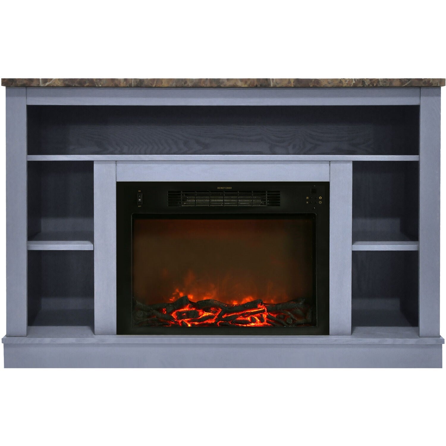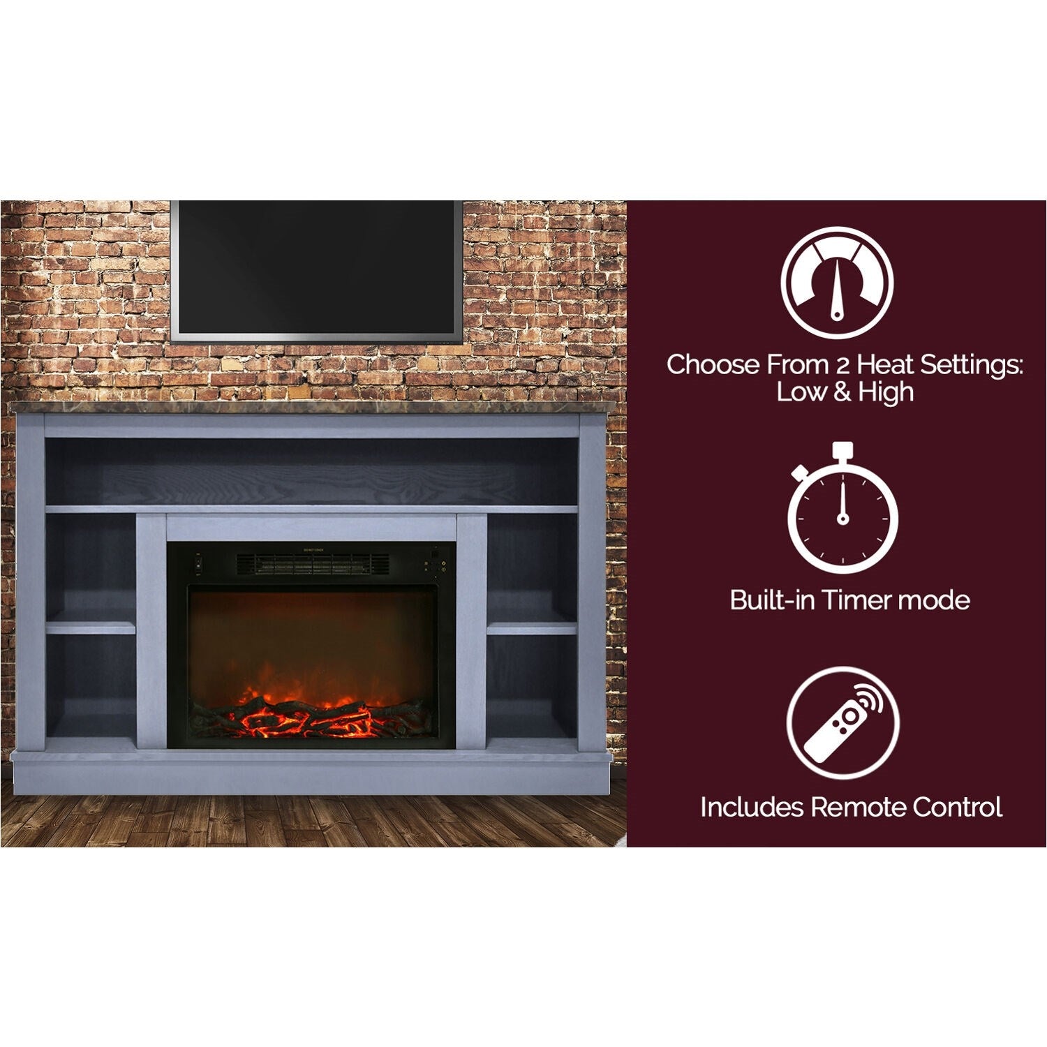 The Seville electric fireplace will quickly turn your room into a cozy conversation space for warm family gatherings. Not only is it packed with heat functions and adjustable flame displays, it also doubles as an entertainment stand with additional storage solutions. The mantel top is long enough to accommodate flat panel TVs up to 50 inches. A long A/V shelf lies underneath, creating a convenient compartment for items like soundbars, DVD players, game consoles, and cable boxes. Four small storage compartments are located on both sides of the fireplace insert. These shelves are concealed behind cabinet doors and offer a convenient place to store DVDs and other small items. The electric insert produces 5,115 BTUs of fan-forced heat that can quickly heat a 210 sq. ft. room. An enchanting flame display dances across the back of the firebox, creating movement that is sure to catch your eye. Embers of light glaze across the logs within, adding highlights throughout the charred log display.