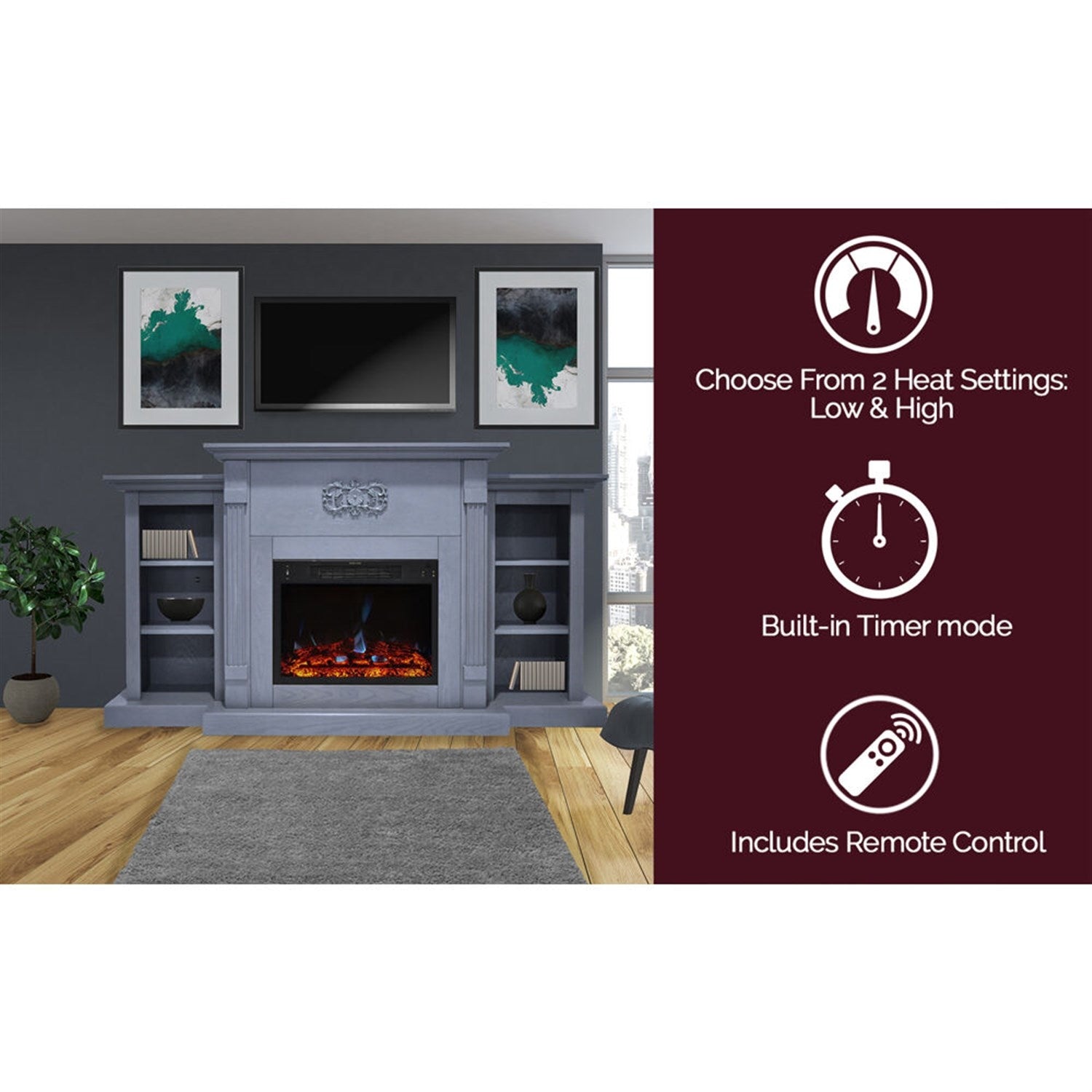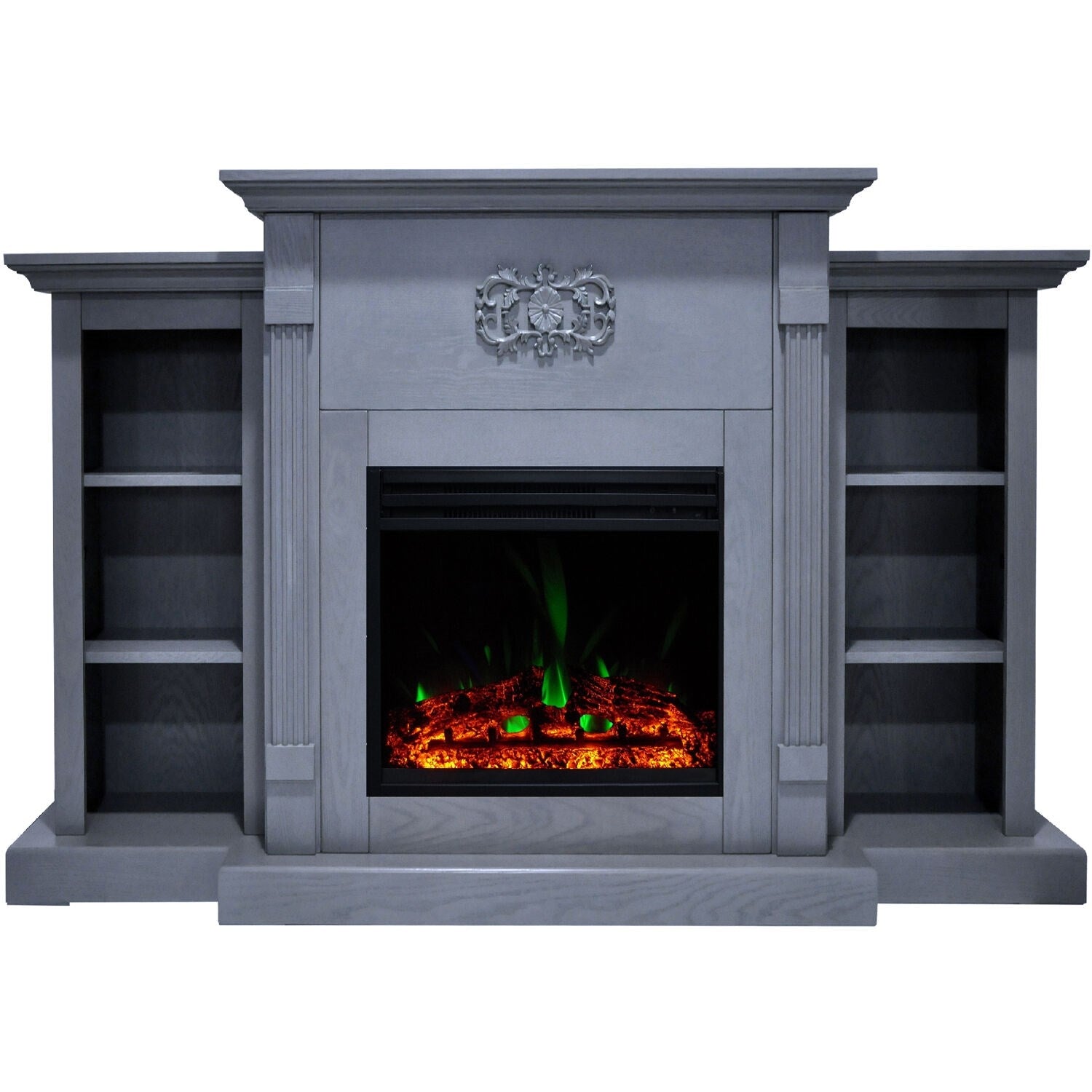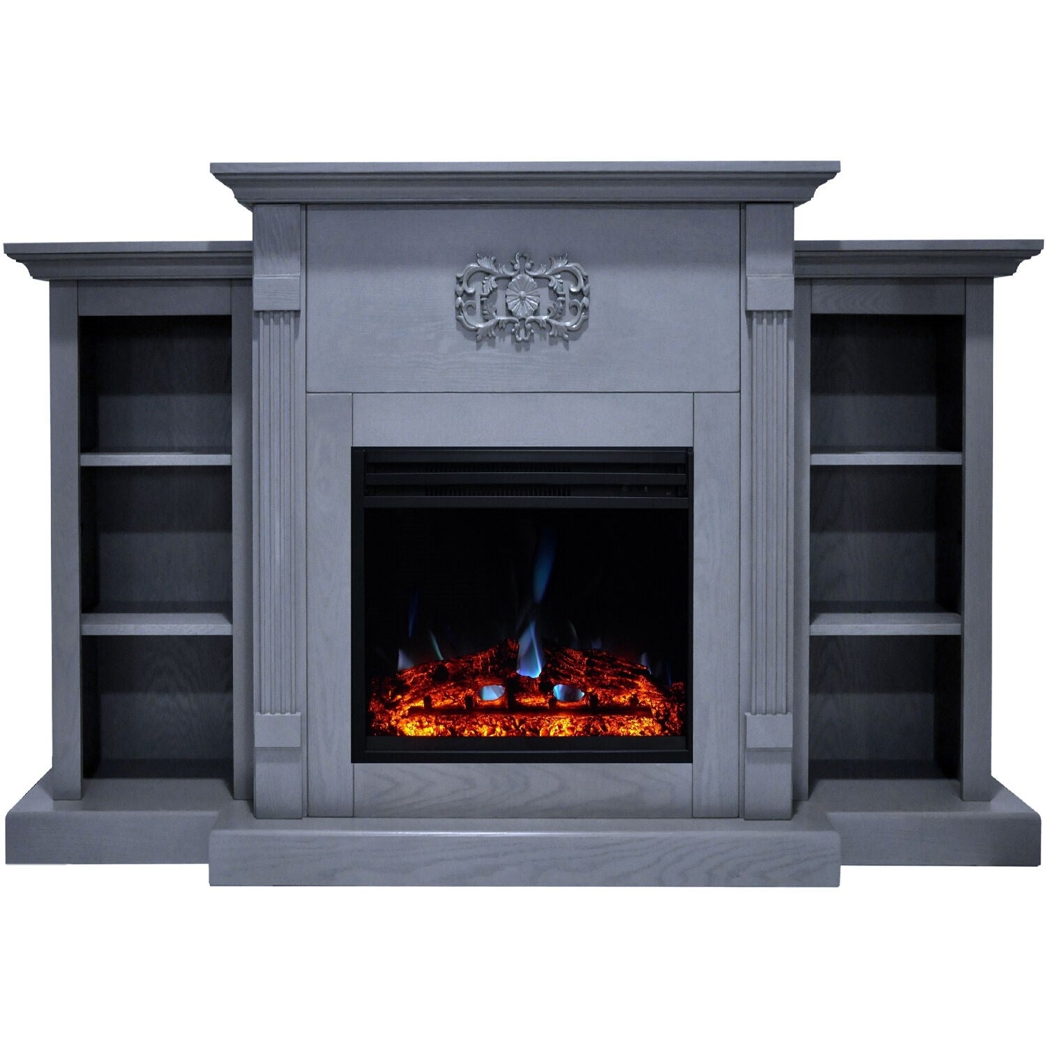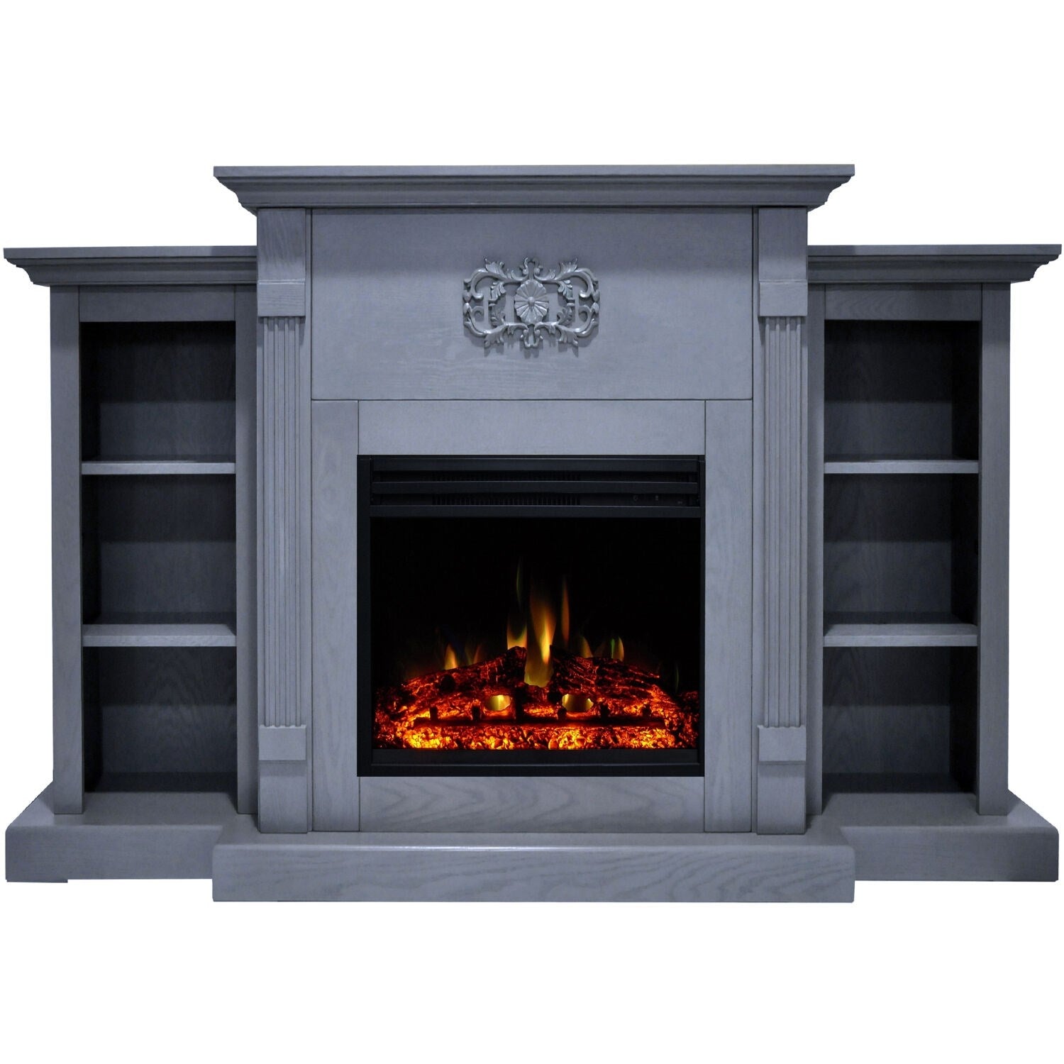 Electric fireplaces are an easy way to add warmth and character to your home. If you are looking for a multi-functional statement piece, the Sanoma Fireplace is perfect for you. Two side bookshelves balance the middle frame that hosts the fireplace insert. These shelves, along with the long mantel top, provide plenty of space for displaying books and decor. A Gothic floral appliqu, is carved across the top of the fireplace, giving it a classic and traditional look. The clean lines, fluted pilasters, and crown molding are a few of the design details that add even more character to the frame. The electric insert produces 5,115 BTUs of fan-forced heat that can quickly heat a 210 sq. ft. room. An enchanting LED flame display dances across the back of the firebox, creating movement that is sure to catch your eye. Embers of multi-color light glaze across the logs within, adding highlights throughout the enhanced log display.