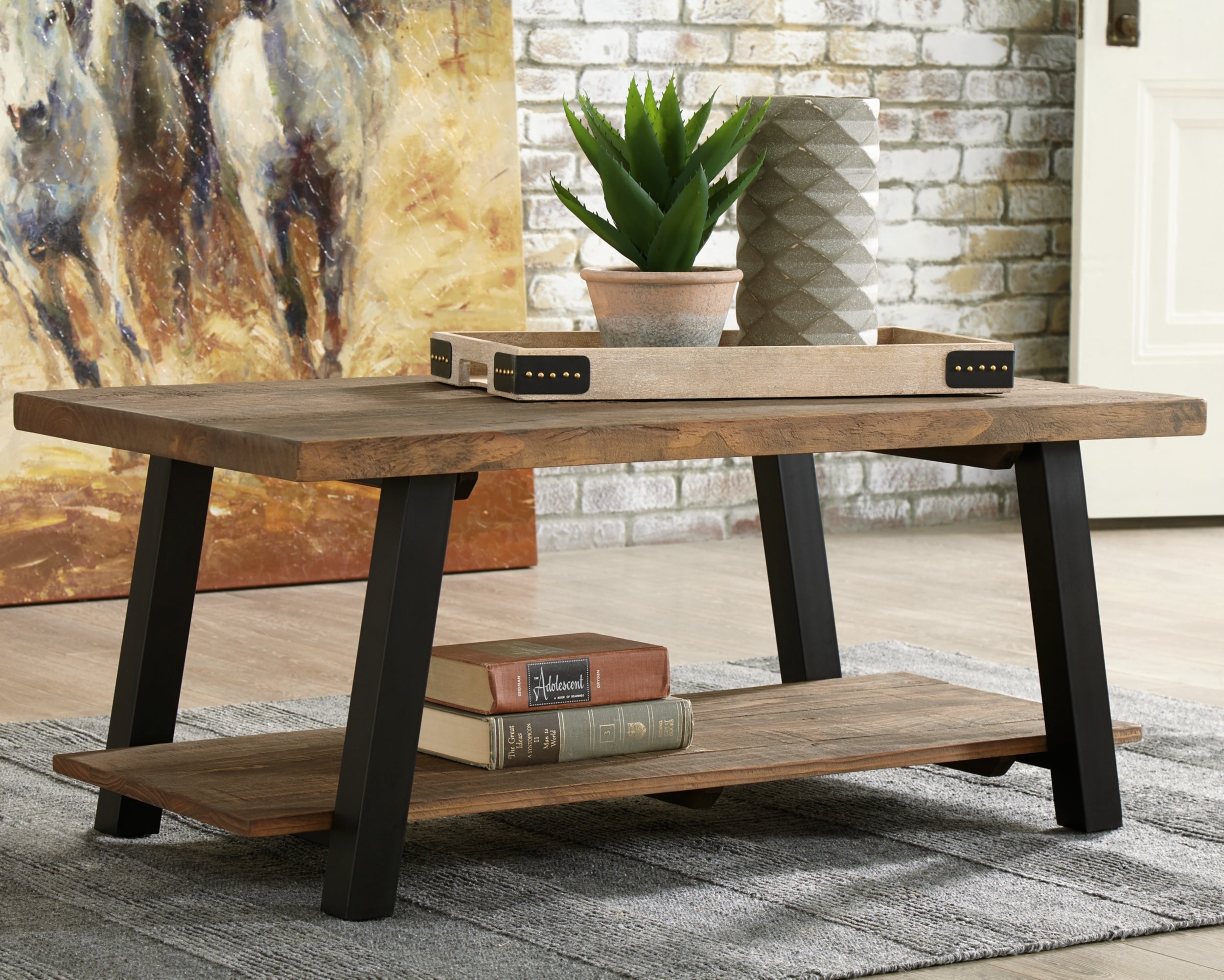 With its urban contemporary styling, the Chanzen coffee table provides your room with a lodge-style feel that's at once warm and welcoming. The two-tone finish is an on-trend addition to your contemporary decor, while the lower shelf provides extra storage for books, magazines or your favorite accessories.