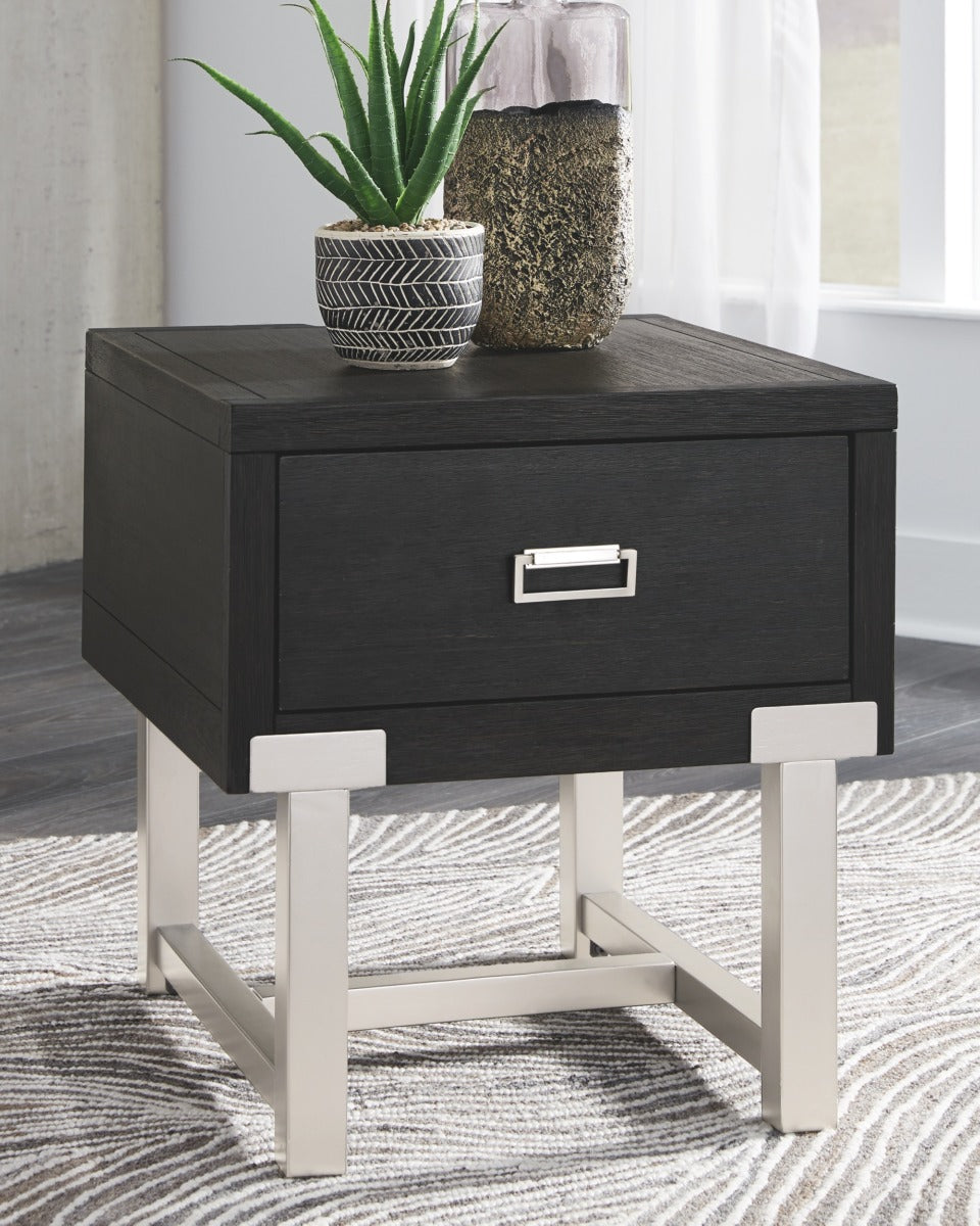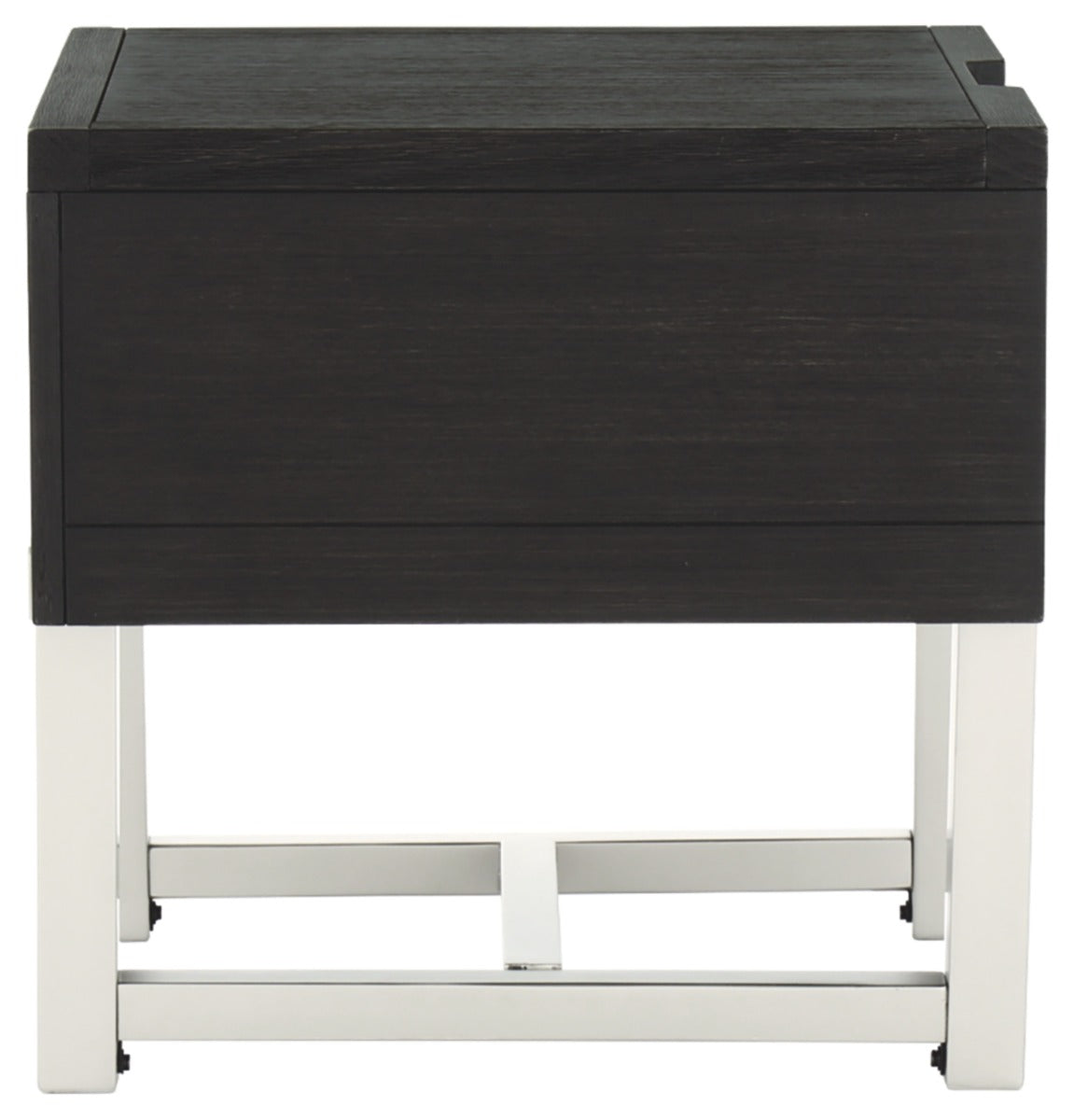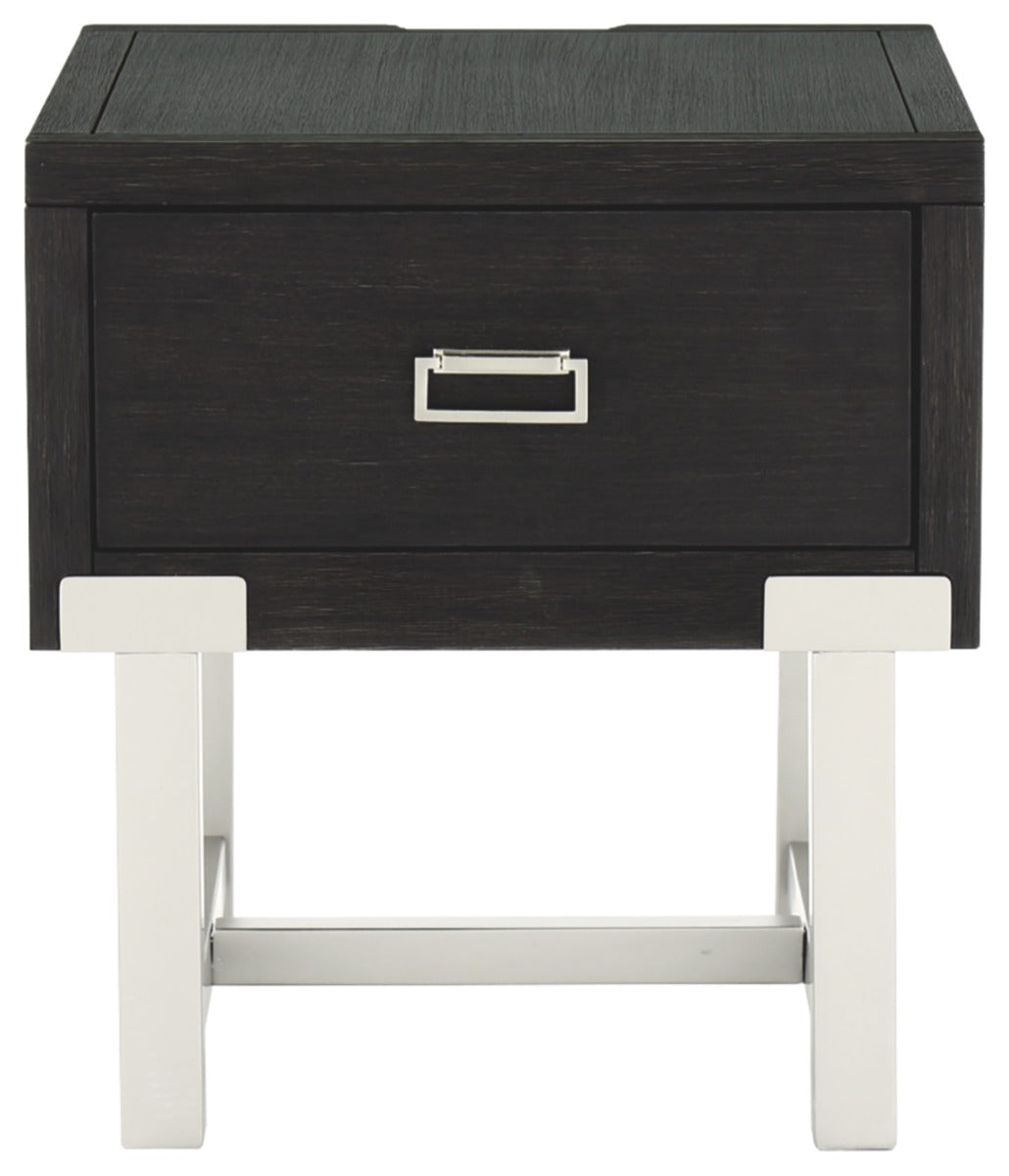 Give your living space the sleek, contemporary touch you’ve been longing for with this end table. Chic and understated, the table’s textured blackened wood finish is paired with bright nickel-tone metal for striking contrast. Industrial hardware on the deep drawer takes the cool factor up a notch. Integrated power outlets and USB charging ports merge form and function.