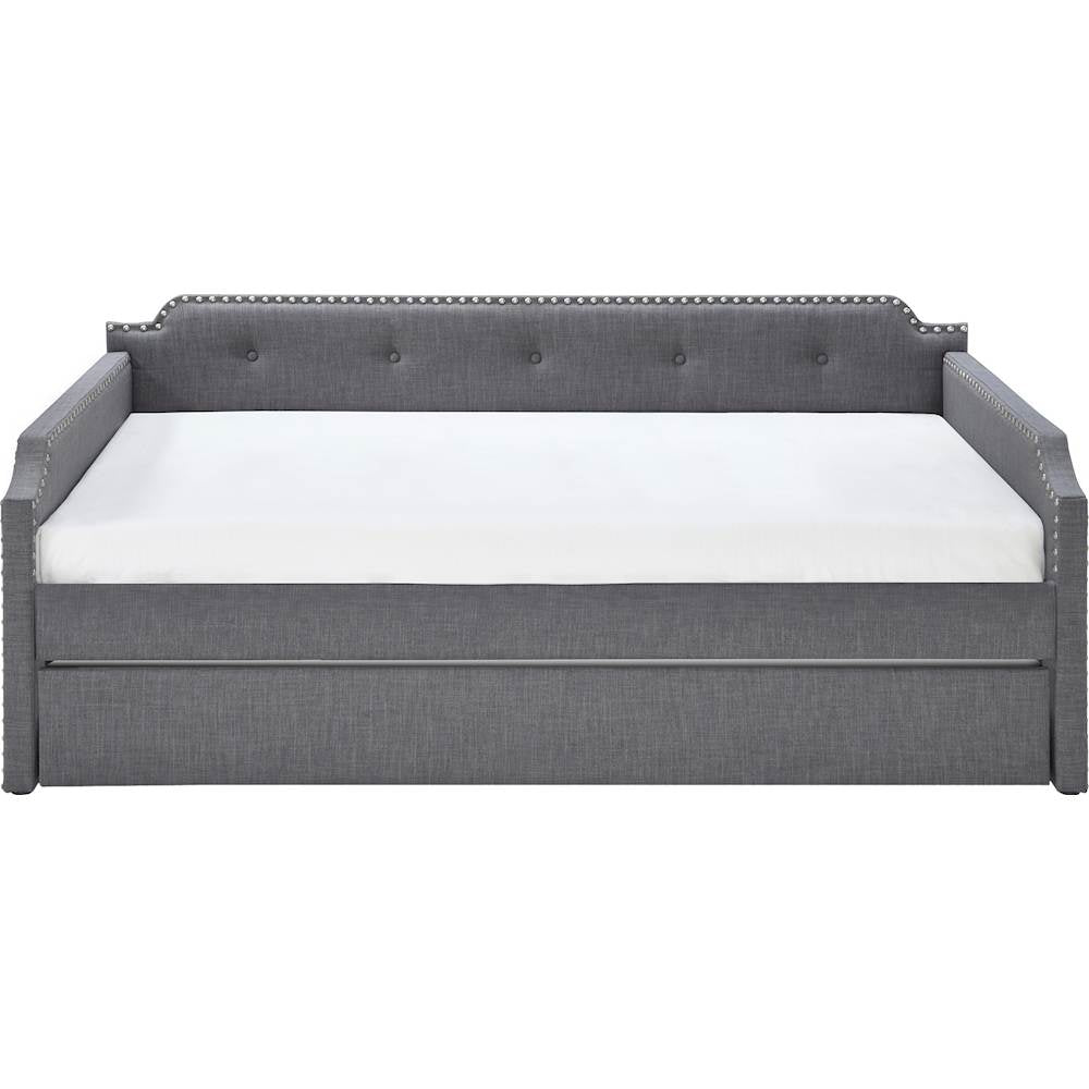 Add a touch of glam to your guest room with this dark gray Click Decor Bella single daybed. The pull-out twin trundle comfortably accommodates the occasional overnight visitor and then pushes back in when you're done. With curved arms, button tufting and generous padding, this Click Decor Bella single daybed offers a cozy spot for sleeping, lounging or reading.