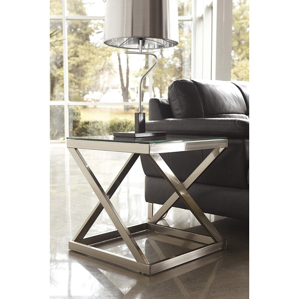 Your quest for the ultimate end table has come to an end—that is if you lean toward contemporary. Decked out in a chic finish, the angled metal base is striking from every angle. The Coylin square end table is topped off with a clear glass top with polished edging for a completely modern look.
