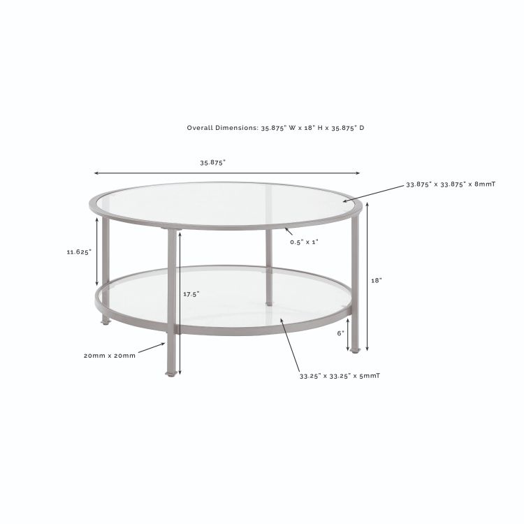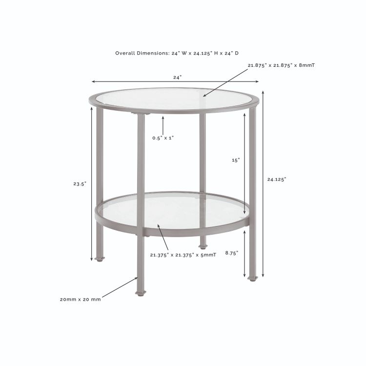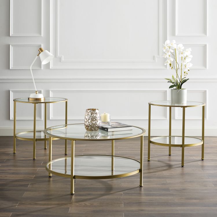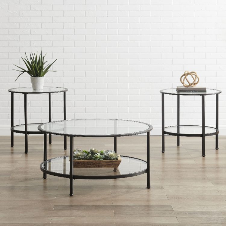 Bring a fashionable and cohesive look to any living space with the Aimee 3pc Occasional Table Set. With sleek steel frames and tempered glass on the tops and shelves, these tables can coordinate with a variety of décor without overwhelming the space. Featuring two round end tables and a coffee table, this occasional set will complete your home's style with a modern edge.