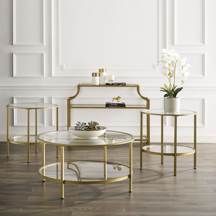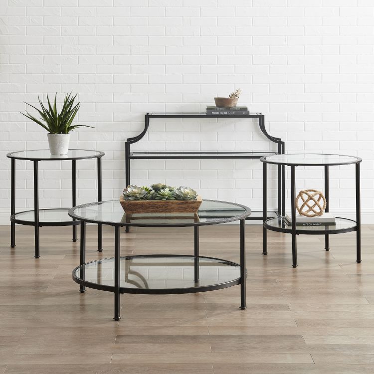 Bring a fashionable and cohesive look to any living space with the Aimee 4pc Occasional Table Set. With sleek steel frames and tempered glass on the tops and shelves, these tables can coordinate with a variety of décor without overwhelming the space. Featuring two round end tables, a round coffee table, and pagoda-style console, this occasional set will complete your home's style with a modern edge.