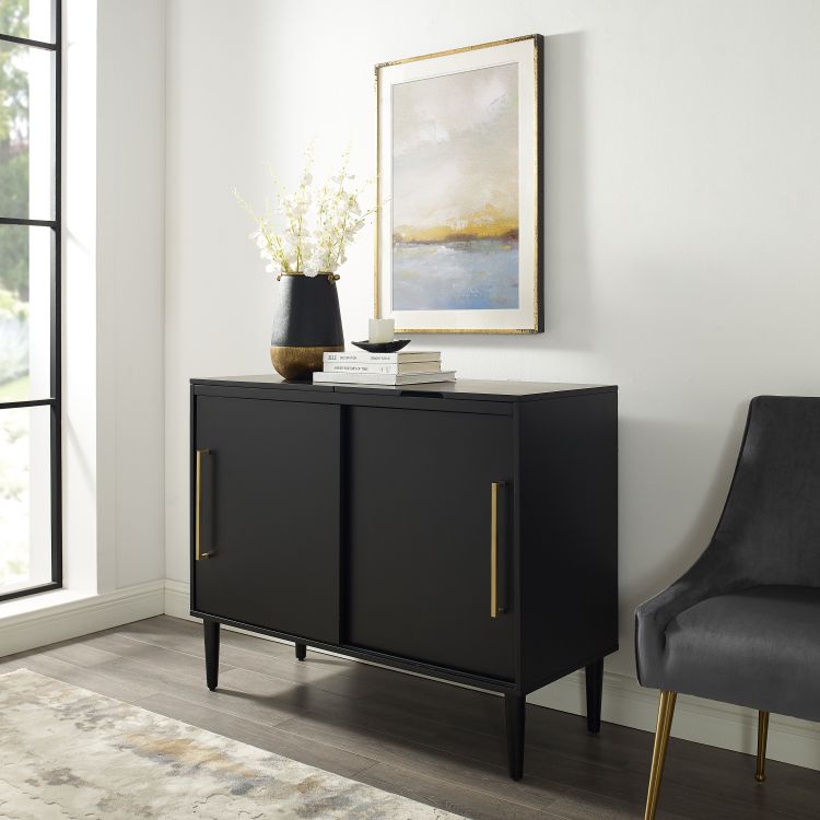 Add polish and style to your home with the sleek mid-century modern design of the Everett Media Console. Whether you need a home for your favorite turntable and album collection or a stylish accent cabinet, this media console has the versatility to fit the bill. Featuring sliding cabinet doors that open to adjustable shelving on one side, and album storage on the other, the Everett Media Console is a perfect storage solution for your home.