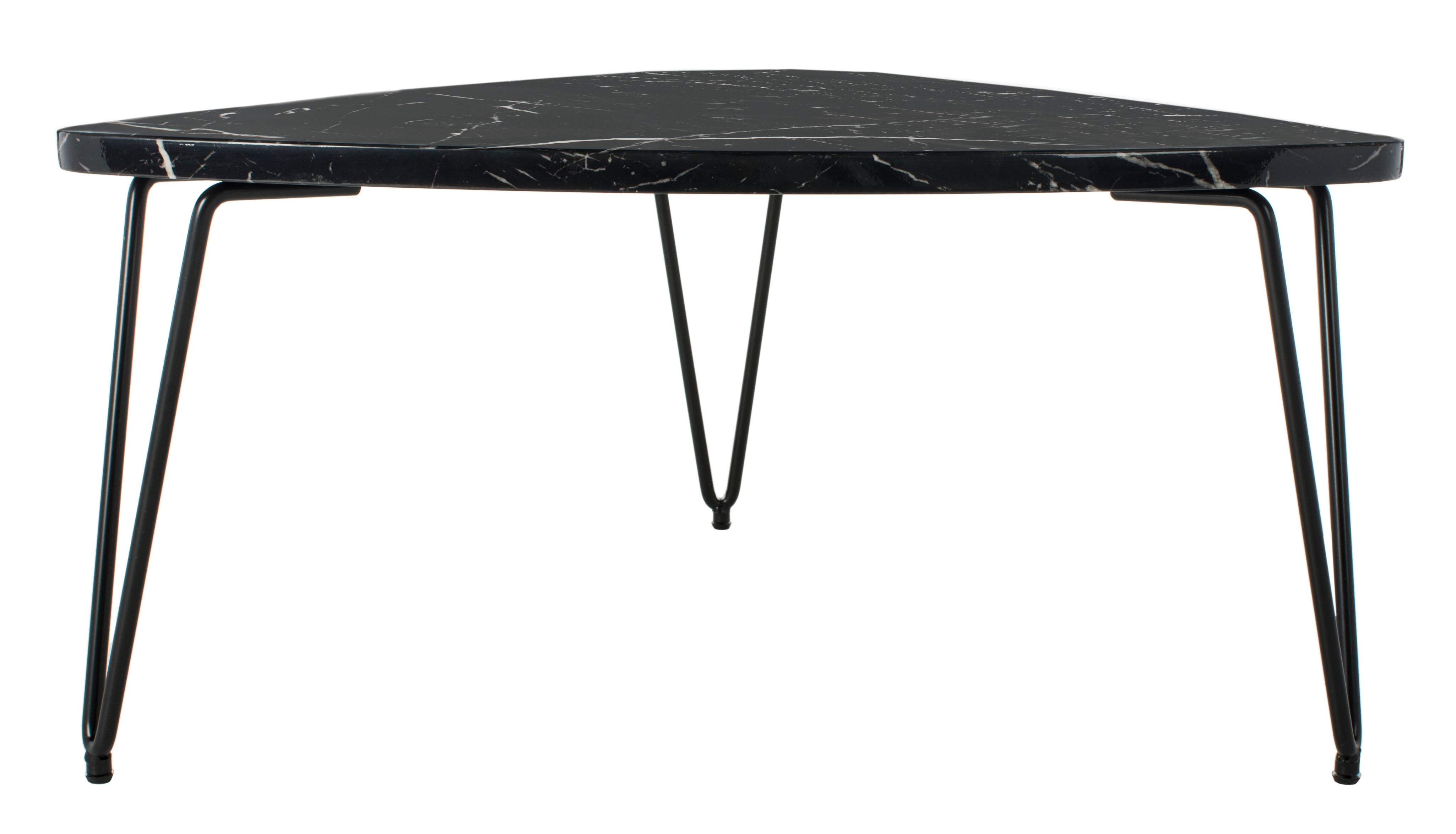Inspired by vintage Italian design, this contemporary triangle coffee table brings elegant style to any living room with its minimalist curves. Its durable resin design features a classic black marble finish and mod hairpin legs.