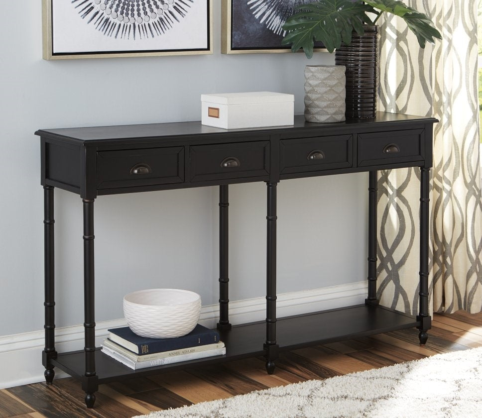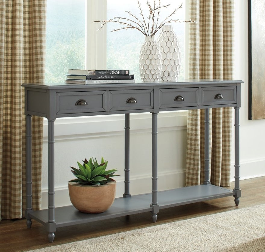 Need wide open shelf space for a decorative display? This long console sofa table gives you ample room to work with, plus bonus drawer space for keeping a clutter-free table top. Vintage elements like turned legs, cupped drawer pulls and framed drawer fronts make this table perfect for drawing attention.