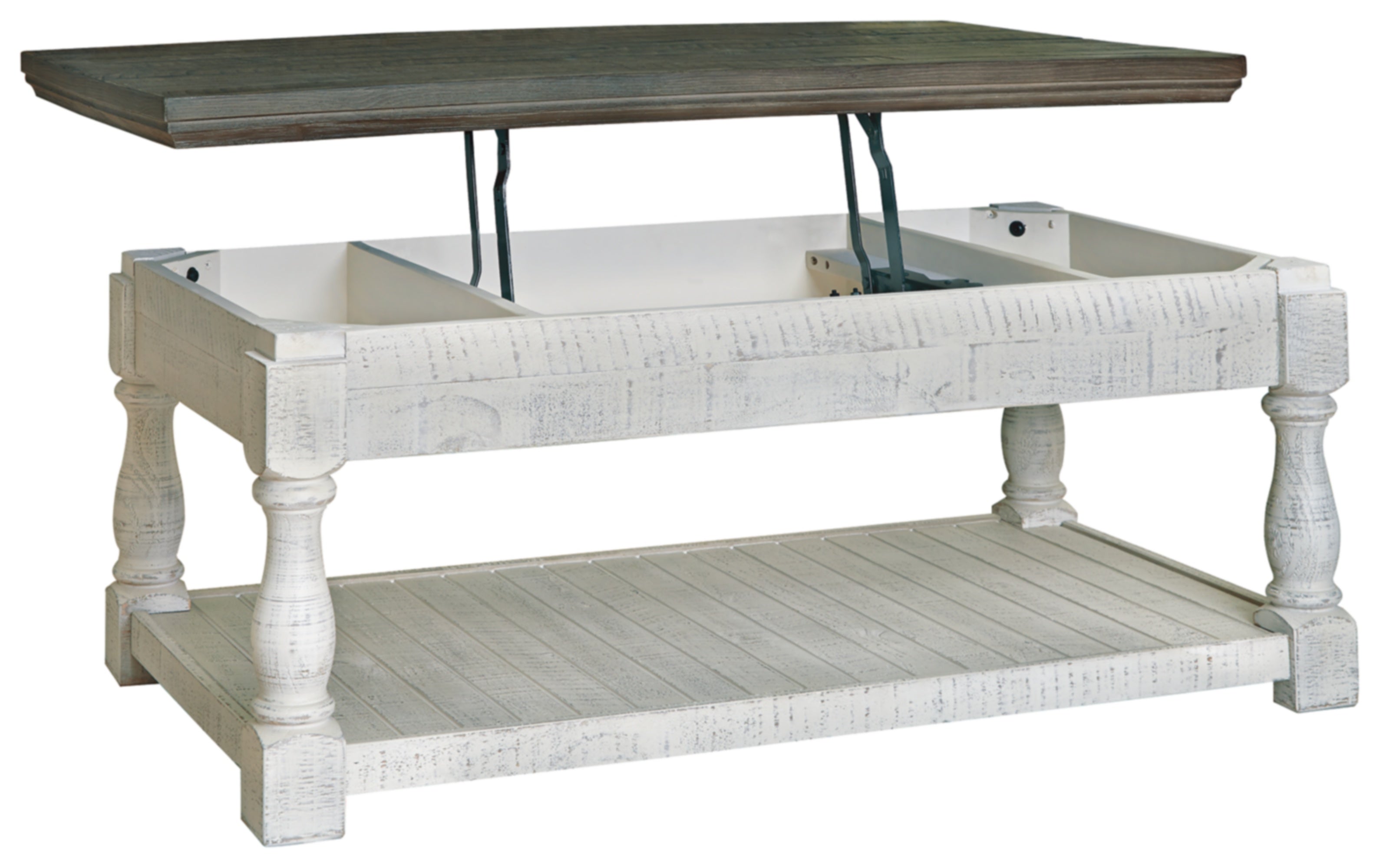 With its richly rustic finish and textural mix, the Havalance lift-top coffee table goes to town on bygone beauty. Its distressed two-tone treatment blends a weathered gray with vintage white for an utterly charming effect. The lift-top design adds function to your very comfortable space.