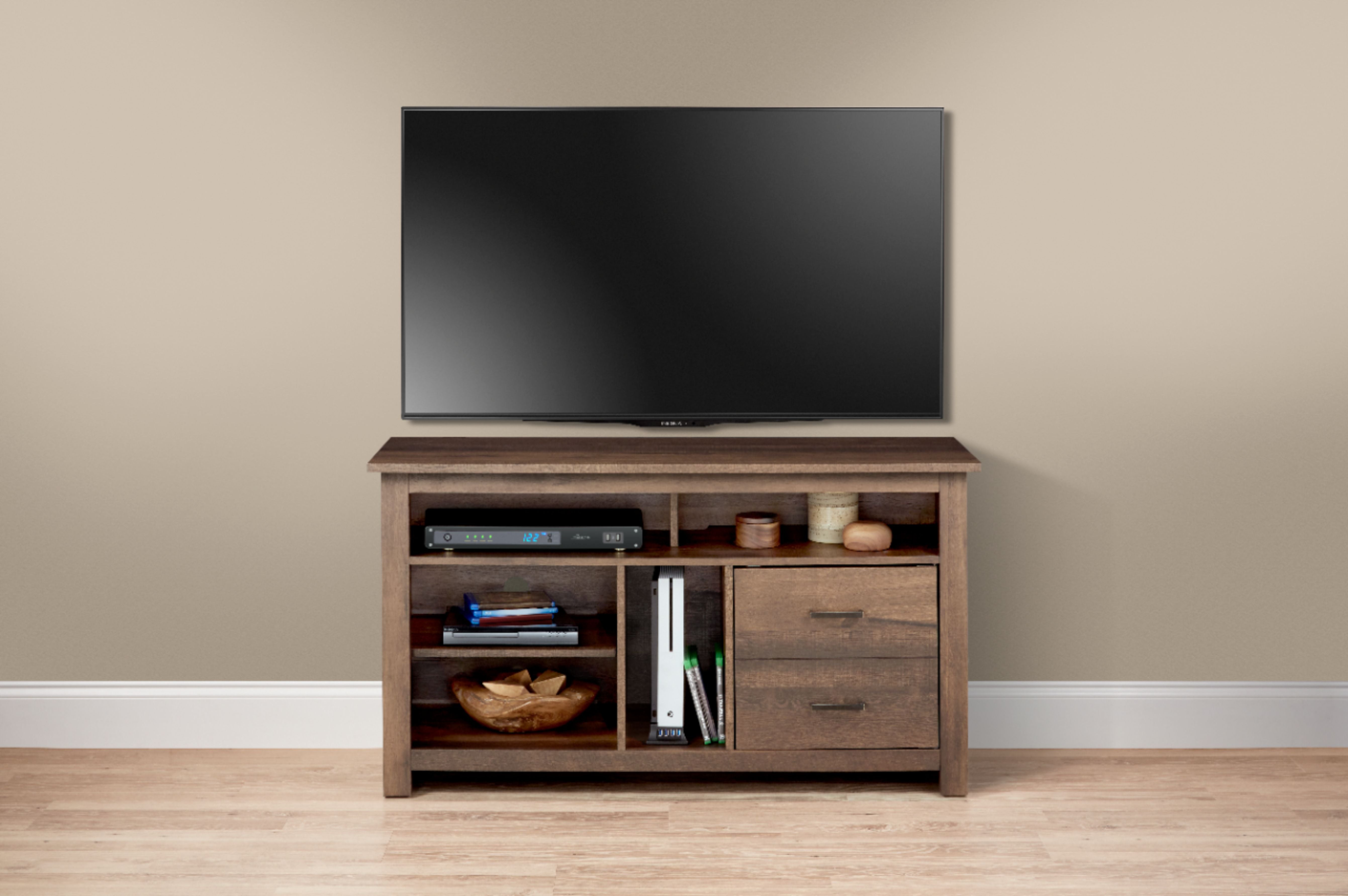 Keep gaming accessories organized with this Insignia TV stand. It has a dedicated gaming nook for consoles, two drawers to protect items from dust and five shelves for additional A/V equipment. This Insignia TV stand supports a television up to 55 inches or 60 lbs., and all mounting hardware is included for easy set up.