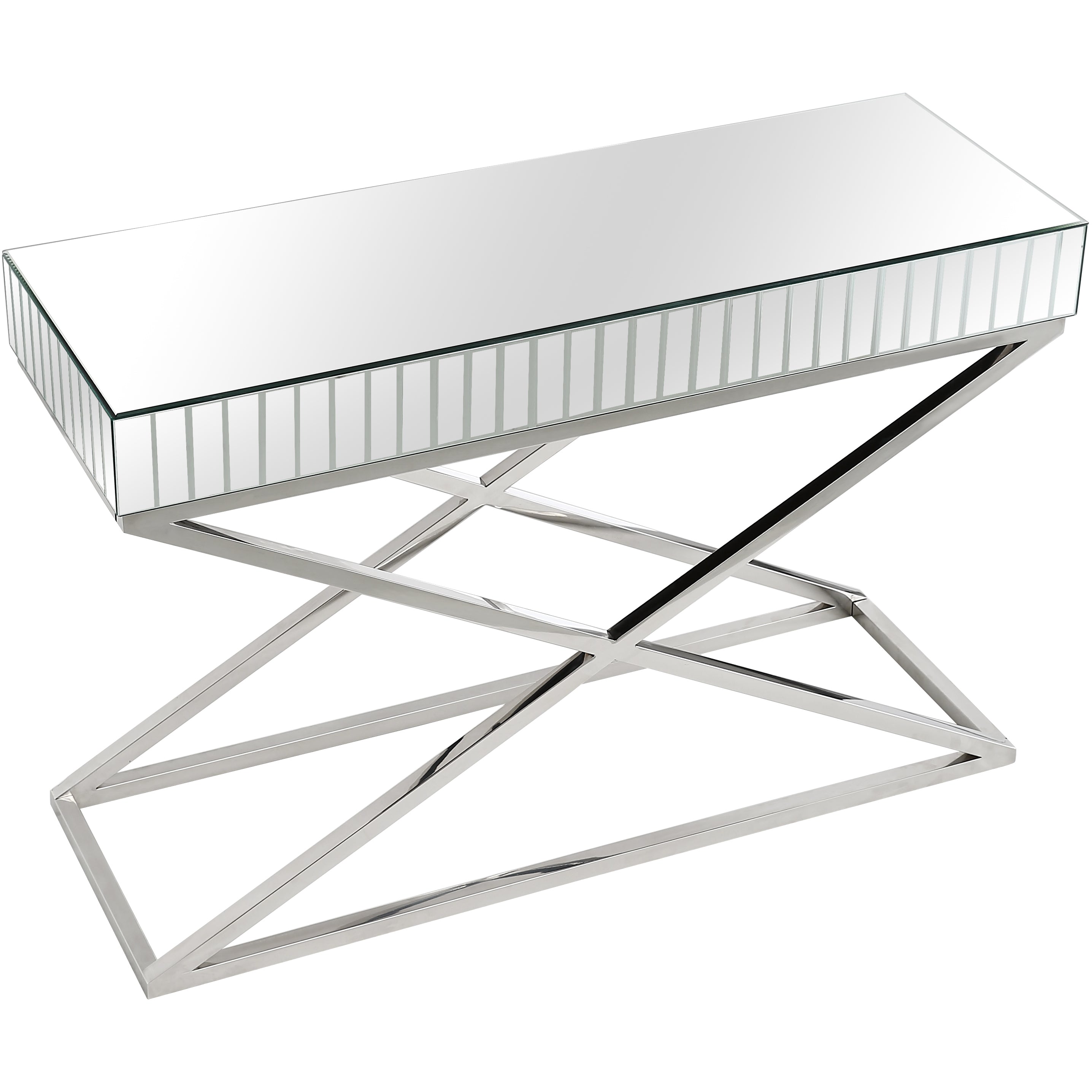 The Kinney Console covers nearly every item of a contemporary lover's wish list. This mirrored-top console offers almost 4 feet of surface area, ready to showcase an array of decorative options. Its chrome base features an "X" pattern, giving it a high-end feel from the ground up. Place this modern gem in your living, bedroom, or entryway for a design element that's sure to please. The Kinney Rectangular Accent Mirror adds a touch of elegance to any room with its bright tone and simple design. Featuring a neat rectangular frame and beveled edge, the mirror adds a subdued glow to your entryway, bedroom, or bathroom. Hang it over the fireplace to create a more sophisticated look. Beveled 29 x 42 mirror has a high quality silver backing. Ready to hang either vertically or horizontally with pre-attached hanging mounts.
