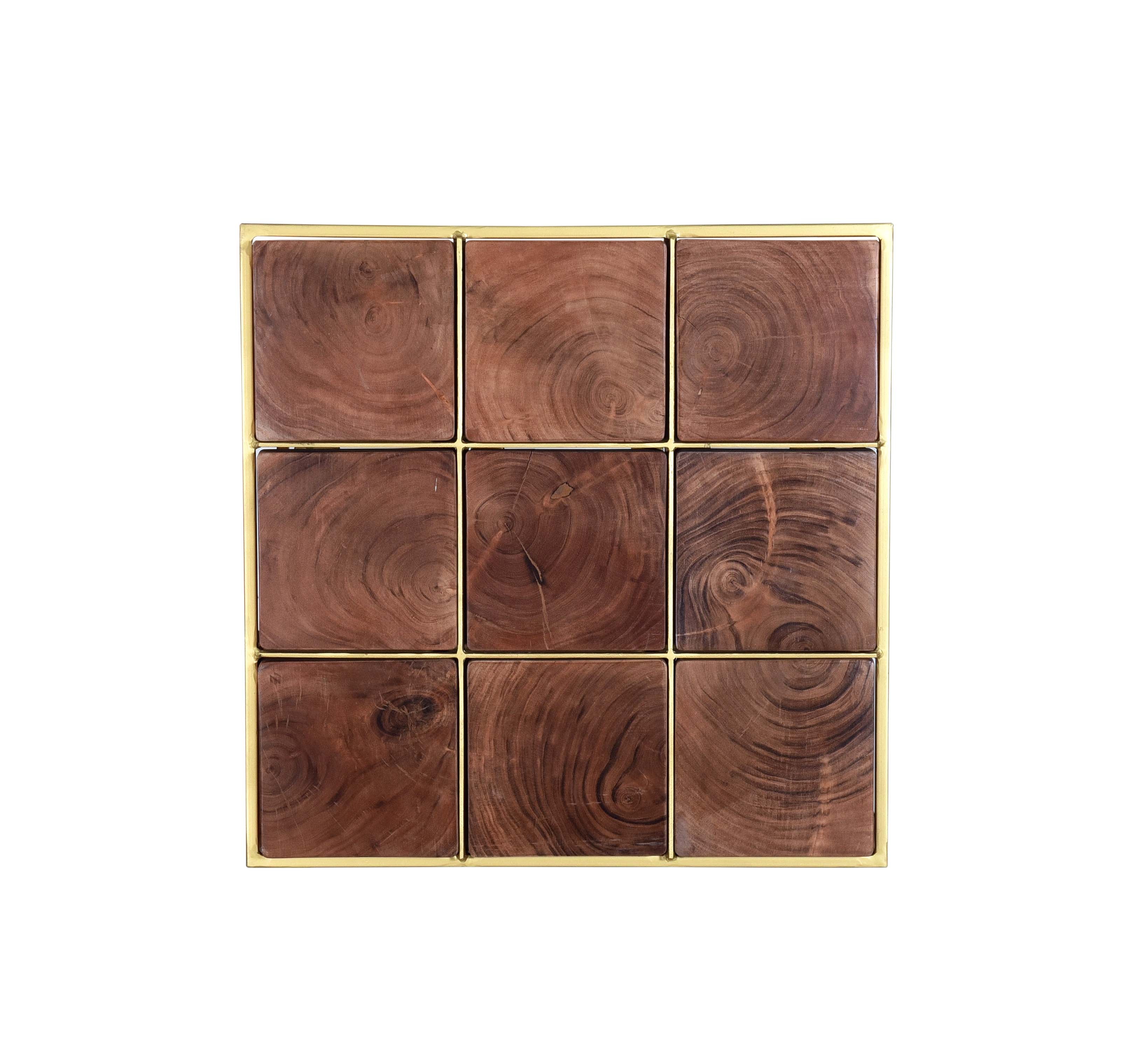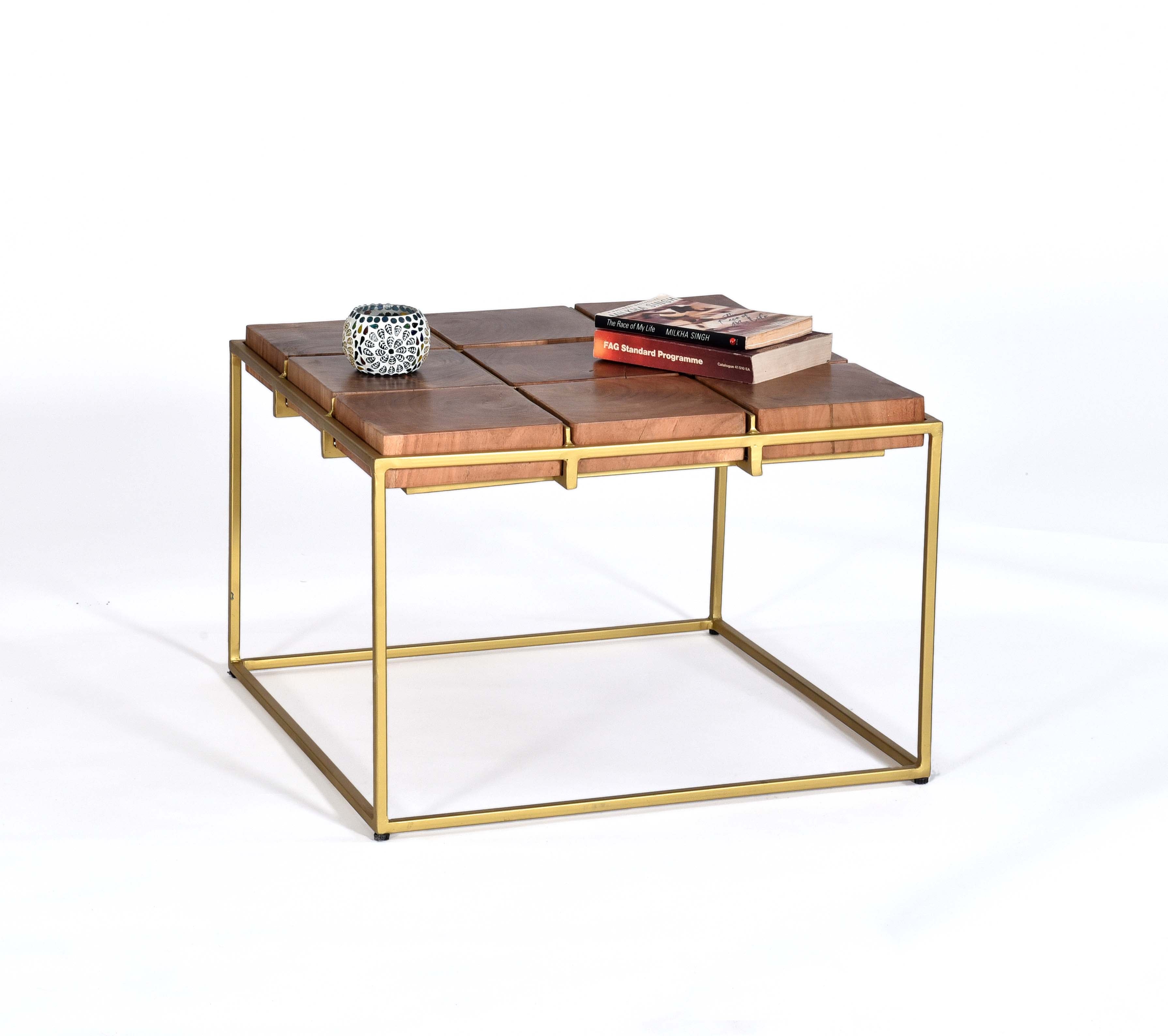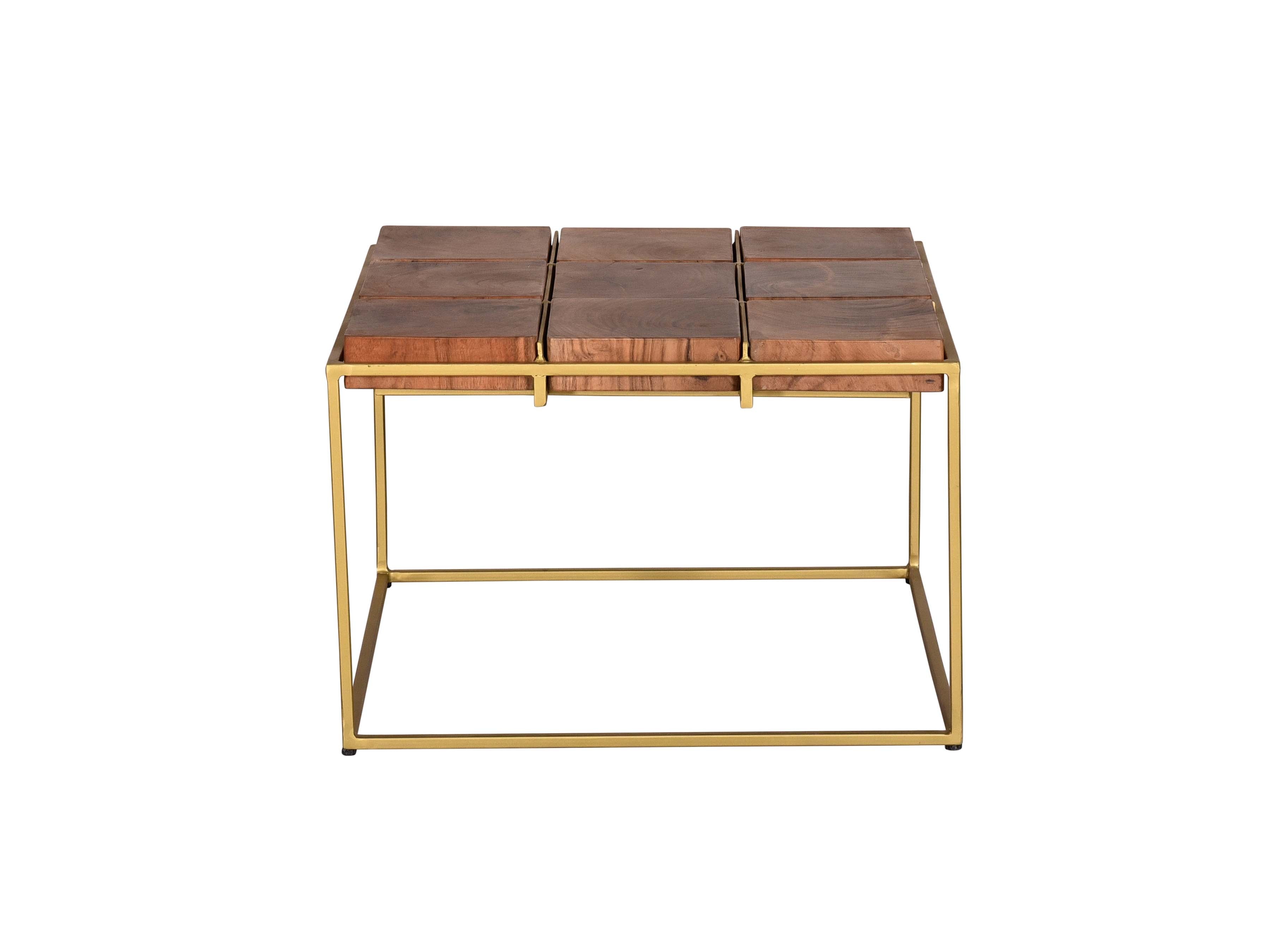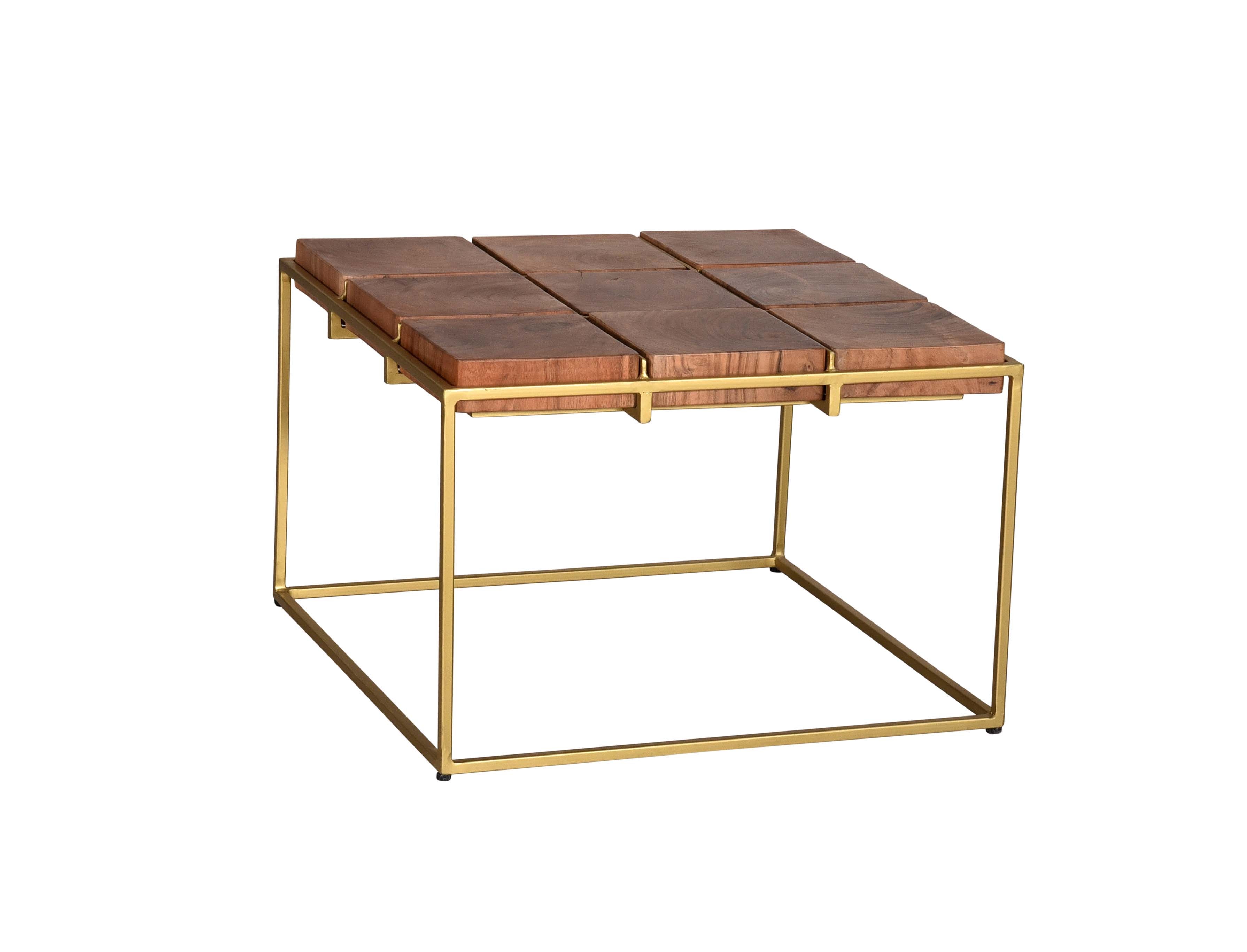 Absolutely stunning. This small table is great on it’s own but perfect when bunched with another. The table top is made of squares that sit into a very cool iron base finished in a modern brushed gold finish. Wood is finished in a natural color that highlights the acacia grains brilliantly. A great choice for your more modern cocktail table needs.