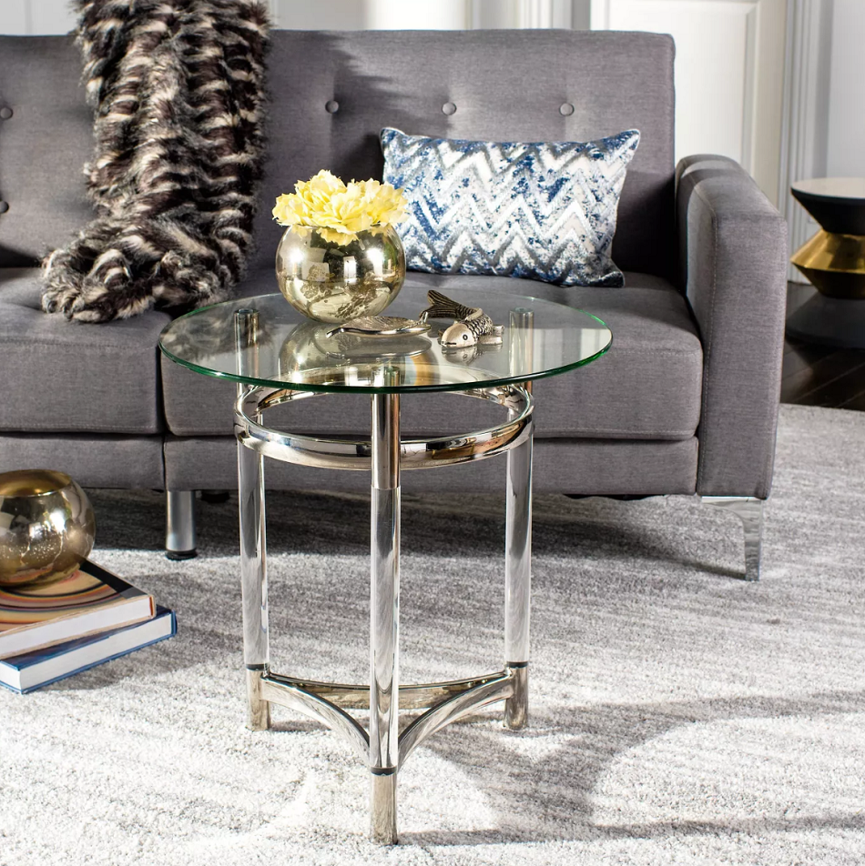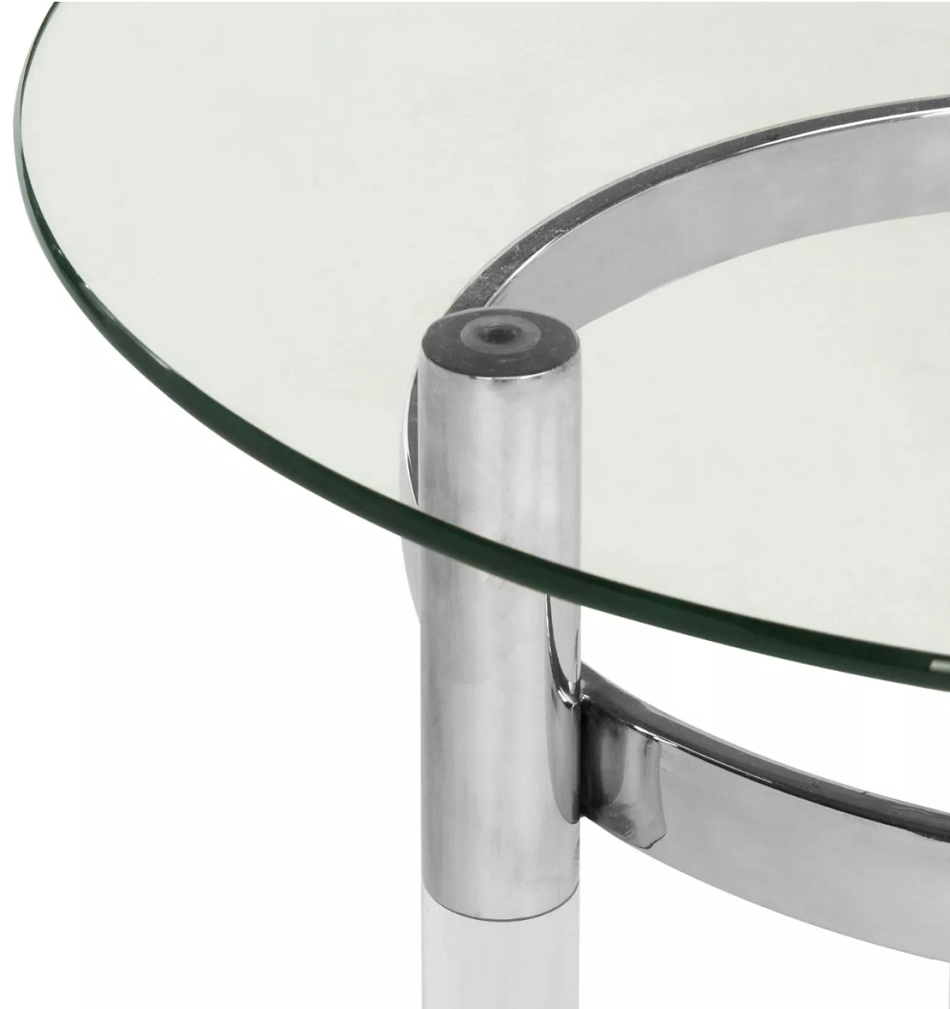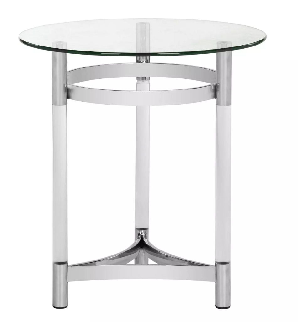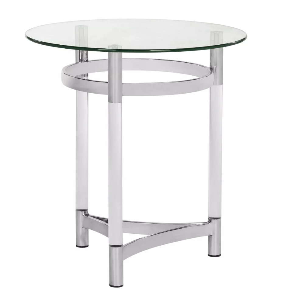 This round glass end table is an aesthetic pairing of iconic Bauhaus style and decadent vintage Italian design. A modern heirloom for any living room, it’s crafted with smooth glass and sleek acrylic. Designers love its polished stainless steel finish.