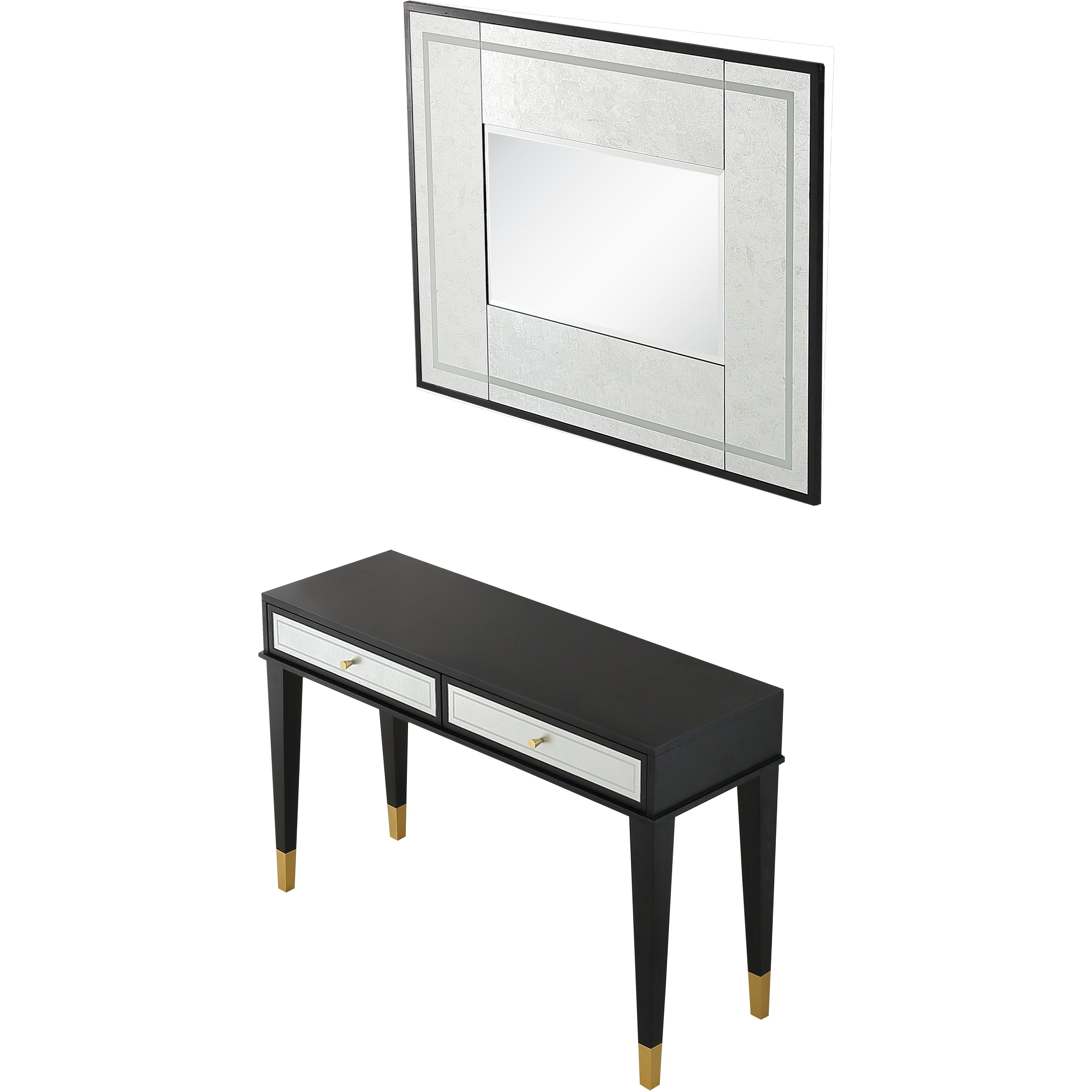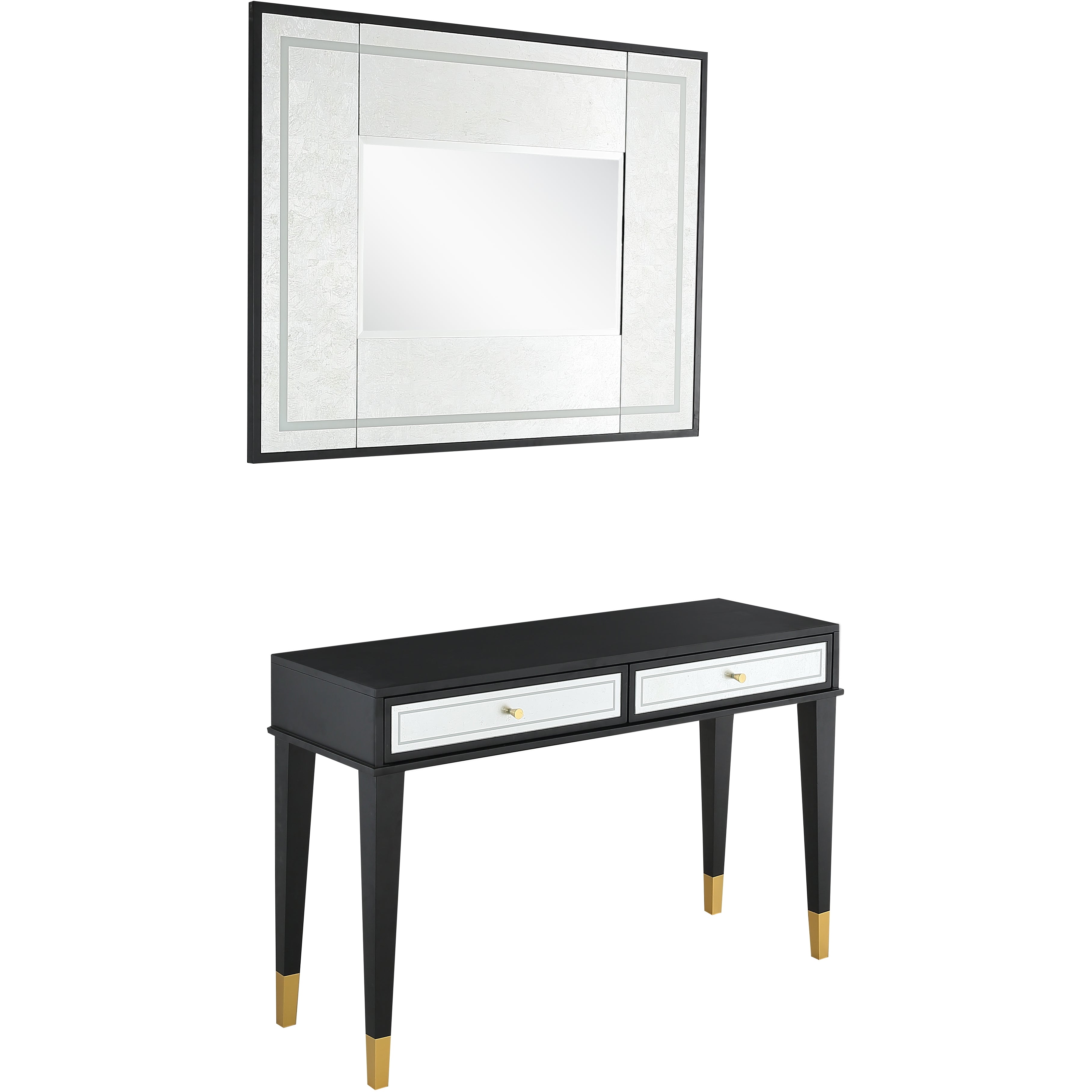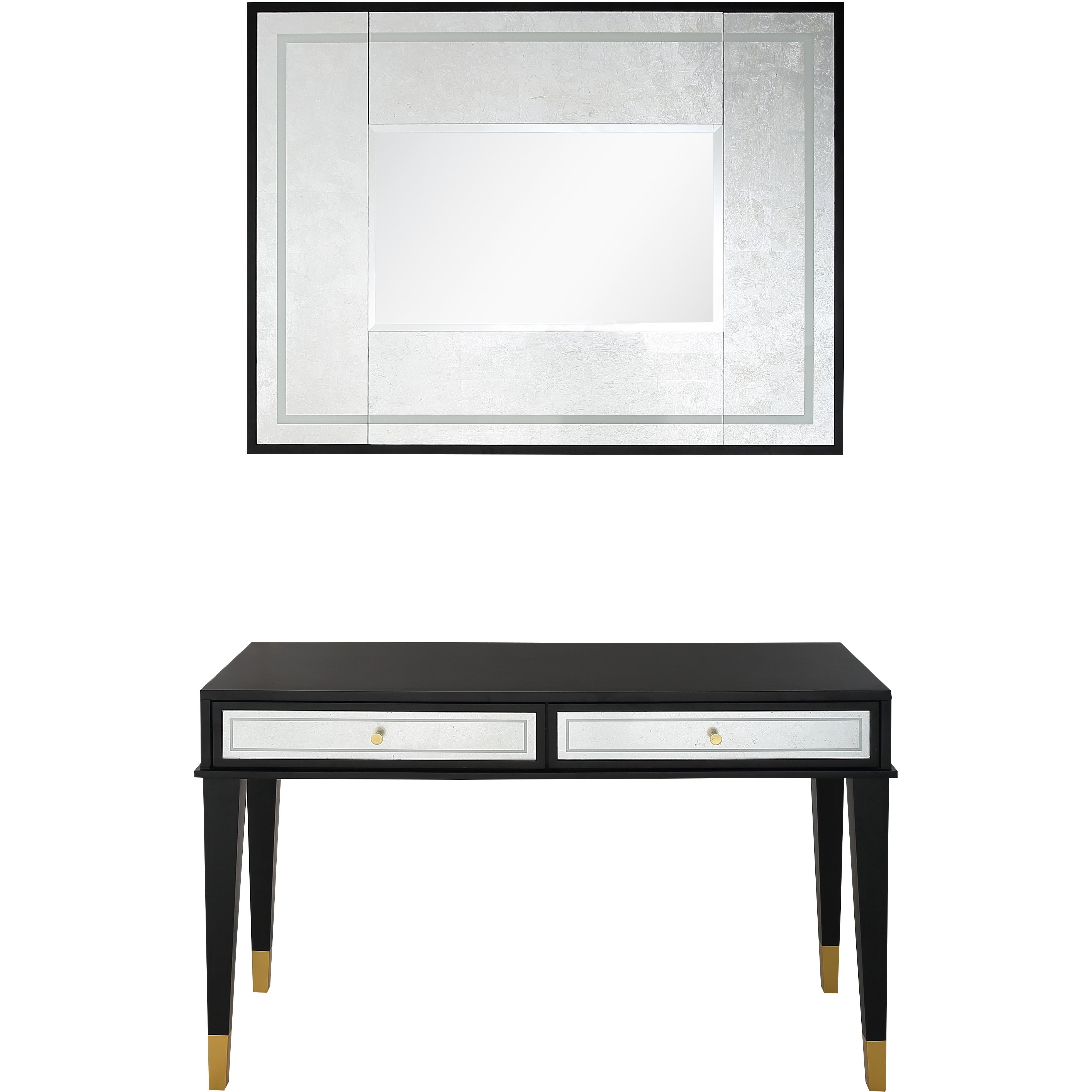 At almost 4 feet in length, this contemporary art piece is ready to create drama in the room of your choice. The Makalu Wall Mirror uses silver foil and a custom silk screening process to create a richness unparalleled. Reflect the beauty of your space in style. The Makalu Console Table pairs beautifully with our Makalu Wall Mirror, yet makes a statement all its own. With dual front drawers with a silver leaf and silkscreen motif, the Makalu Console Table is regal and spans nearly 4 feet. Add this ebony enchantress to your home today.
