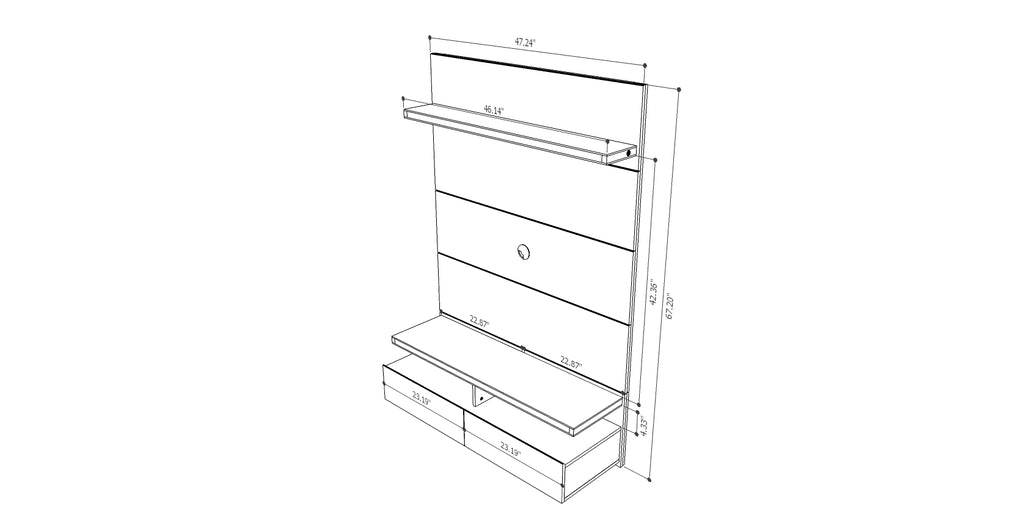 Wall Mounted Theater Center and Panel for Living Room and Bedroom use. * Upon Assembly, measures: 47.24 inches in Length, 67.24 inches in Height, 16.73 inches in Depth. * Recommended for a 42" Flat Screen TV. * Includes Brackets to Mount TV on Panel * Ample Storage Space with Media Holes for Wire Management and 1 Media Hole for TV Wire. * Features 2 Media Shelves, 2 Telescopic Drawer Slides and 1 Overhead Shelf for Picture Frames and Collectable Items. * Sophisticated Overhead Shelf Includes LED Lights. * Home Assembly Required. All Hardware Included. Recommended for Brick and Concrete Walls.