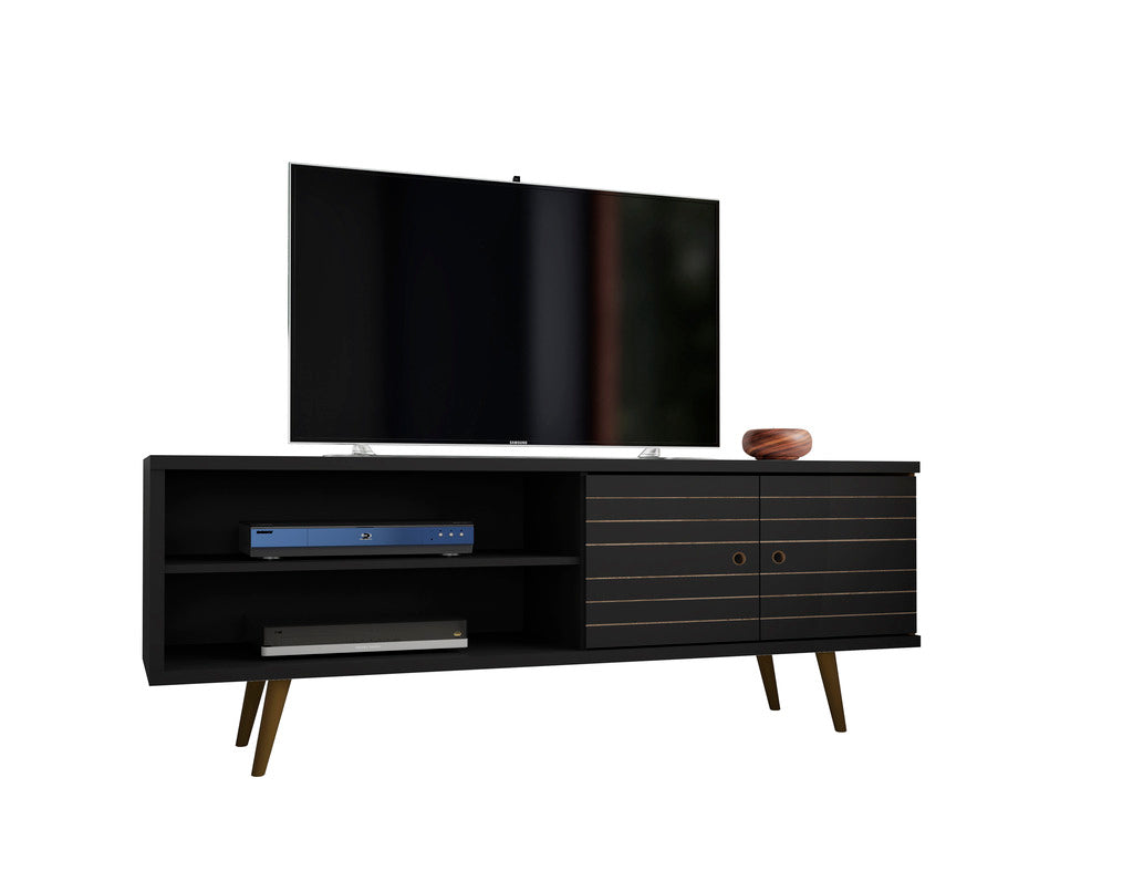 The Liberty 62.99 Mid-Century Modern TV Stand is a high quality, beautifully crafted, functional unit. Featuring two open shelves, and one large concealed compartment perfect for stashing DVDs, board games, electronics, and media accessories, this entertainment center is the ultimate gathering place and will create a statement in any space. Artful grooves mix well with any decor and splayed wooden legs add character and ease for moving.