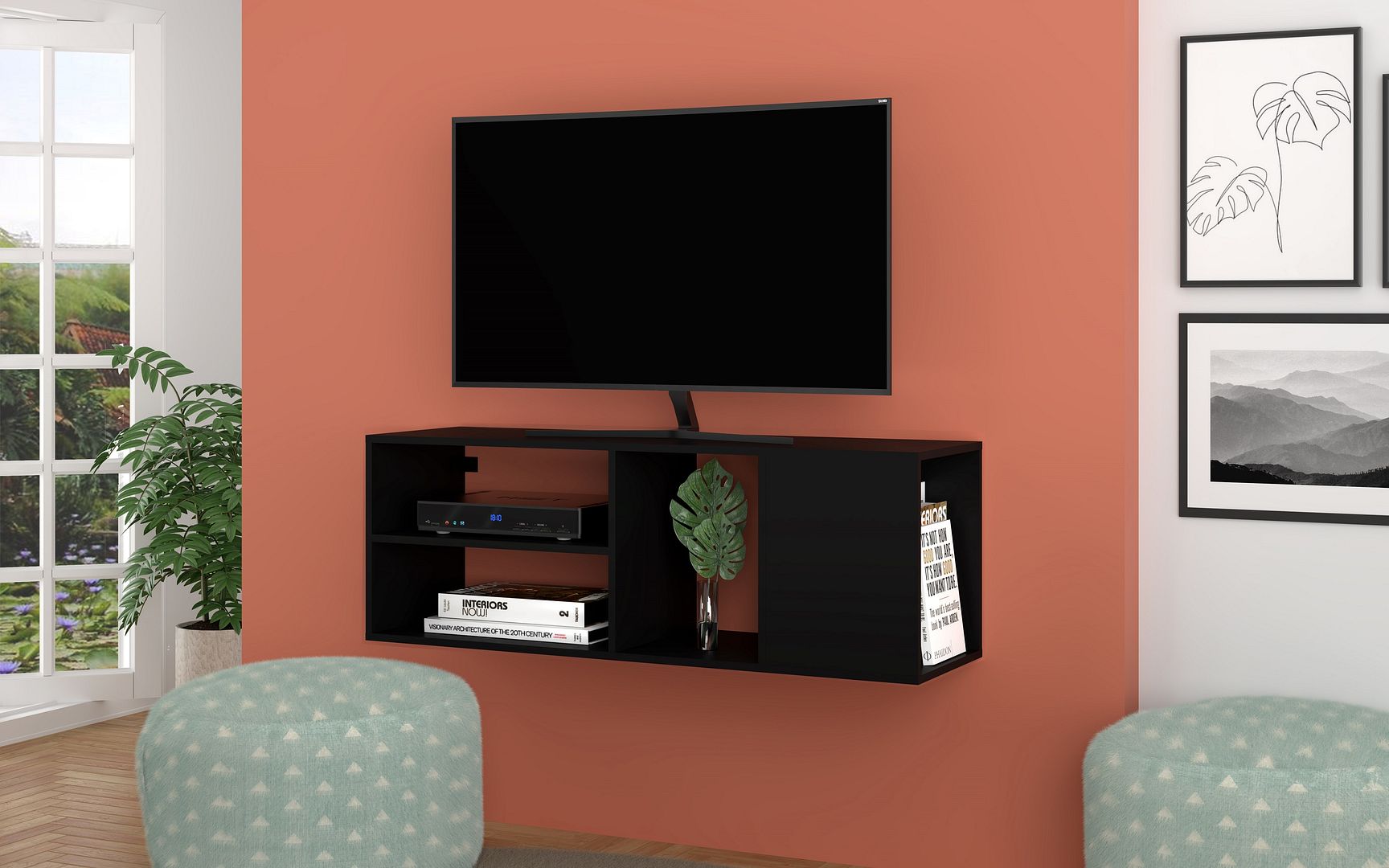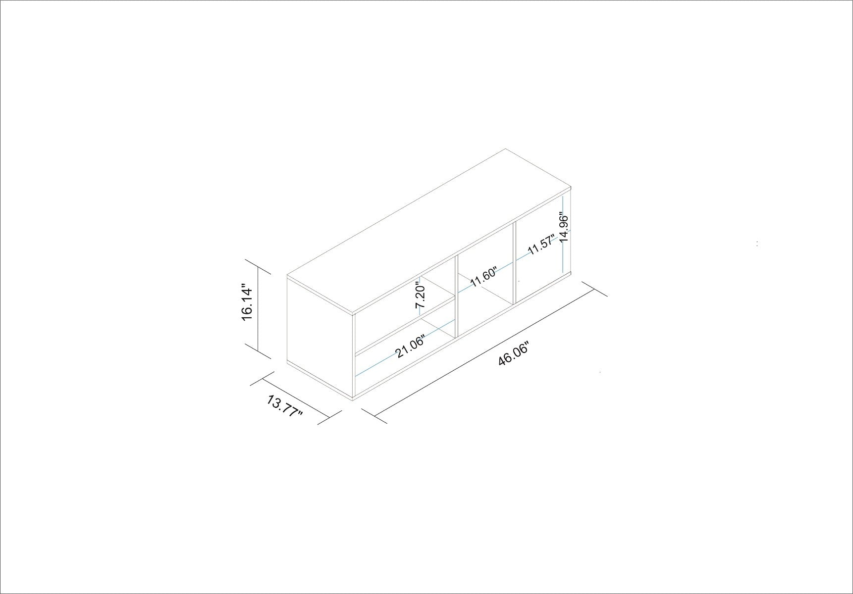 Mid- Century Modern Floating TV Panel for Bedroom or Living Room use. * Mid- Century Modern Floating TV Panel for Bedroom or Living Room use. * Recommended for a 48" TV. * Includes 4 Open Shelves for Media and Storage Use. * Feature 1 Side Cubby Shelf with Measurements of: 14.96" Height, 11.57" Depth, and 13.77" Wide * Weight Capacity: 70 Lbs. * Wall Mounting Brackets Included. * Home Assembly Required. All Hardware Included.