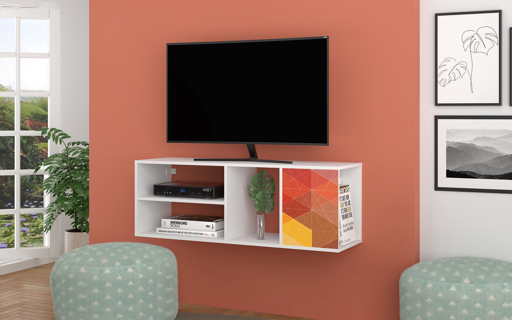 Mid- Century Modern Floating TV Panel for Bedroom or Living Room use. * Mid- Century Modern Floating TV Panel for Bedroom or Living Room use. * Recommended for a 48" TV. * Includes 4 Open Shelves for Media and Storage Use. * Feature 1 Side Cubby Shelf with Measurements of: 14.96" Height, 11.57" Depth, and 13.77" Wide * Weight Capacity: 70 Lbs. * Wall Mounting Brackets Included. * Home Assembly Required. All Hardware Included.