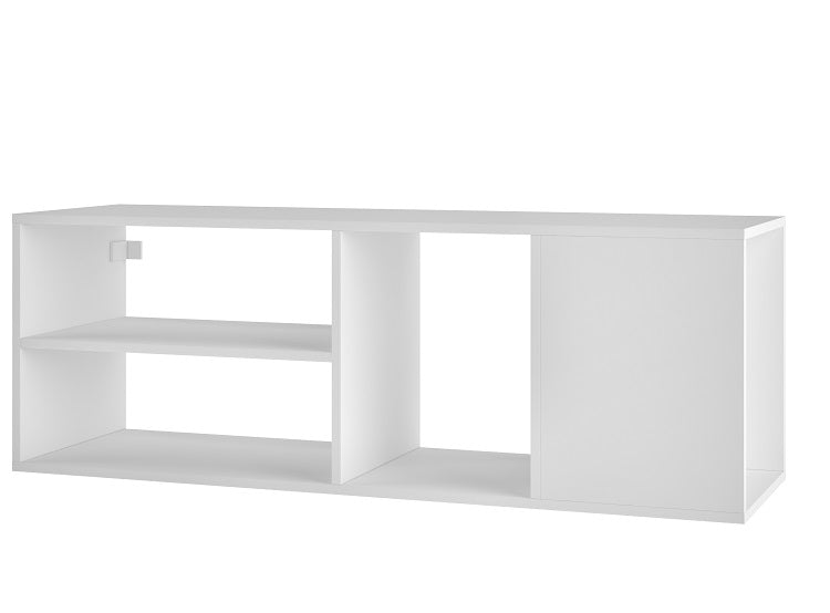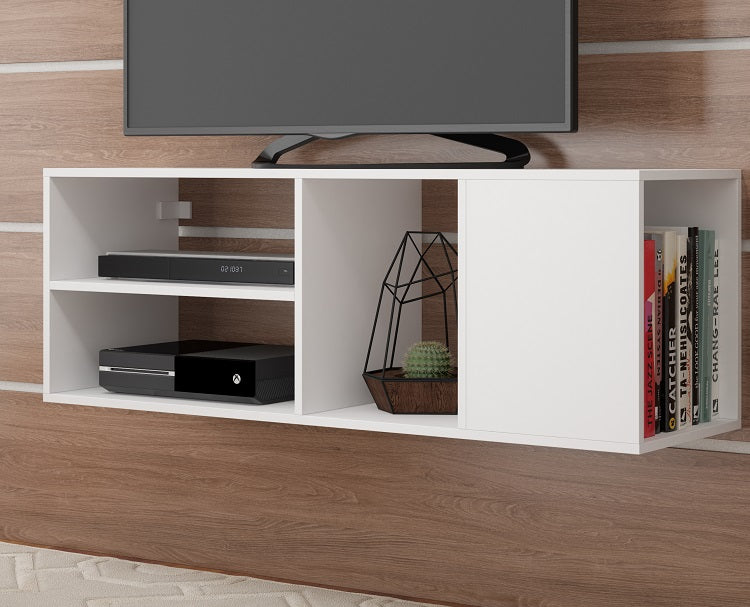 Mid- Century Modern Floating TV Panel for Bedroom or Living Room use. * Upon Assembly, Measures: 46.06 in. Length, 16.14 in. Height, 13.77 in. Depth. * Recommended for a 48" TV. * Includes 4 Open Shelves for Media and Storage Use. * Feature 1 Side Cubby Shelf with Measurements of: 14.96" Height, 11.57" Depth, and 13.77" Wide * Weight Capacity: 70 Lbs. * Wall Mounting Brackets Included. * Home Assembly Required. All Hardware Included.