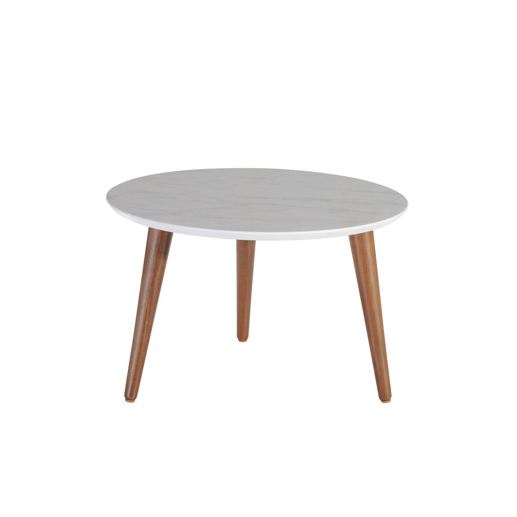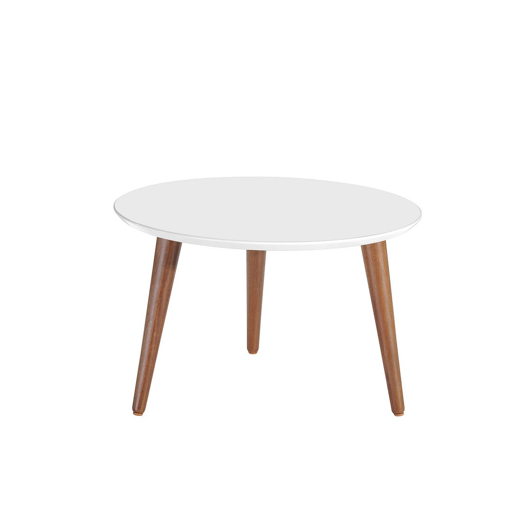 Round Coffee and Accent Table for Living Room and Dining Room use. * Upon Assembly, Measures: 23.62 in. Length, 14.96 in. Height, 23.62 in. Depth. * Geometric 3 - Leg Base Design. * Solid Wood Splayed Legs for Fashion Statement Design and Product Durability. * Mix and Match: Get the Collection! Give your End Tables a Stacked Look with Manhattan Comfort Moore End Tables. * Made of High Quality MDF with Painted Smooth Gloss Finish. * Minor Feet Assembly Required. All Hardware Included. *