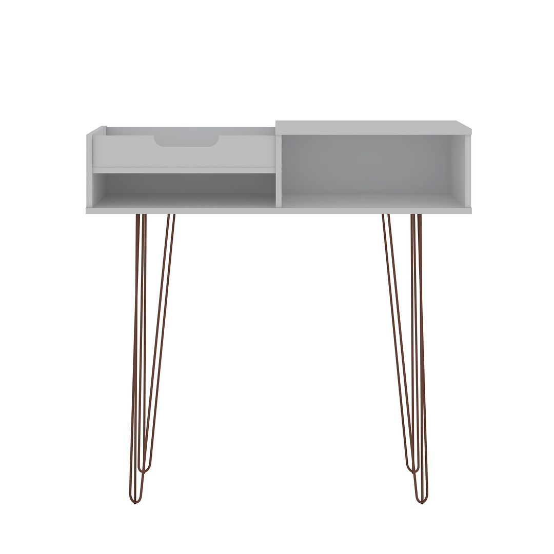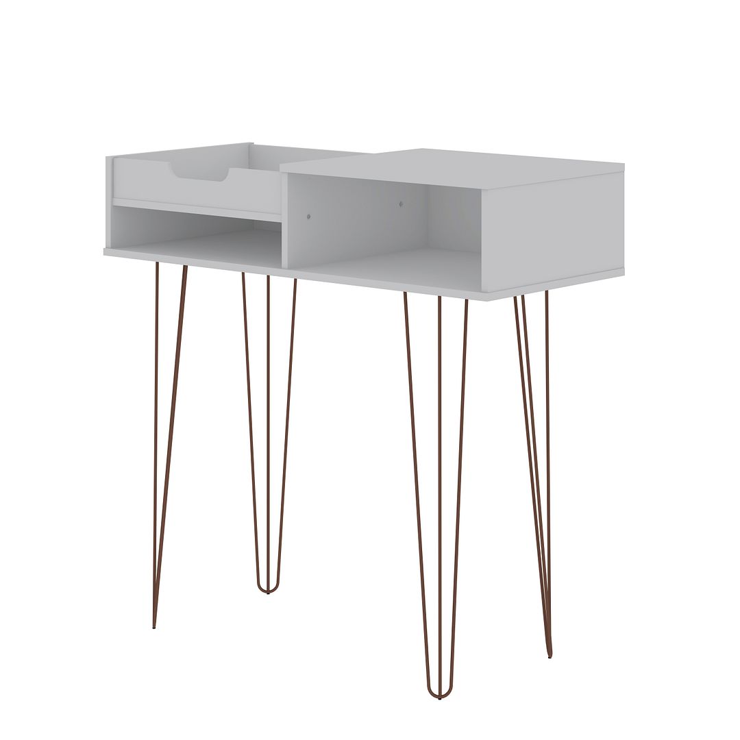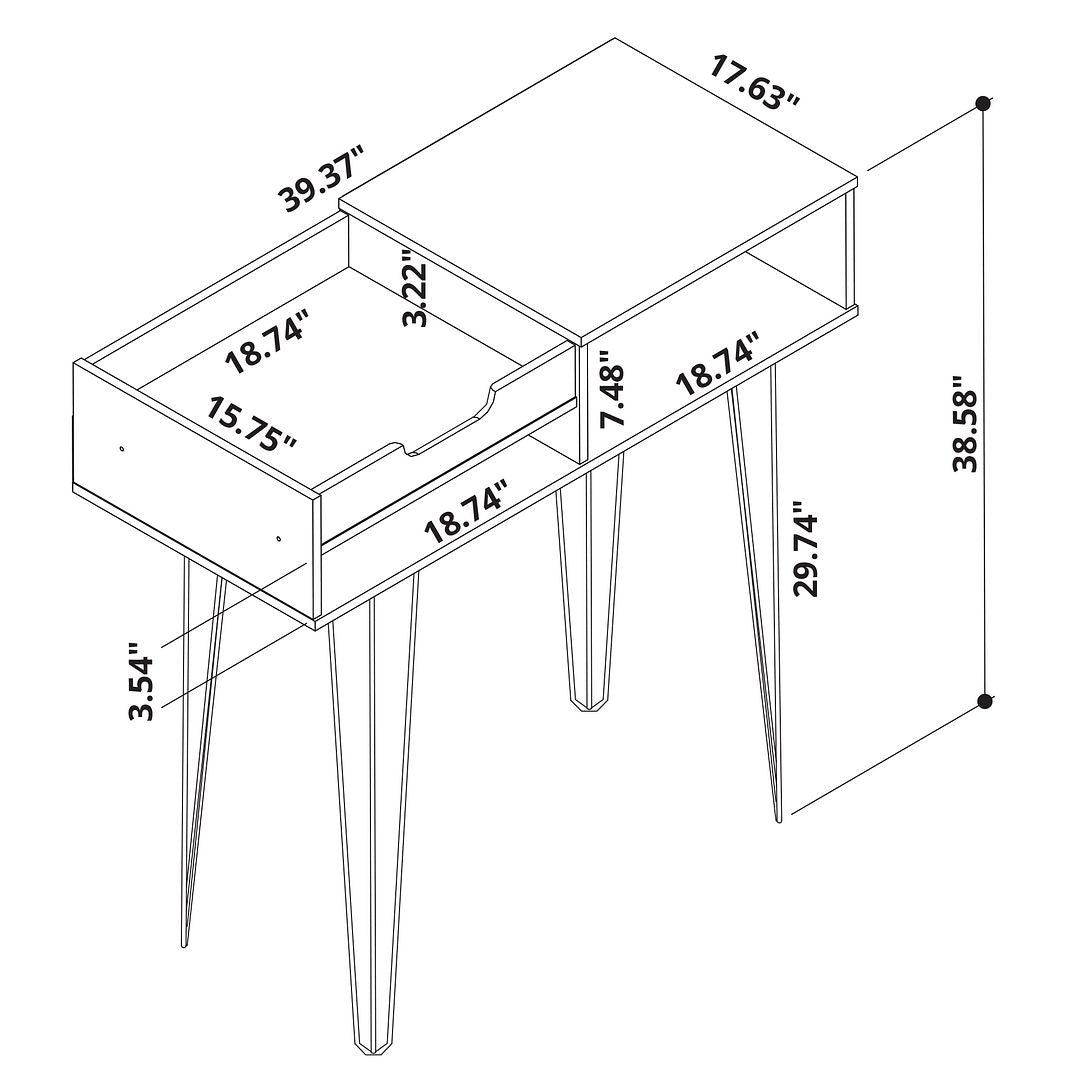 Modern Console Perfect for Entryway, Living Room, Home Office and Dinging Room Use. * Upon Assembly, Measures: 39.37 in. Length, 38.58 in. Height, 17.63 in. Depth. * Includes 1 Large Open Shelf, 1 Narrow Open Shelf, and a Half Open Top board with a Fixed Tray Design Shelf. * Internal Left Cubby 18.74" Length and 7.48" Height. Lower Cubby 18.74" Length and 3.54" Height. * Fashionable Wire Splayed Legs Made of Metal for Extra Durability. * Perfect to Store Wine Bottles for your Dining Room, or use for Entryway or Bedroom Makeup Storage Display! * Made of High Quality MDF with Painted Finish. * Home Assembly Required. All Hardware Included.