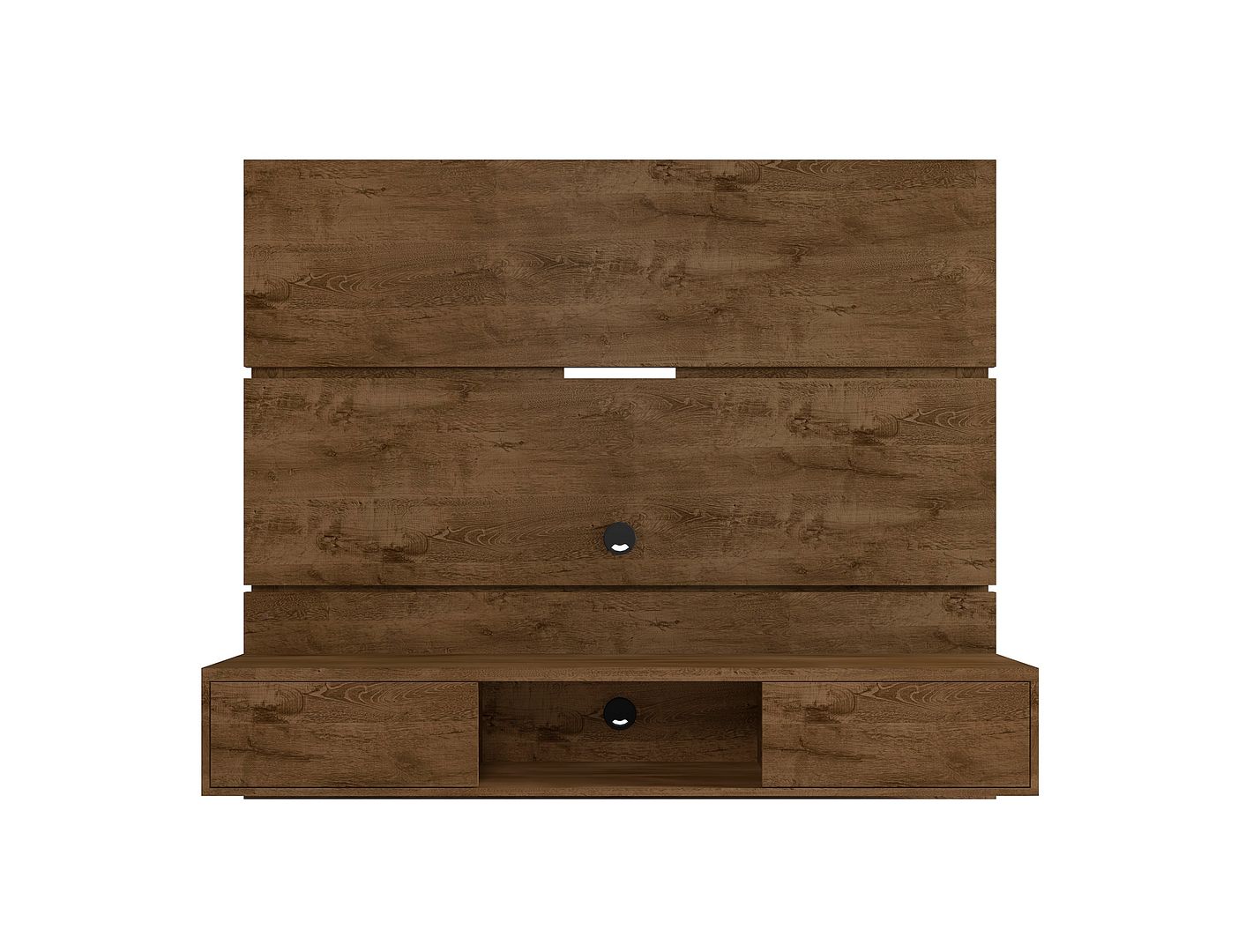 Mid-Century Modern Wall Mounted Theater Center for Living Room and Bedroom use. * Upon Assembly, Measures: 62.99 in. Length, 53.54 in. Height, 12.87 in. Depth. * Recommended for up to a 55" TV. * Features 1 TV Media Hole and 1 Lower Grommet for Wire and Cable Management. * Lateral Plank Panel Design with 2 Concealed Shelving Spaces, and 1 Open Shelf for Media and Décor. * Brackets to Mount TV on Panel Included. * Includes 2 Flip Down Doors * Home Assembly Required. All Hardware Included.