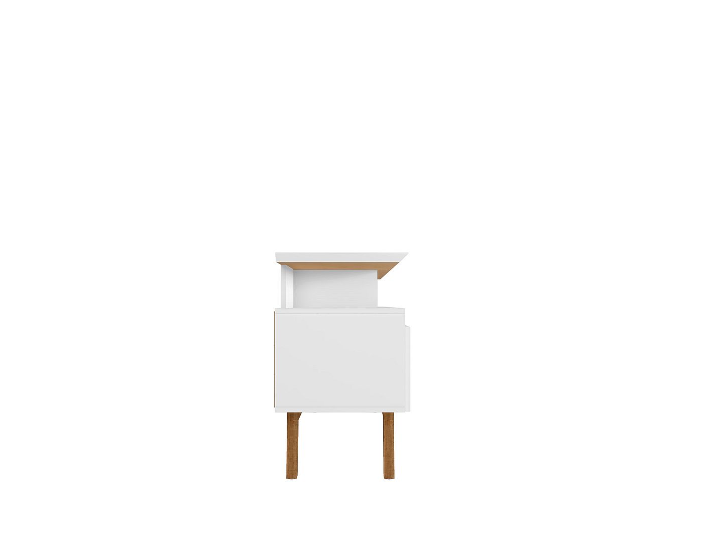 Center your living space with the Yonkers TV stand that is the best of mid-century modern and functionality all in one beautifully crafted piece. Splayed legs and a streamlined silhouette easily blend with any existing decor and open and concealed storage perfectly display and tuck away media accessories, magazines, family photo albums, games, and more. Three lower drop-down style doors reveal open space, while open upper shelving showcases and keeps items easily accessible. Add framed pictures up top or decorative accents to personalize your space and make it your own.