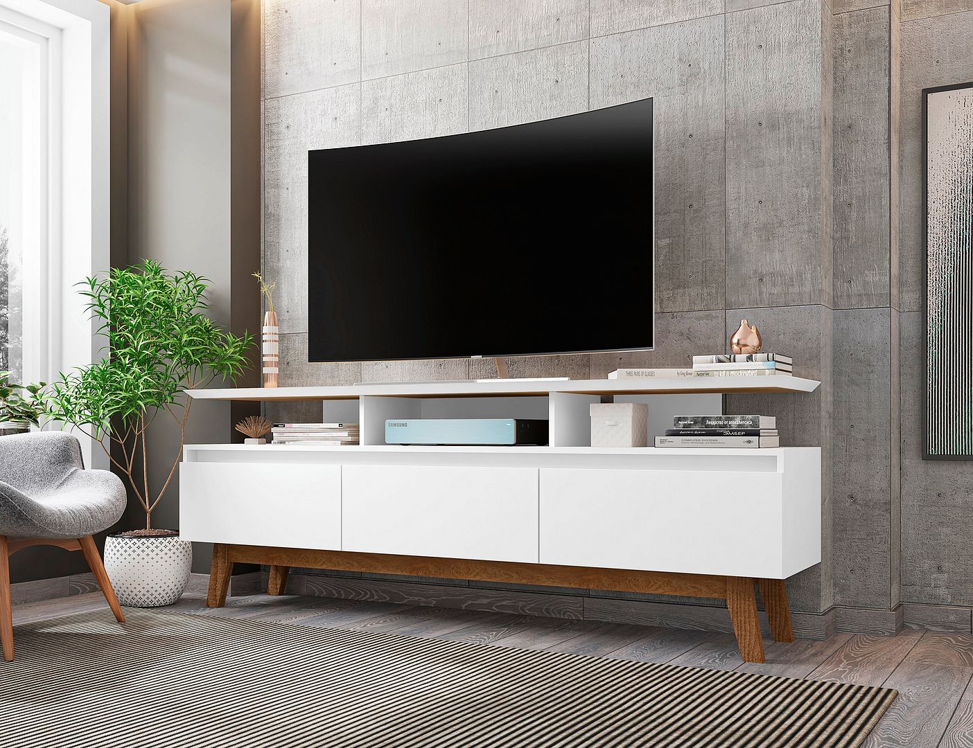 Mid-Century Modern TV Stands for Living Room and Bedroom use. * Upon Assembly, Measures: 70.86 in. Length, 25.79 in. Height, 14.76 in. Depth. * Recommended for up to a 65" TV. * Features 3-Flip Down Doors for Concealed Storage and 3 Open Media Shelves. * Includes 1 Media Hole for Wire and Cable Management. * Geometric Open Floating Top Shelf with Beveled Design. * Fashionable Framed Base Splayed Legs made from Solid Wood for Extra Durability. * Home Assembly Required. All Hardware Included.