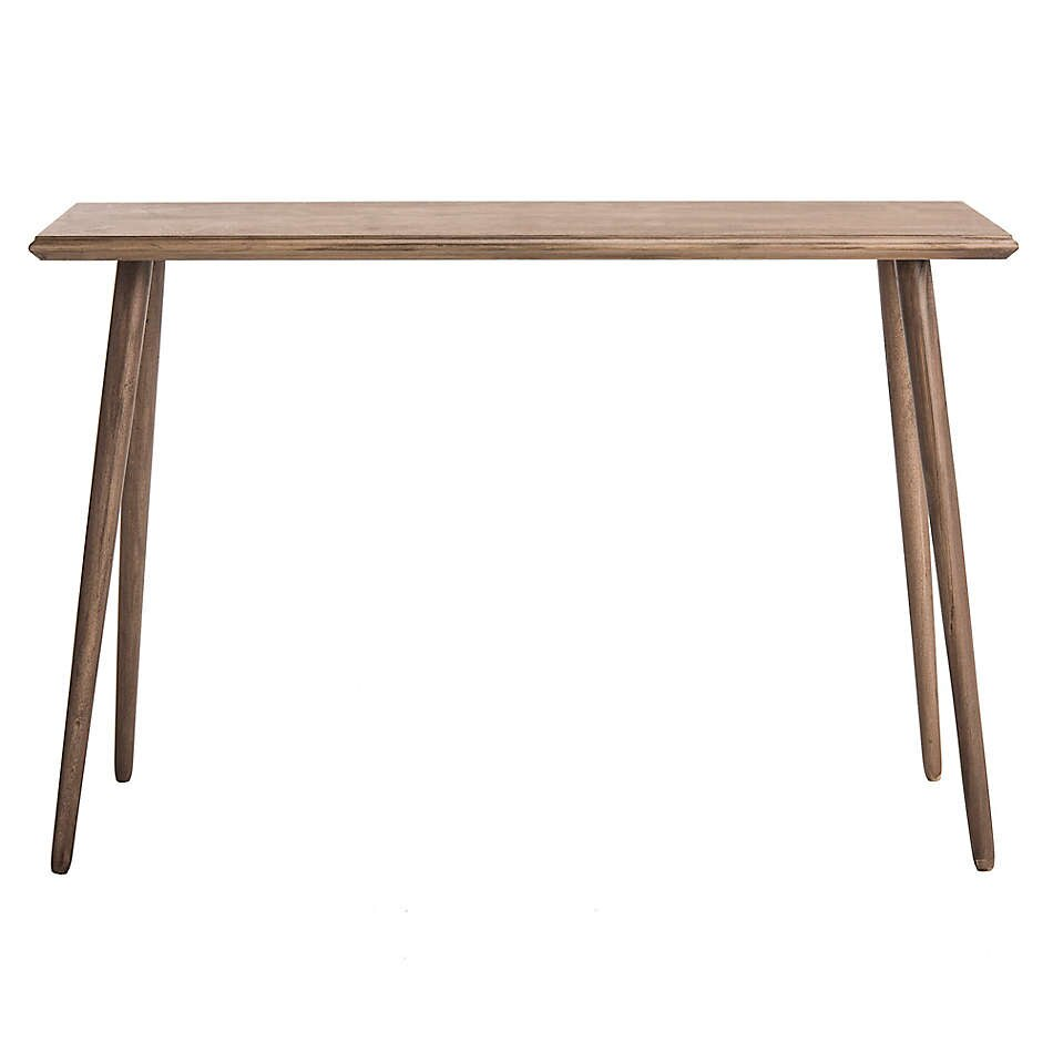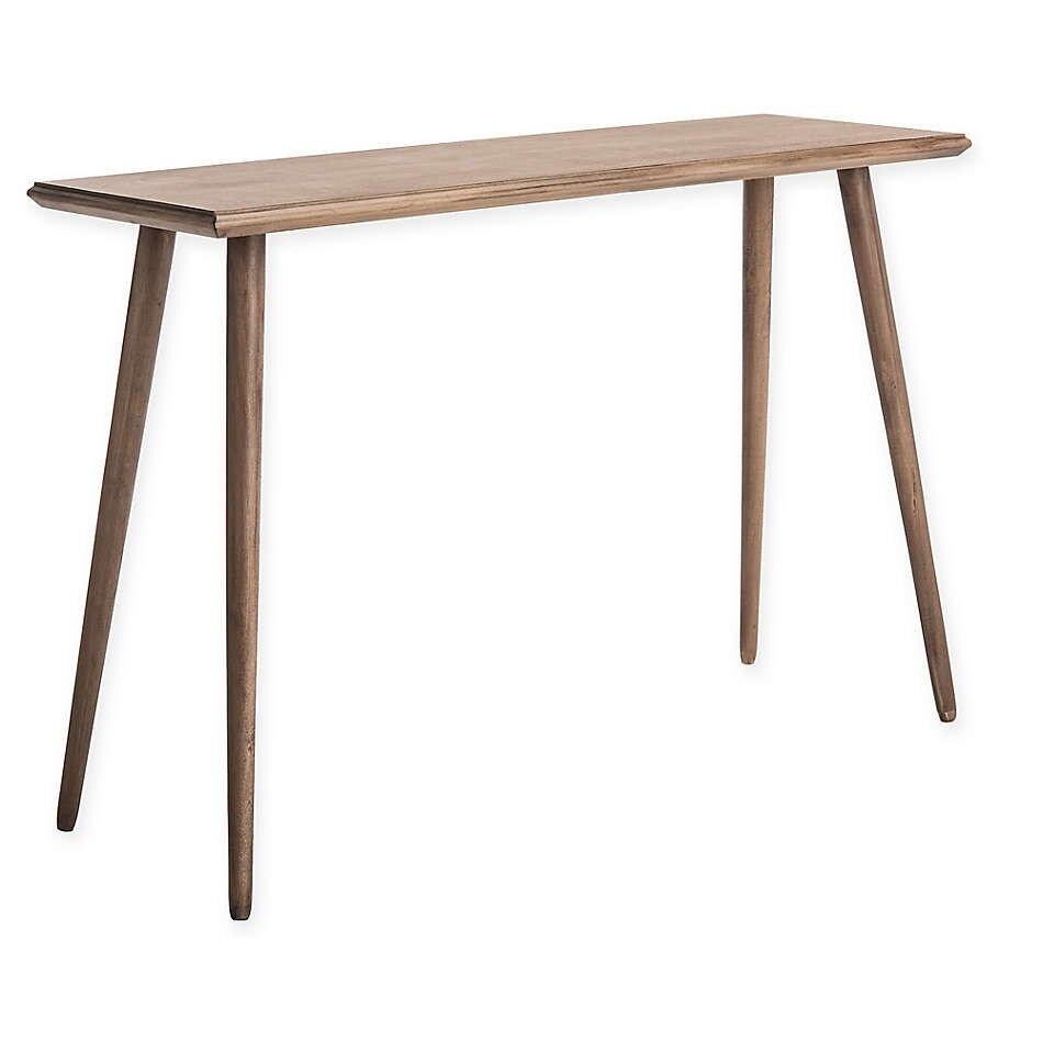 Crafted with a pine wood blend, this modern console table features a smooth top paired with curved, sleek legs that make a sophisticated statement in any contemporary interior. Its milk chocolate hue was created by a special water-based paint finish.