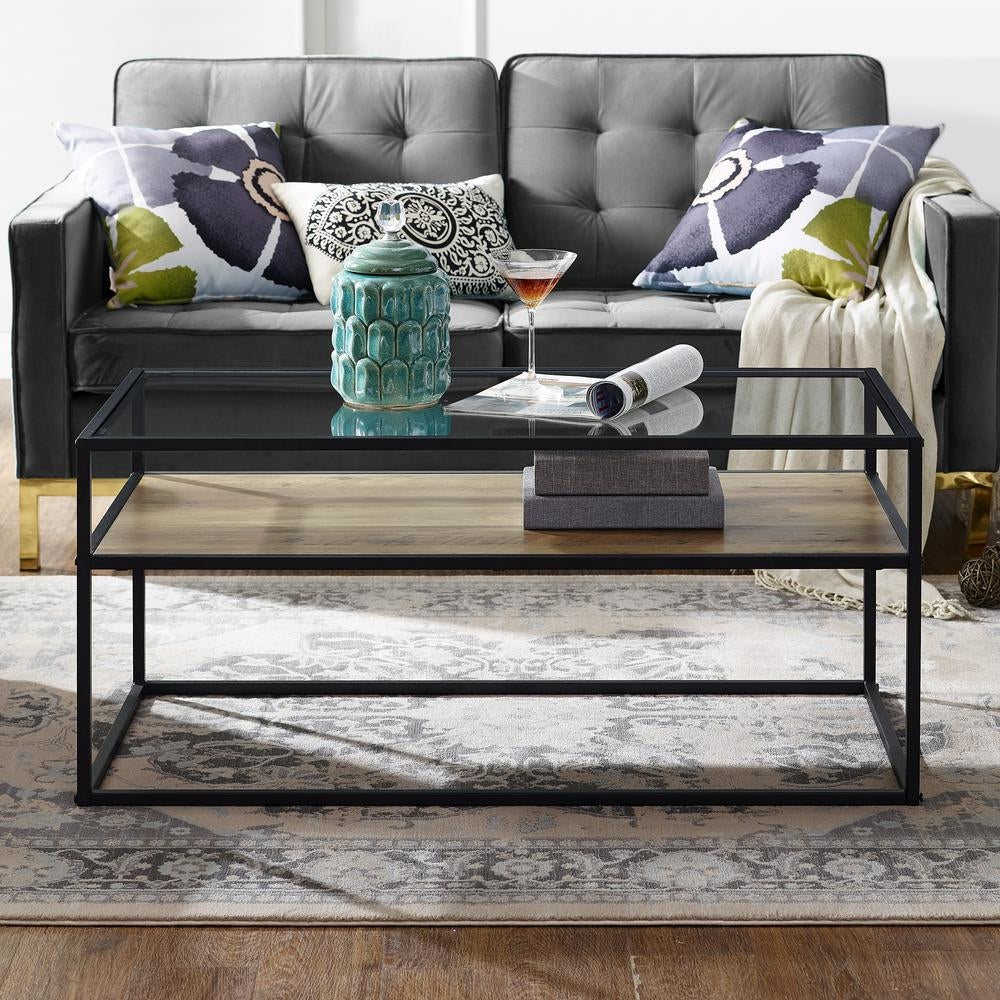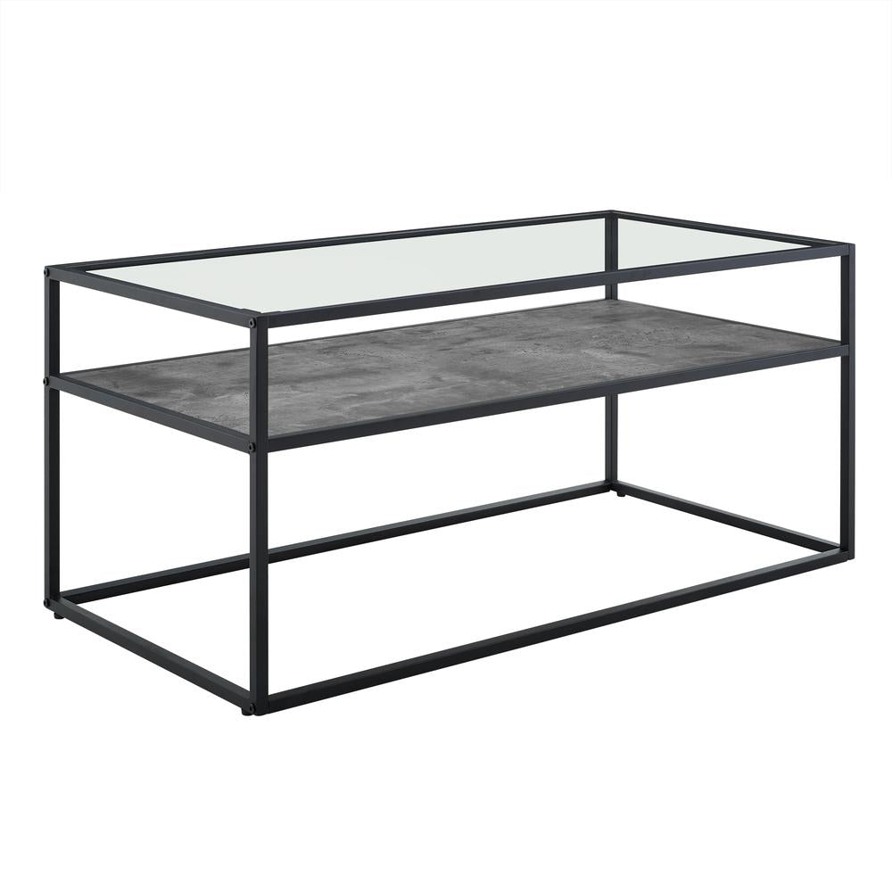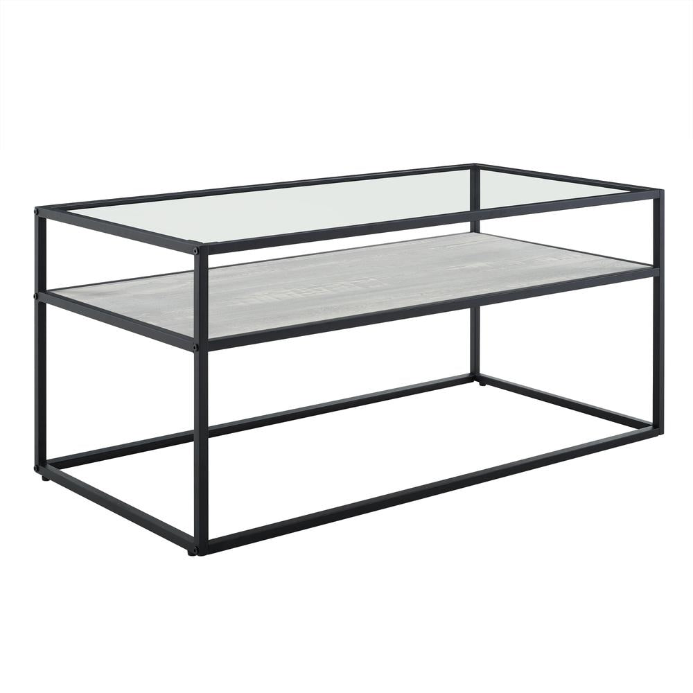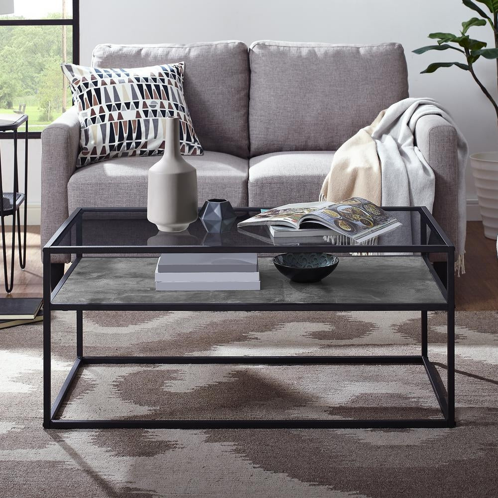 Versatile in design, this modern coffee table offers you the option to instantly change the look of your living room. Flip the rustic oak shelf over to showcase a stone grey finish for a compelling and stunning new look. With a metal frame and glass table top for a sleek, urban industrial design style that complements with the lower reversible laminate shelf. Enjoy decorating this coffee table with flowers, plants, candles, and magazines in front of your couch as it will create a stylish statement to your space.