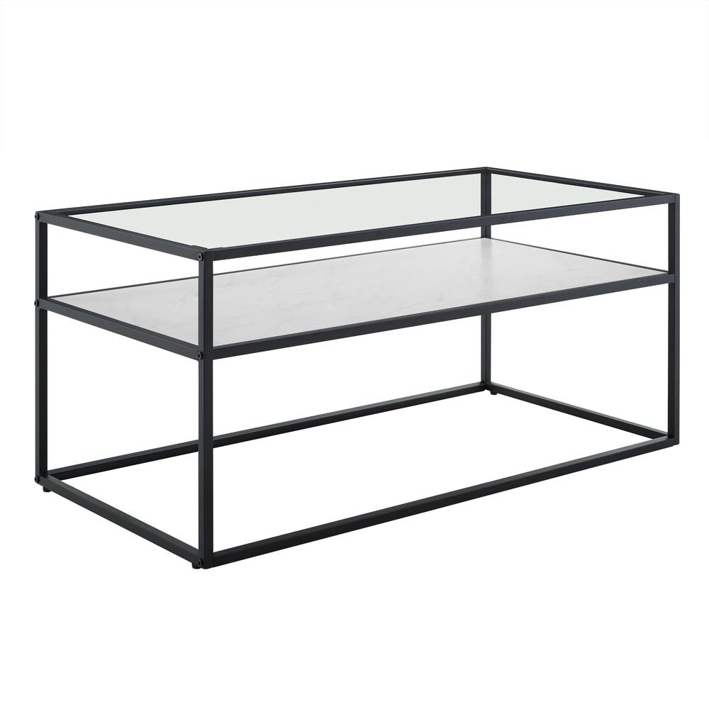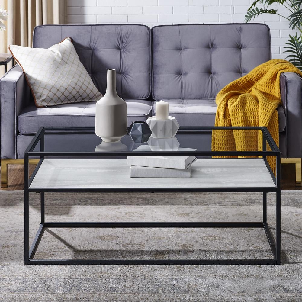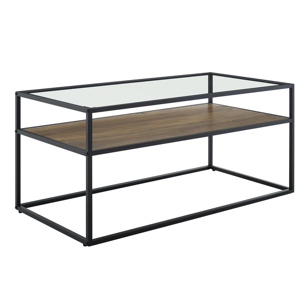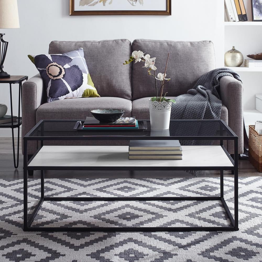 Versatile in design, this modern coffee table offers you the option to instantly change the look of your living room. Flip the rustic oak shelf over to showcase a stone grey finish for a compelling and stunning new look. With a metal frame and glass table top for a sleek, urban industrial design style that complements with the lower reversible laminate shelf. Enjoy decorating this coffee table with flowers, plants, candles, and magazines in front of your couch as it will create a stylish statement to your space.