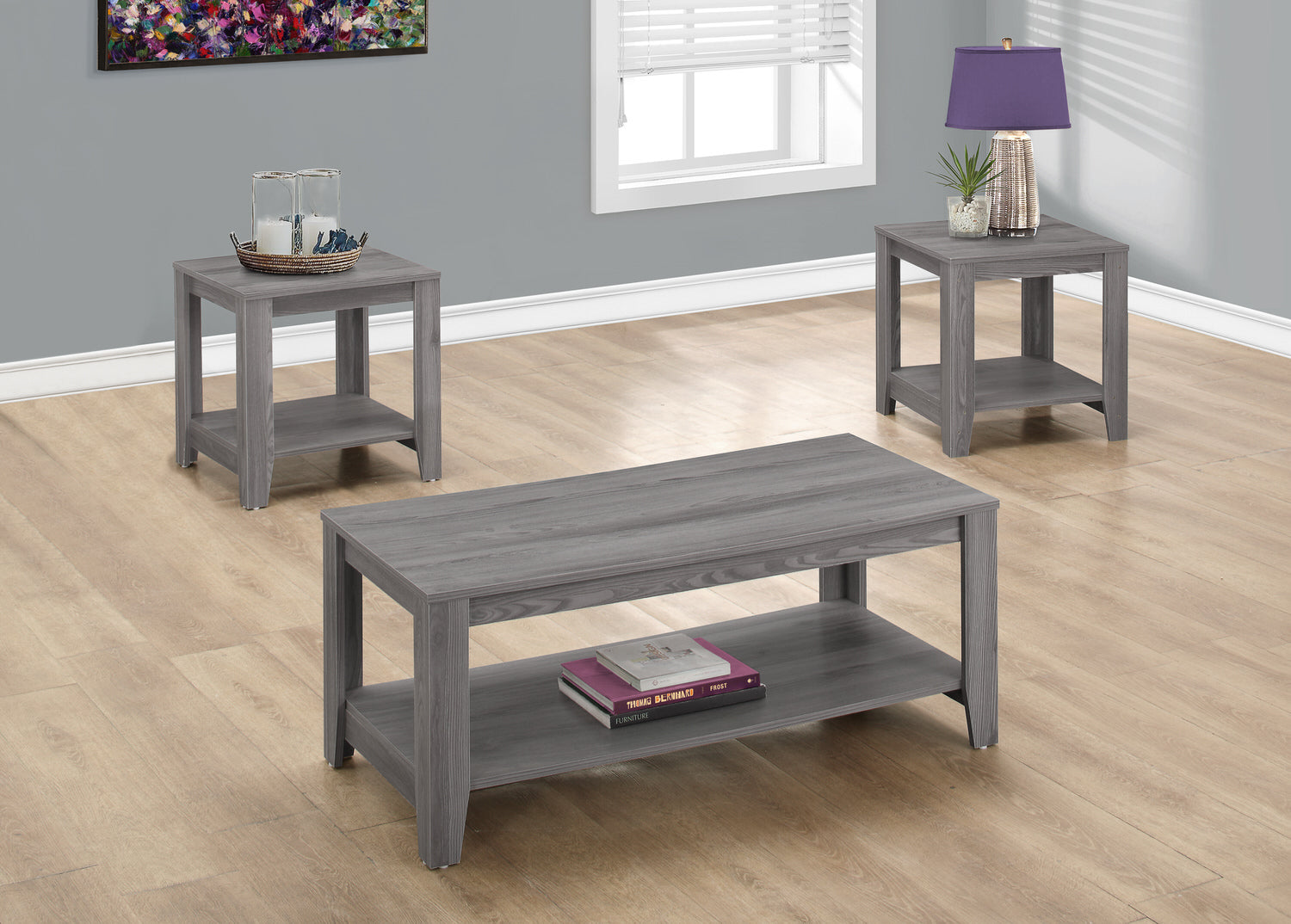 This versatile accent table set includes a rectangular coffee table and two matching end tables that make a stylish addition to casual or contemporary decor. A sophisticated grey finish wraps the tables, which feature lower shelves that offer additional space for storage or display.