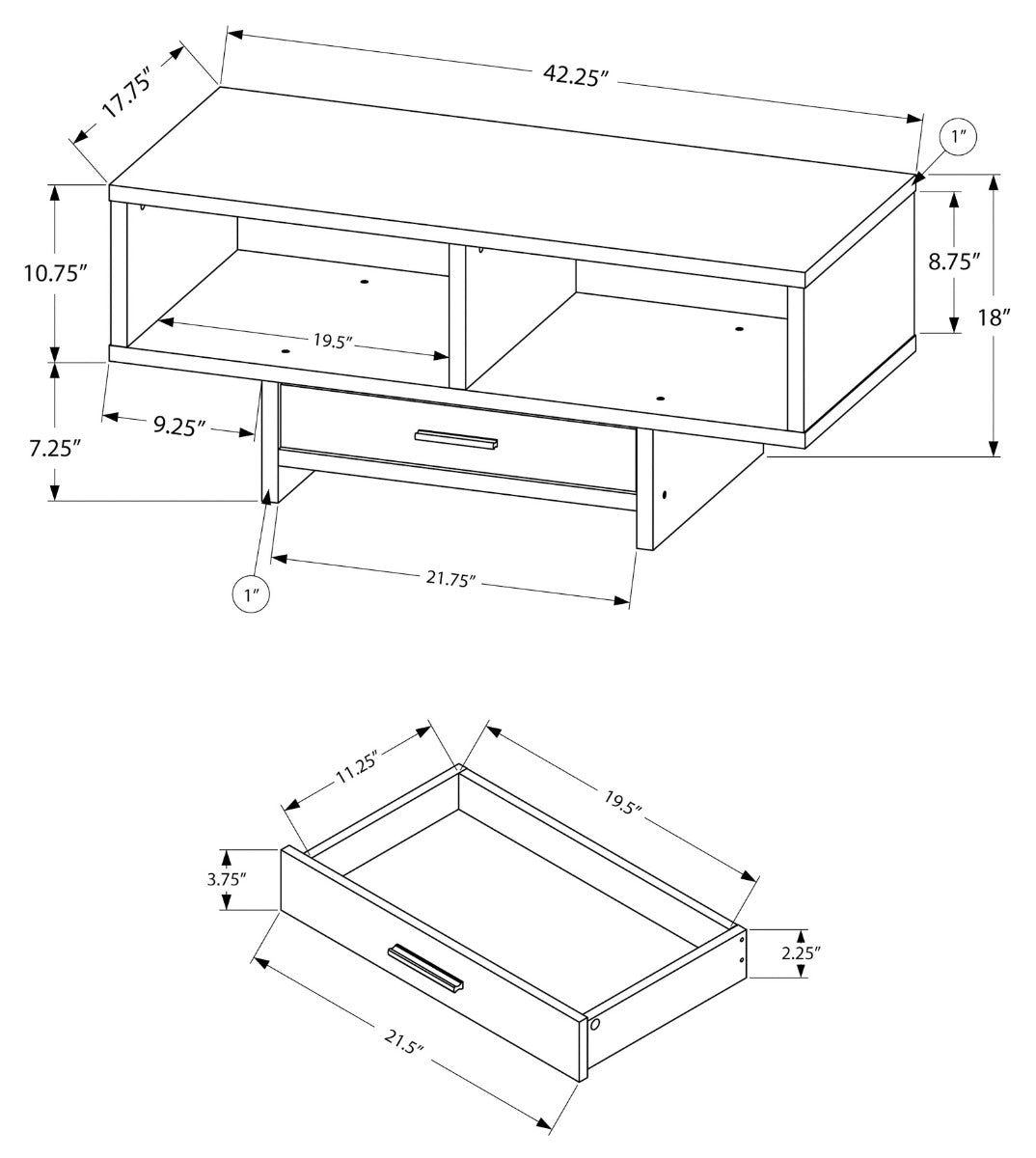 This unique, thick paneled modern style rectangular coffee table with abundant storage options, will give your living or office space that extra presence. Finished on all sides in a sleek black, it includes a warm rustic brown reclaimed wood-look contrasting drawer on smooth metal glides and accented with a black handle, keeping the clutter out of sight. The two open cubbies can be used for creative display or to store books and magazines within easy reach. The spacious and smooth table-top has ample place to set down food and drinks whether working or entertaining. Assembly is required.