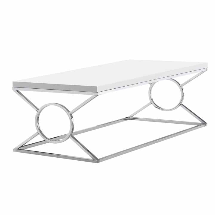 Thick and spacious glossy white table topSolid chrome metal base with distinct circle and x-leg side supports for a stylish lookContemporary design with a classic appealStatement worthy coffee table for a living room, family room, den, or office space