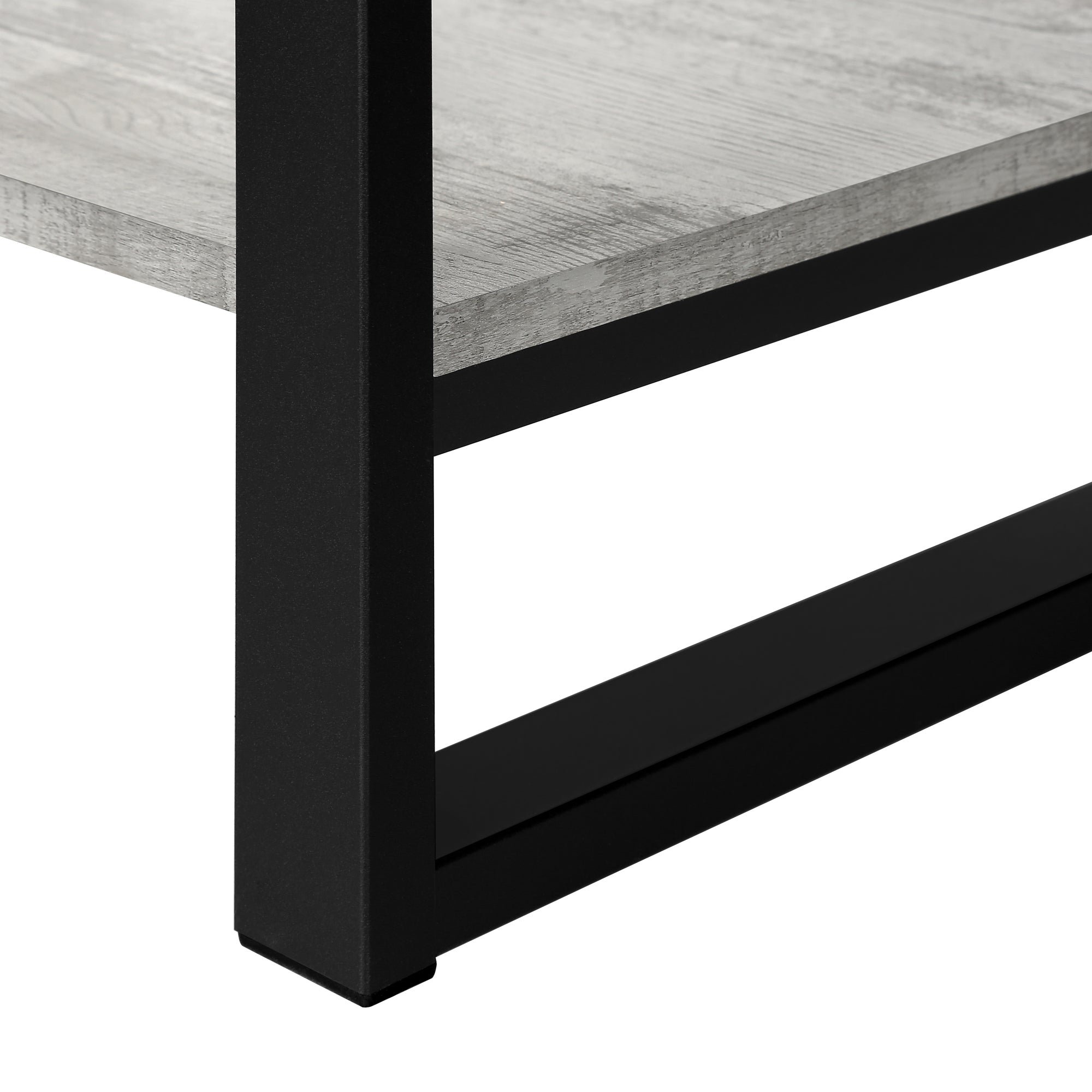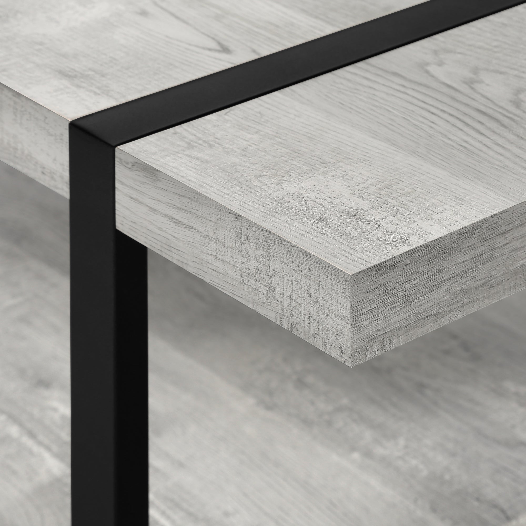 Thick, wide tabletop and smaller lower shelf in a gray reclaimed wood-look finish for a rustic appeal. Black metal legs offer a modern touch and provide stability. Assembly required: Illustrated instructions and all hardware are provided for convenience (additional tools may be needed).